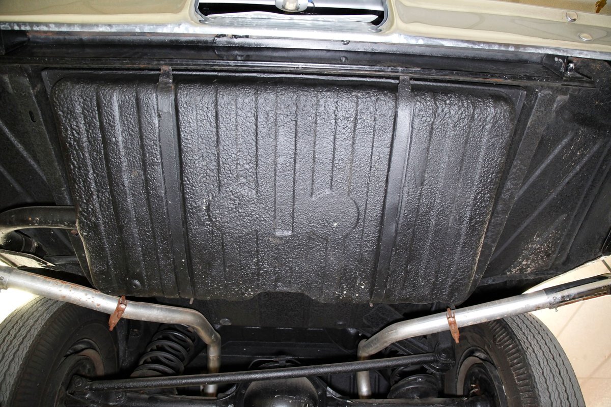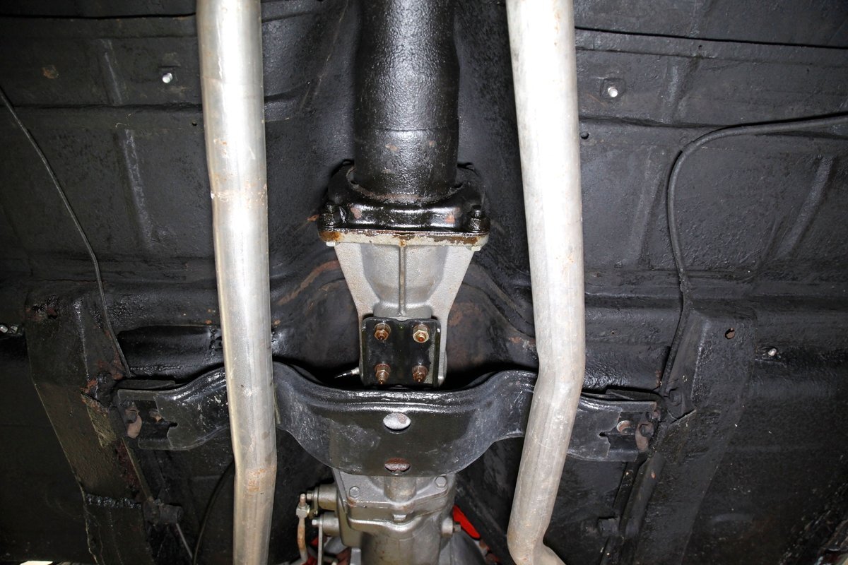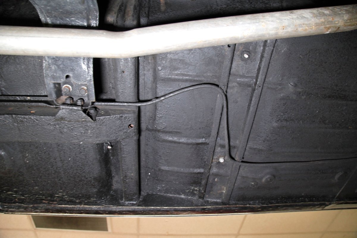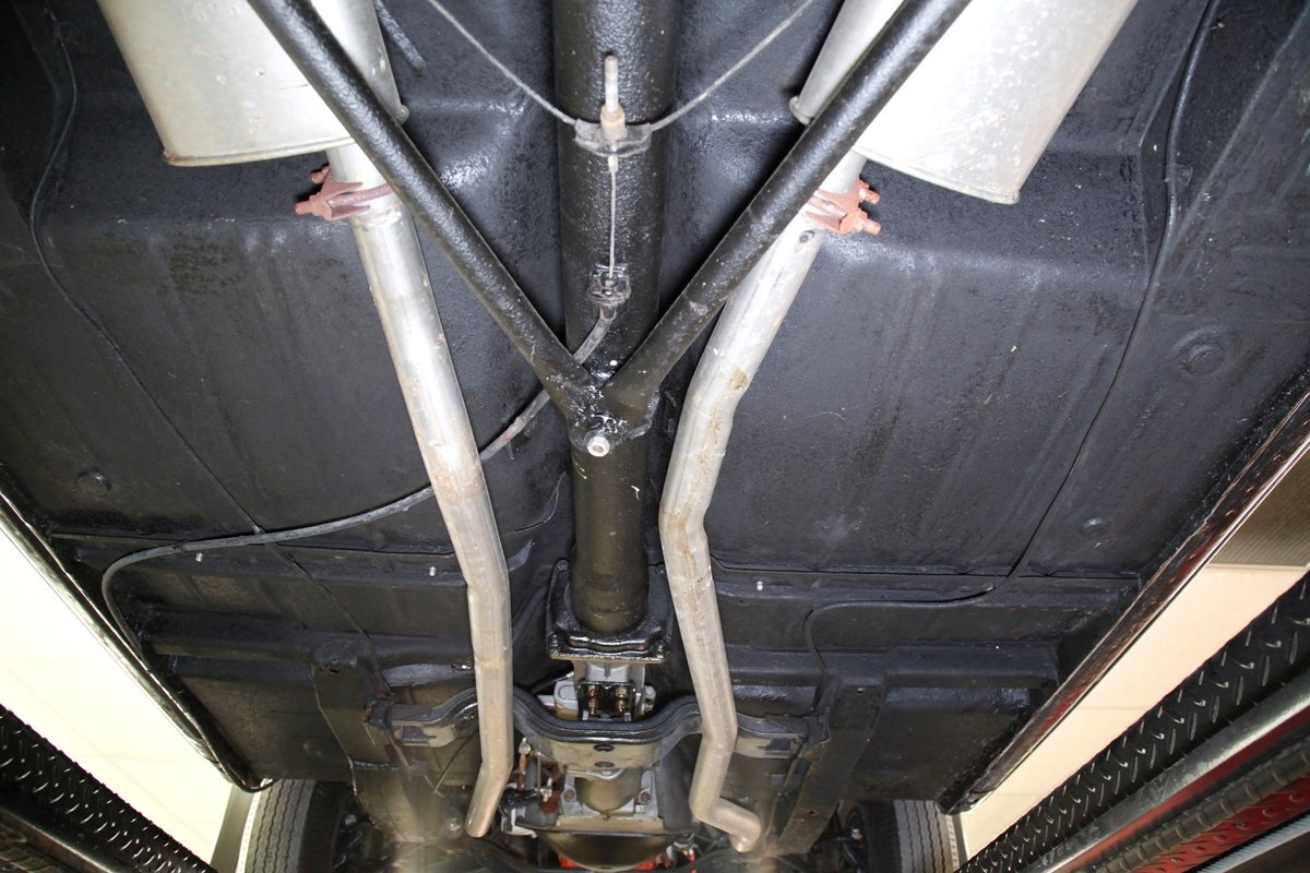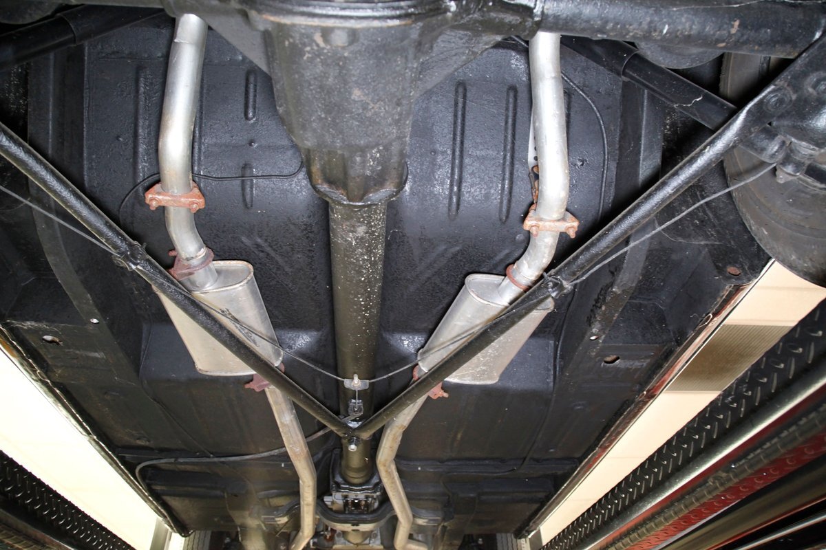 Up in the Classic Auto Mall air atop the lift, we can peruse the undercarriage, which has some patina, strong steel and is an early version of unibody construction. Structurally sound, no rust, with drum brakes all around, and the typical independent coil spring suspension upfront, and a swing arm with coil spring designation on the rear. Dual exhaust is on with Turbo style mufflers and looking good.