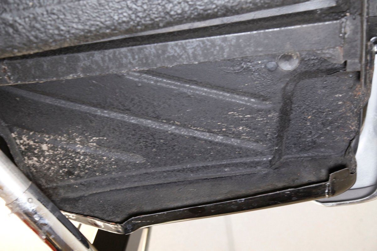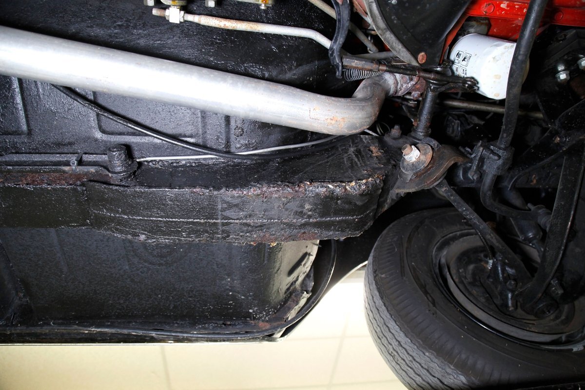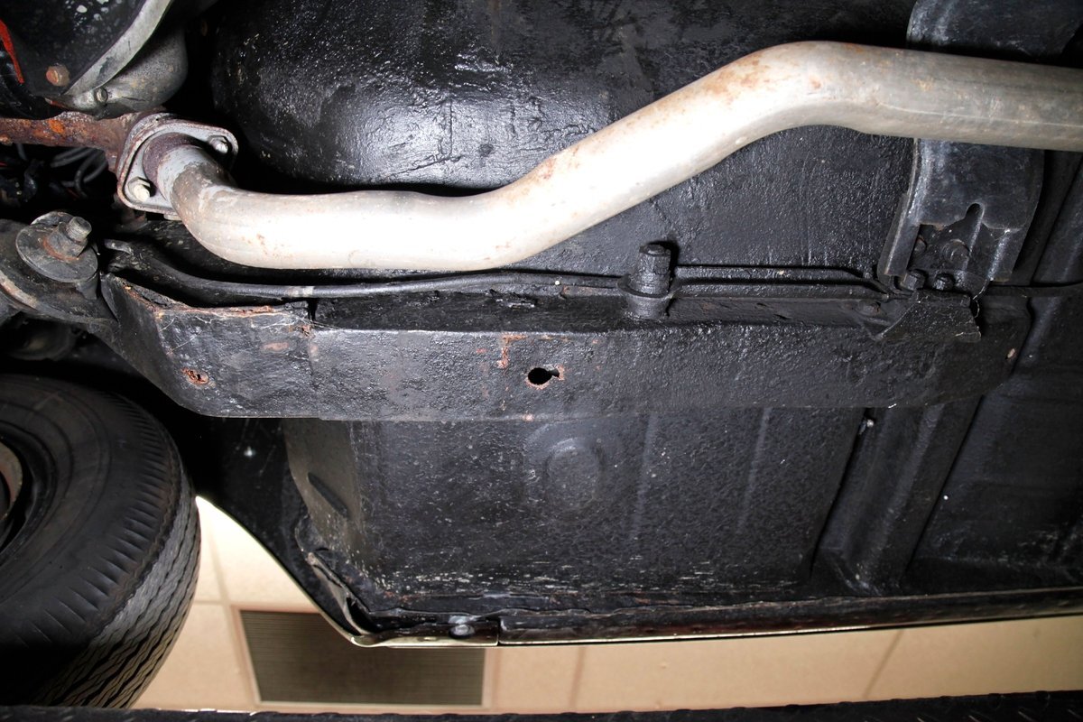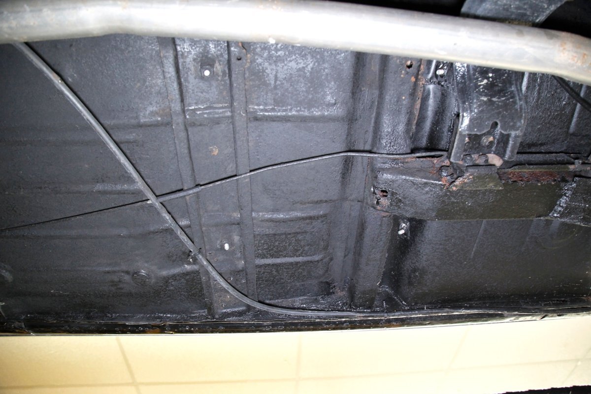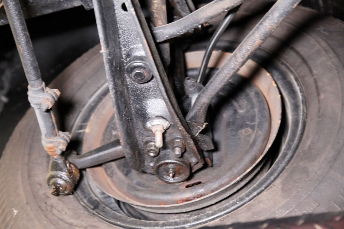 Up in the Classic Auto Mall air atop the lift, we can peruse the undercarriage, which has some patina, strong steel and is an early version of unibody construction. Structurally sound, no rust, with drum brakes all around, and the typical independent coil spring suspension upfront, and a swing arm with coil spring designation on the rear. Dual exhaust is on with Turbo style mufflers and looking good.