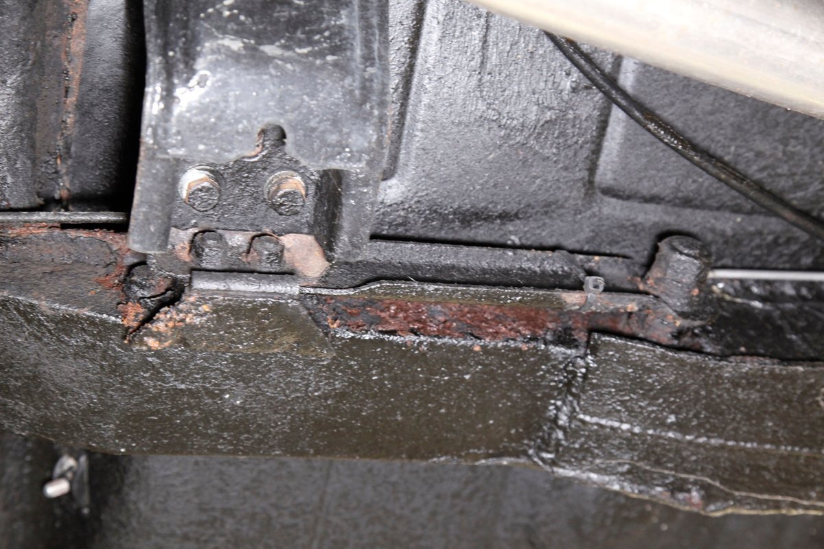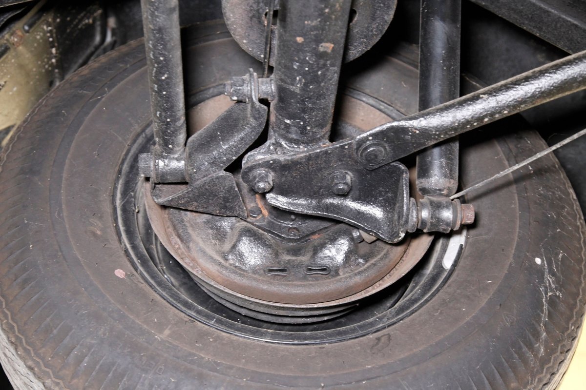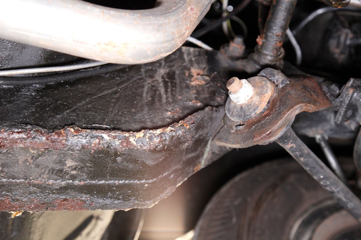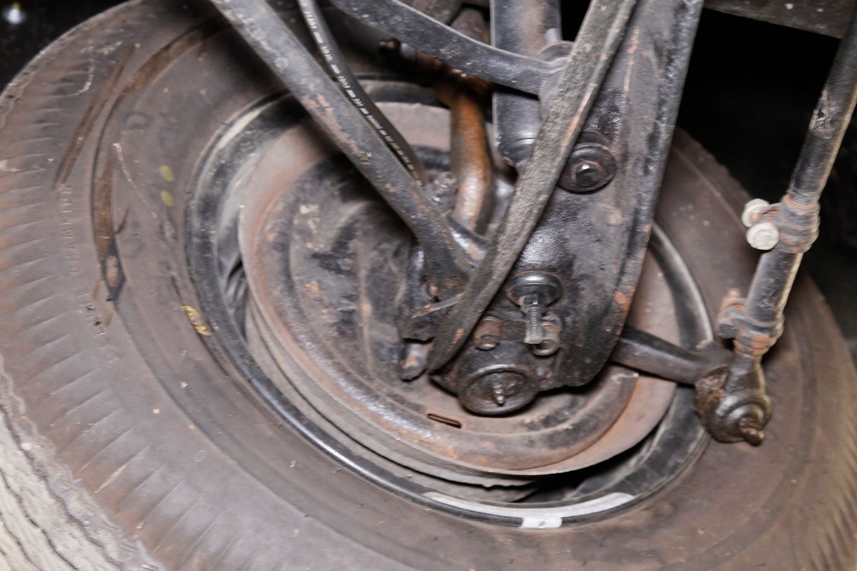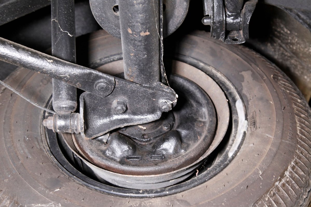 Up in the Classic Auto Mall air atop the lift, we can peruse the undercarriage, which has some patina, strong steel and is an early version of unibody construction. Structurally sound, no rust, with drum brakes all around, and the typical independent coil spring suspension upfront, and a swing arm with coil spring designation on the rear. Dual exhaust is on with Turbo style mufflers and looking good.