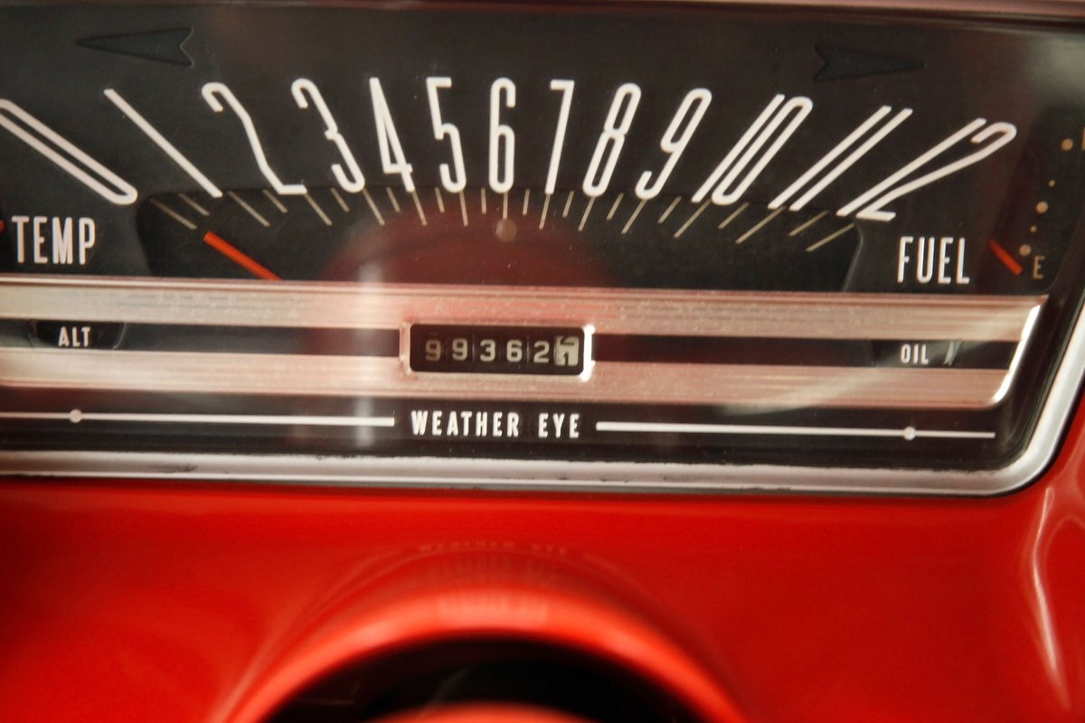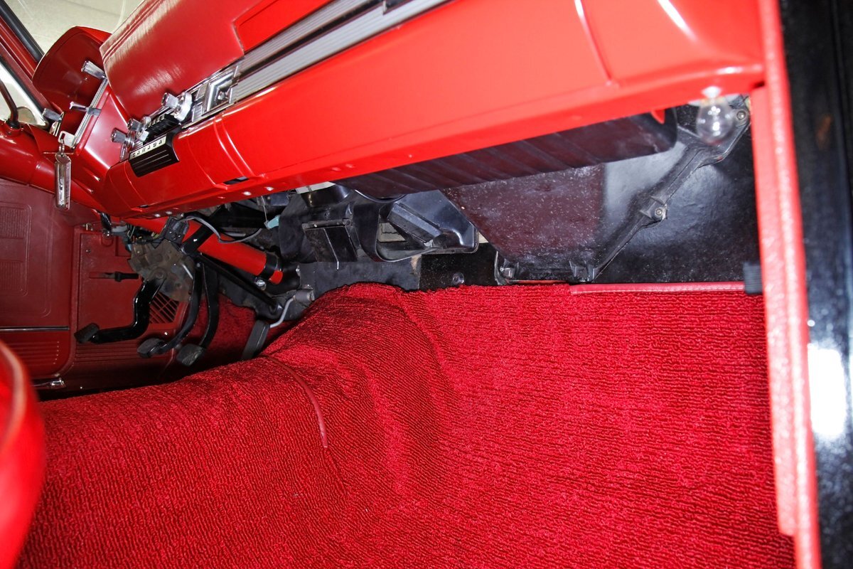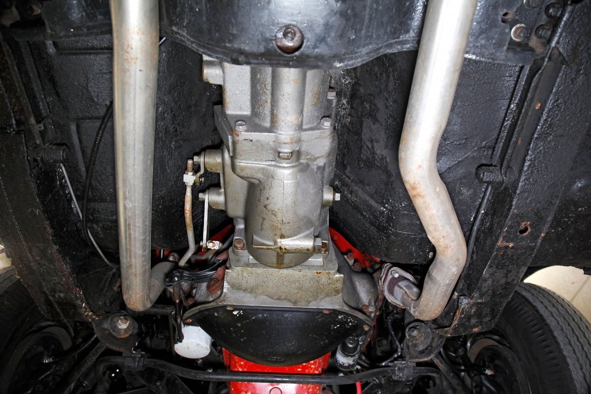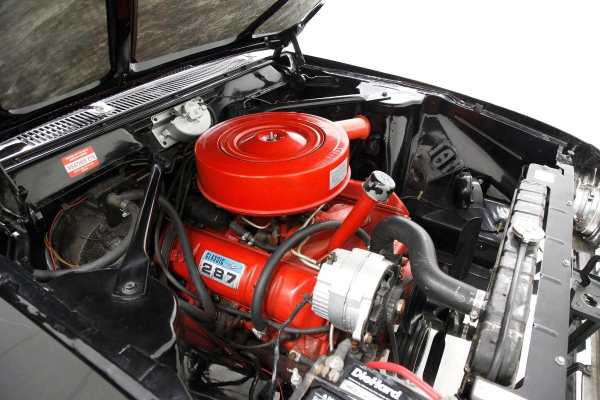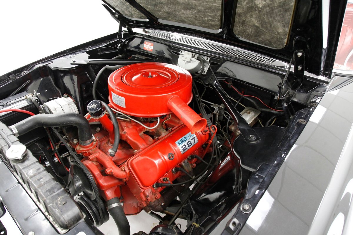 A 287ci V8 is within the simple wide-open engine bay. This engine is bathed in red along with the air cleaner and valve coverings. It is topped with a 2-barrel carburetor and has a Borg Warner T-86E 3-speed manual transmission bolted to the back which is shifted by a stalk on the steering column. The rear axle is a 3.54 ratio.