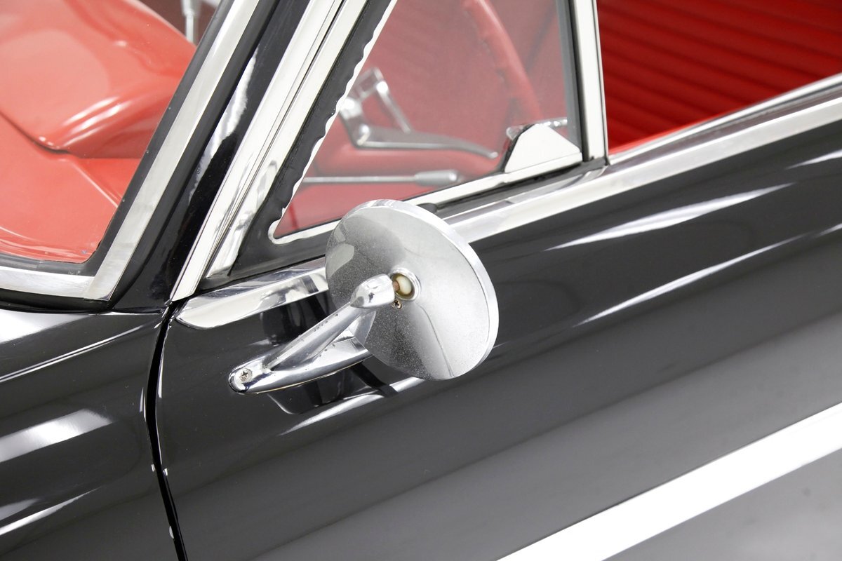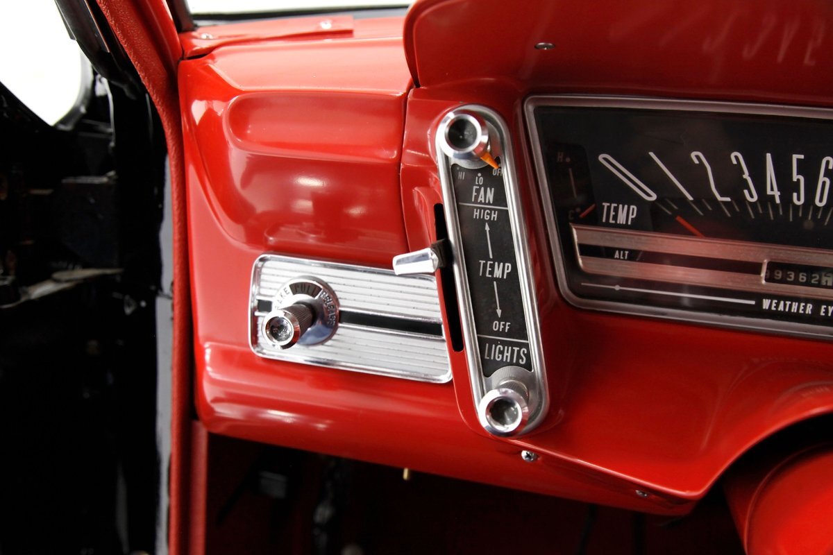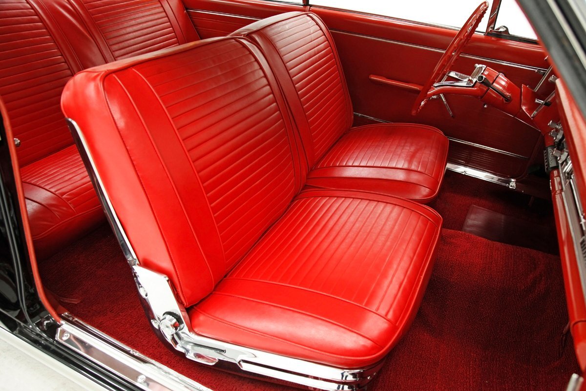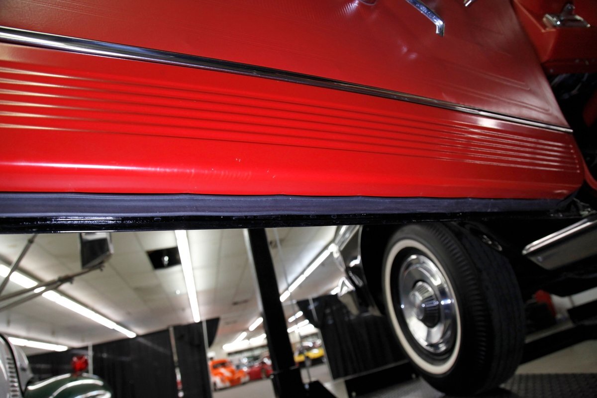 A 287ci V8 is within the simple wide-open engine bay. This engine is bathed in red along with the air cleaner and valve coverings. It is topped with a 2-barrel carburetor and has a Borg Warner T-86E 3-speed manual transmission bolted to the back which is shifted by a stalk on the steering column. The rear axle is a 3.54 ratio.