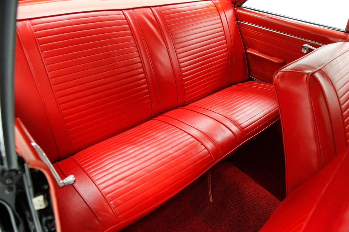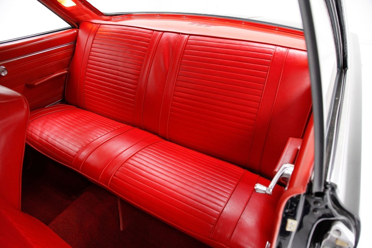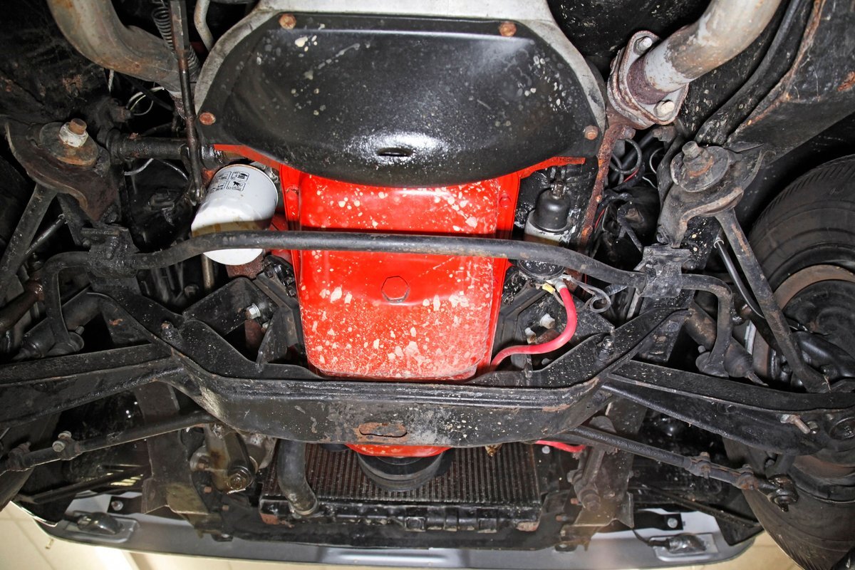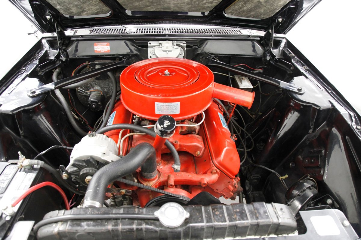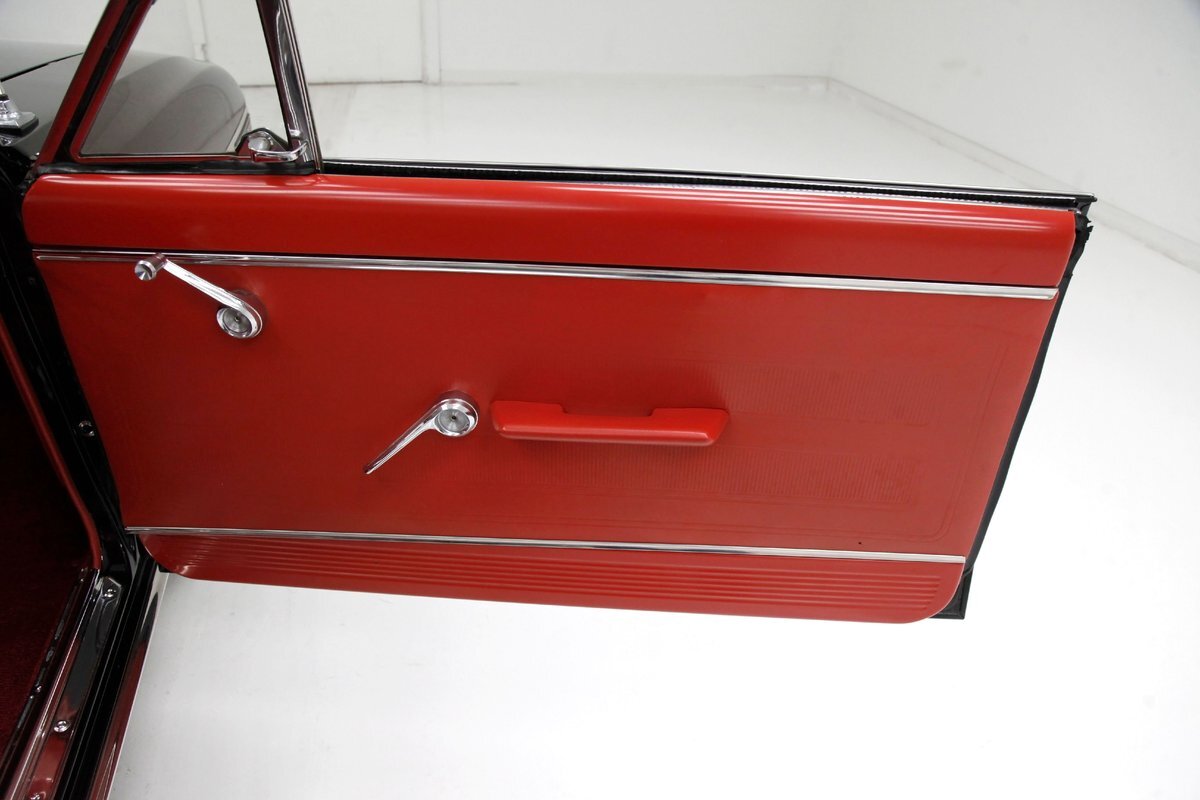 A 287ci V8 is within the simple wide-open engine bay. This engine is bathed in red along with the air cleaner and valve coverings. It is topped with a 2-barrel carburetor and has a Borg Warner T-86E 3-speed manual transmission bolted to the back which is shifted by a stalk on the steering column. The rear axle is a 3.54 ratio.