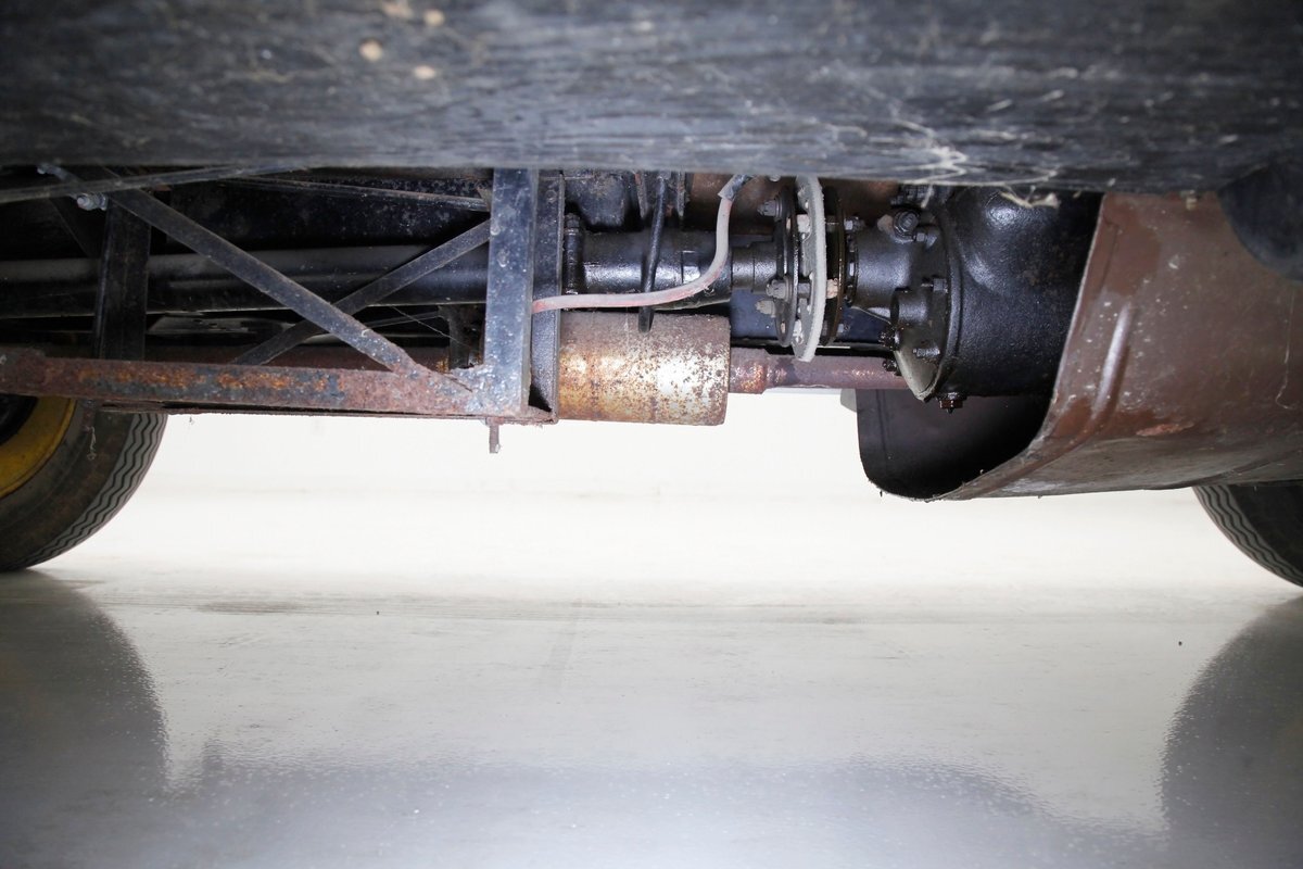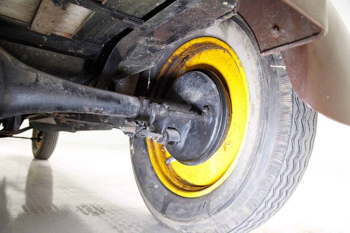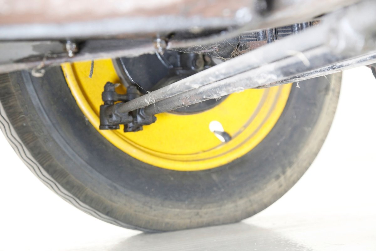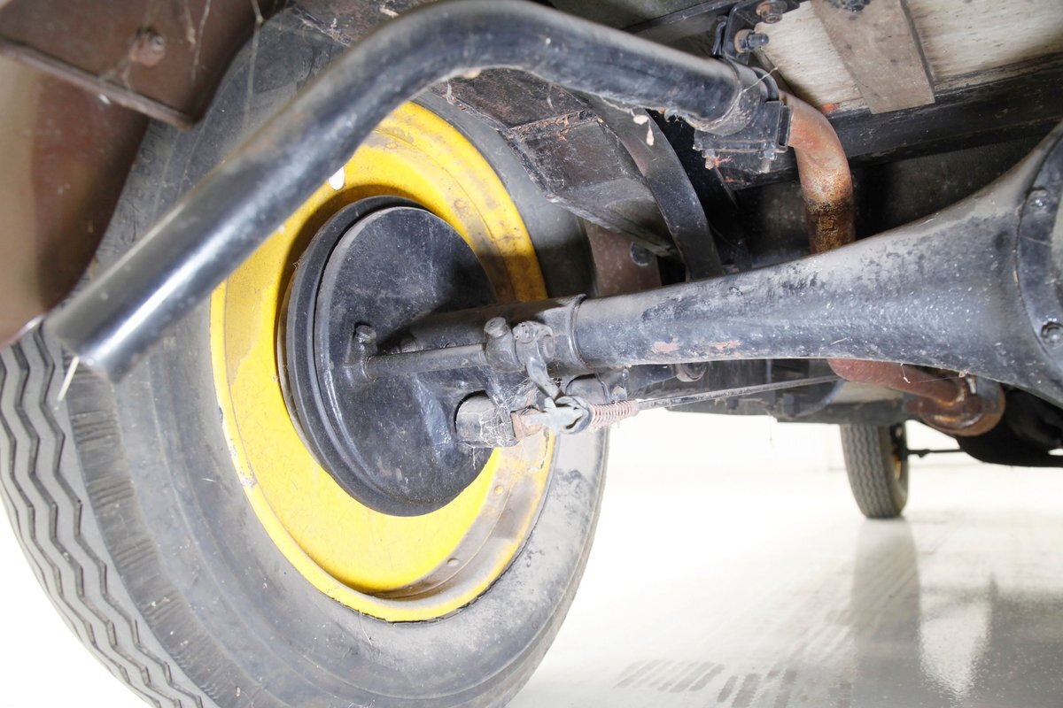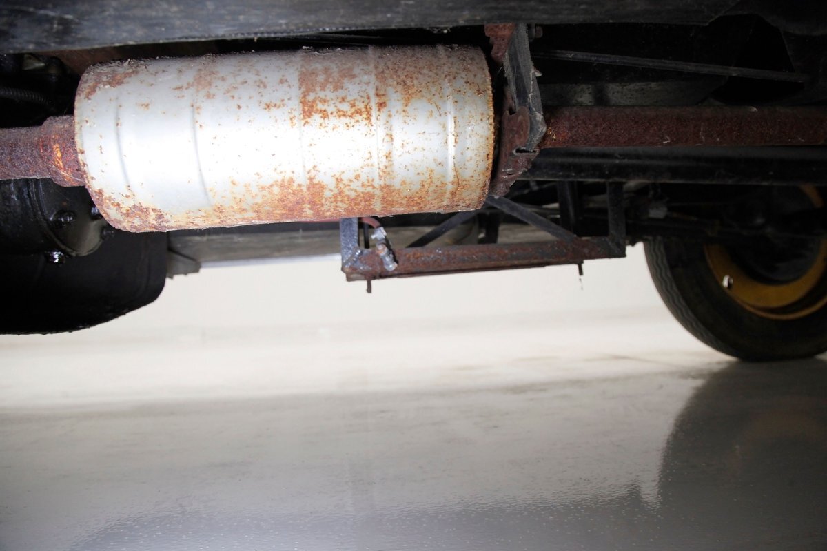 Again, no real rust to speak of, just a bit of surface rust on the muffler and exhaust piping. All else is straight black painted steel for the frame structure and leaf springs for the front, as well as quarter elliptical leaf springs for the back. Mechanical drum braking is on all 4 corners.