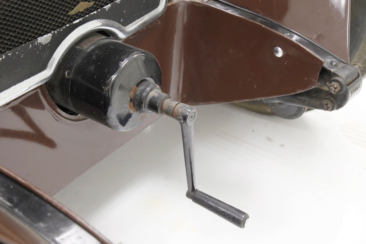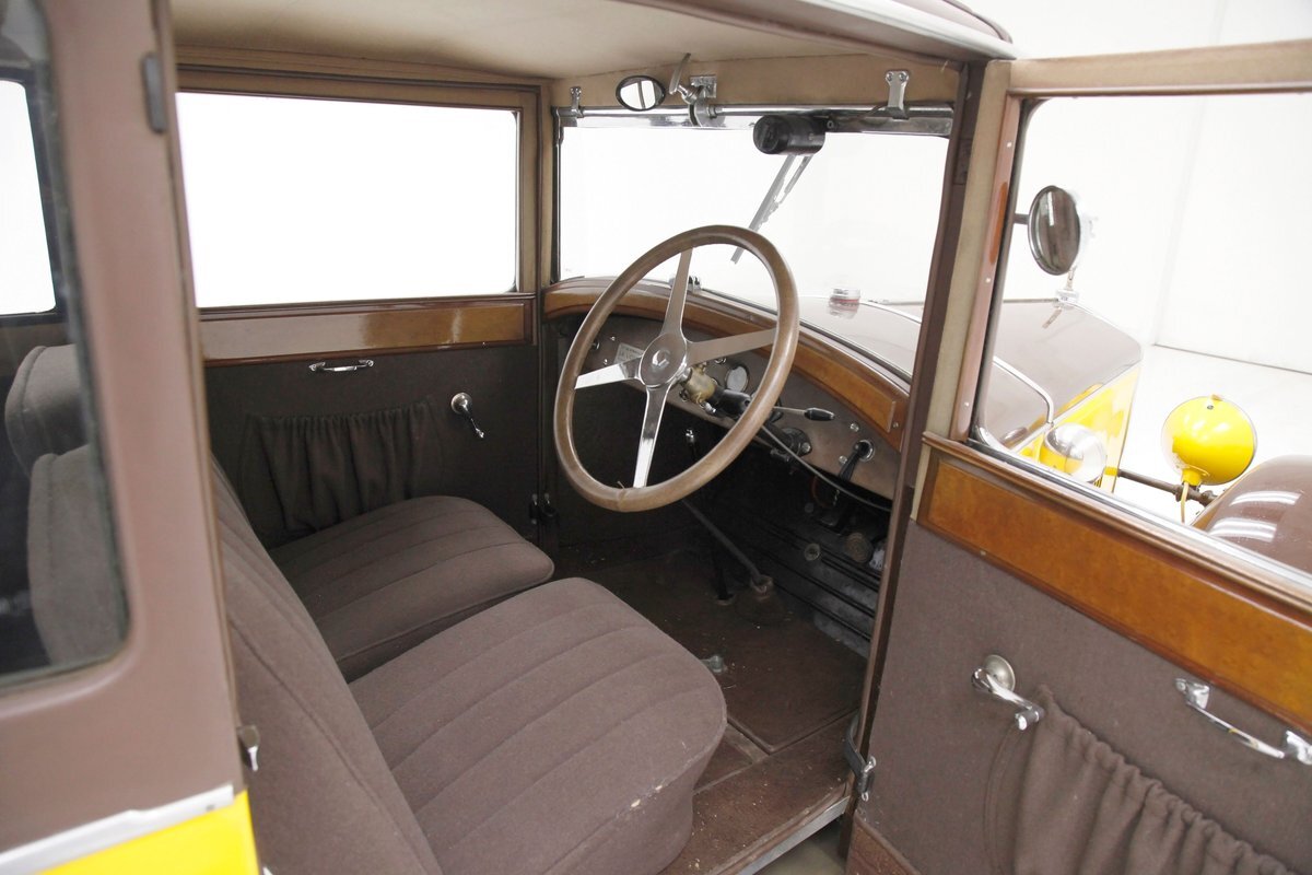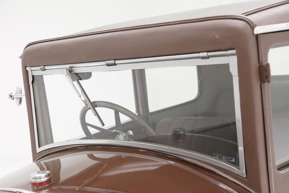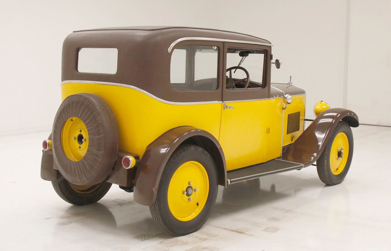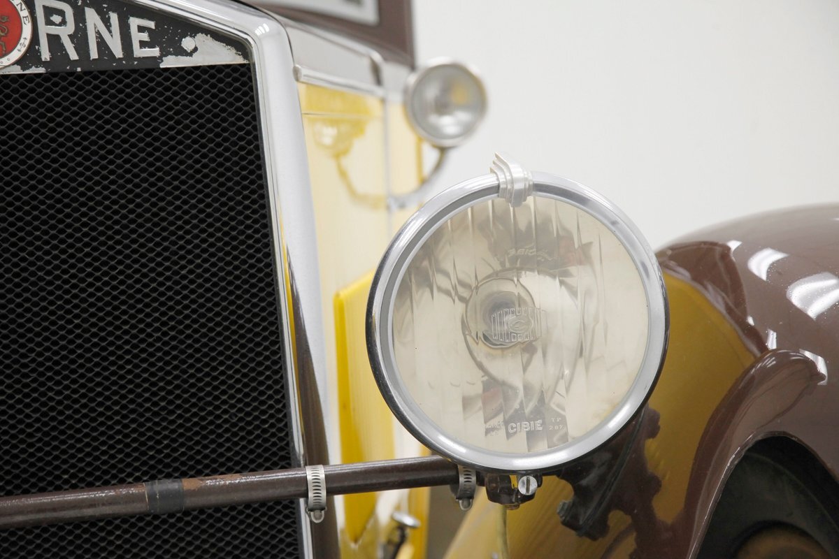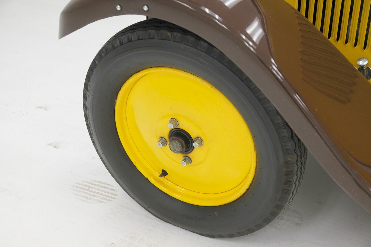 Looking the part of all automobiles of the day, it leads the way with a chromed radiator surround and circular headlights all shiny and nice. A cowled hood has brown on top and yellow for the sides. Curved fenders and a running board are attached and present in brown. 18-inch artillery wheels in contrasting yellow are on and looking in good condition. A 2 door version of the salon, all glass and surrounding trimmings are shiny and bright. This car is a right hand driver and to aid in the view, mirrors are attached to either side just prior to the firewall which is brown. The passenger compartment is covered in brown as are all the uppers of the car. A nicely curved line delineates the top from the bottom pan back and a spare tire is hanging off the bumper less rear of the car. No rust seen on this French steel femme.