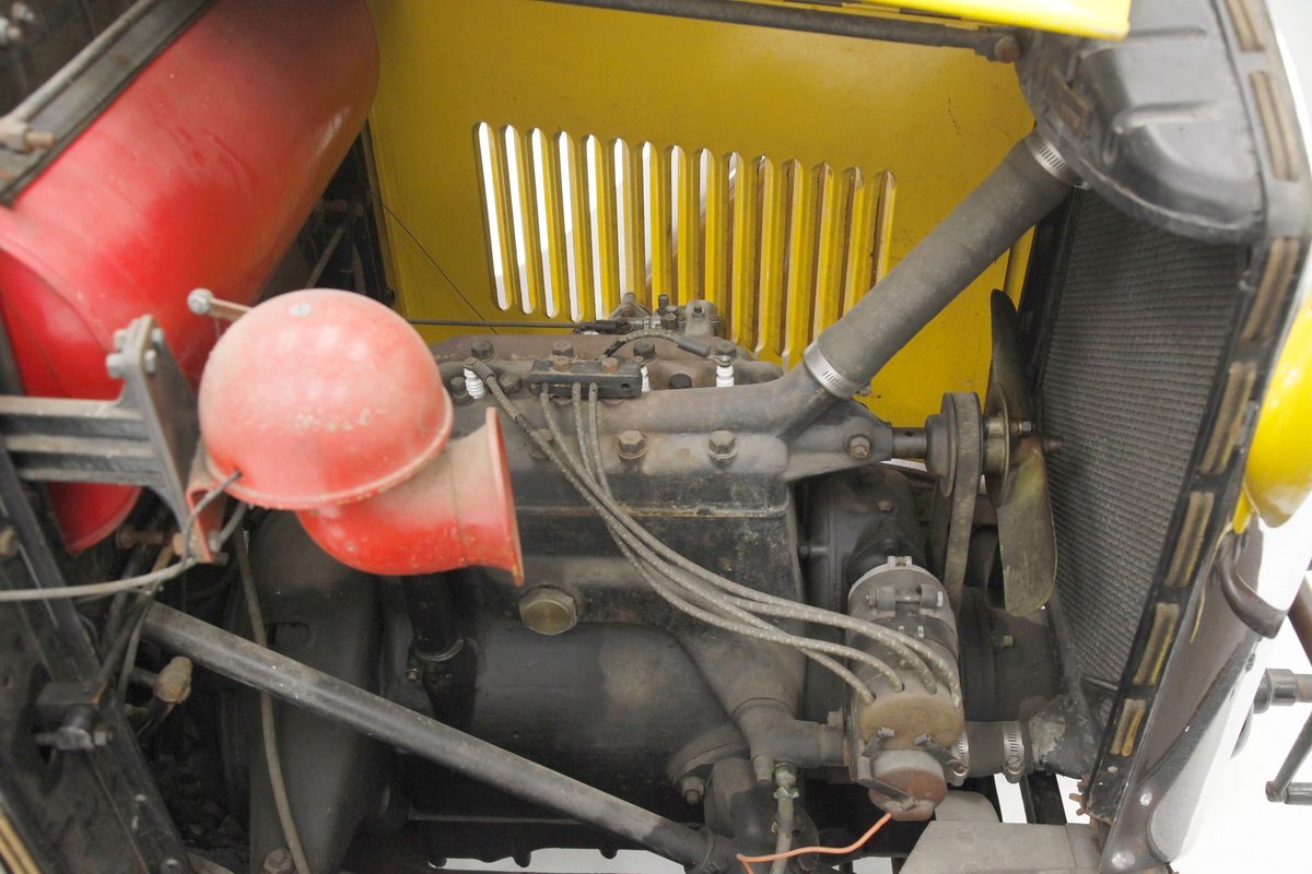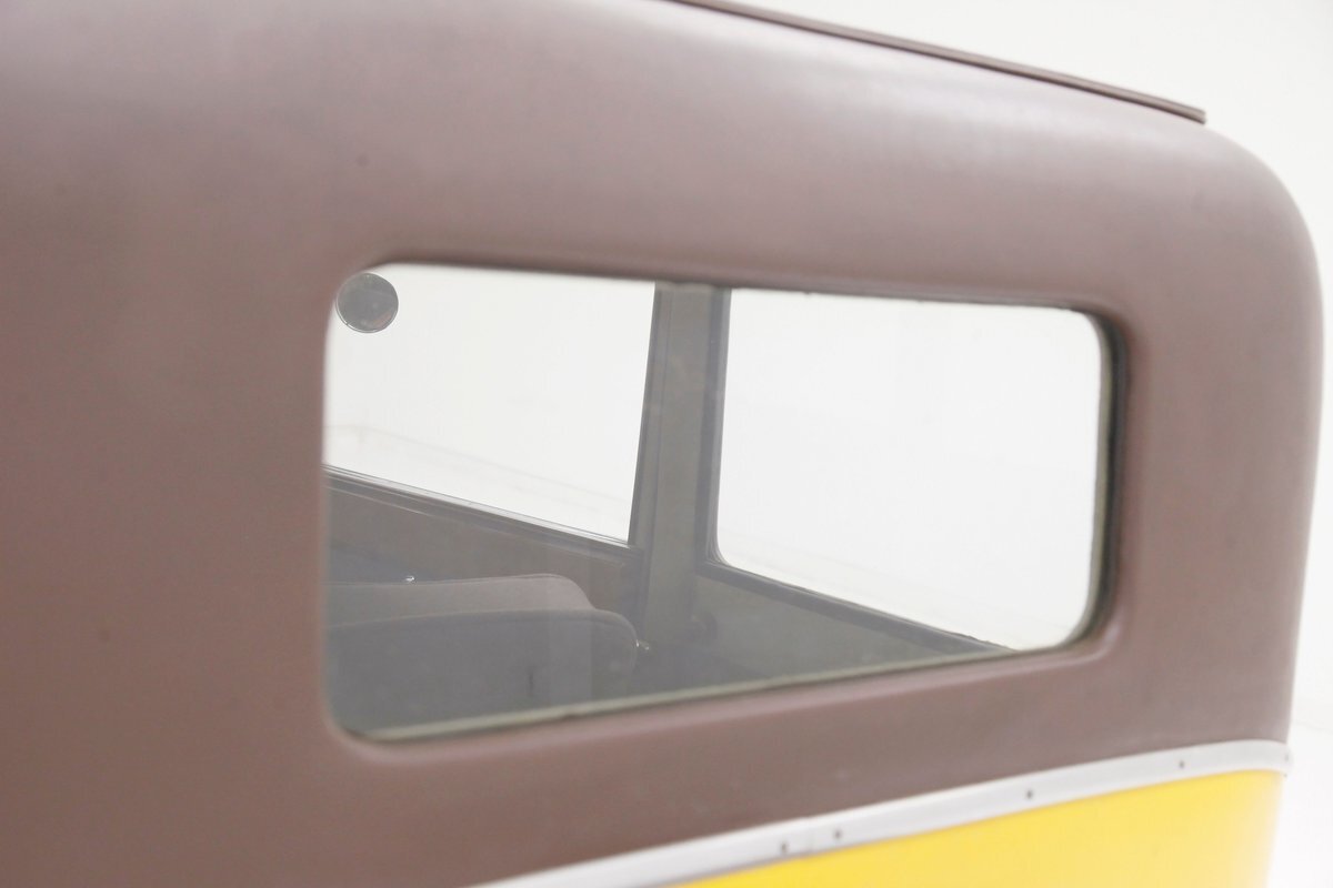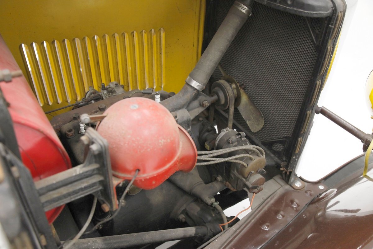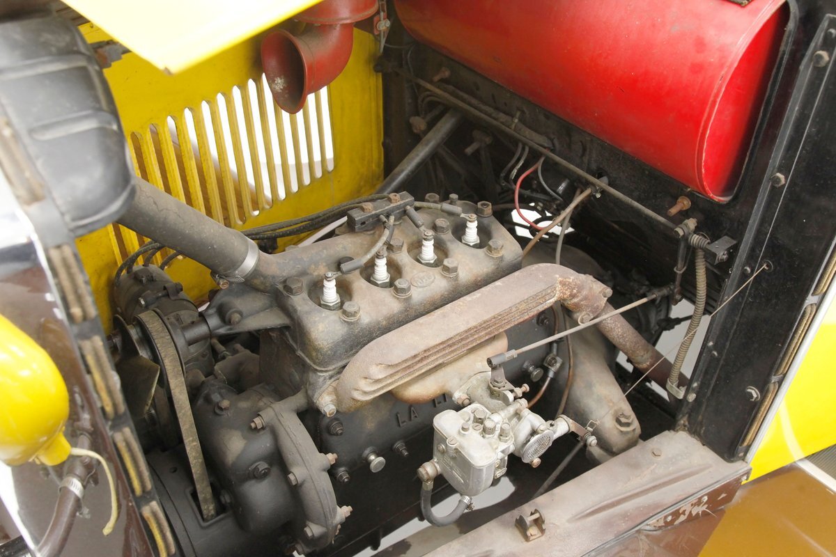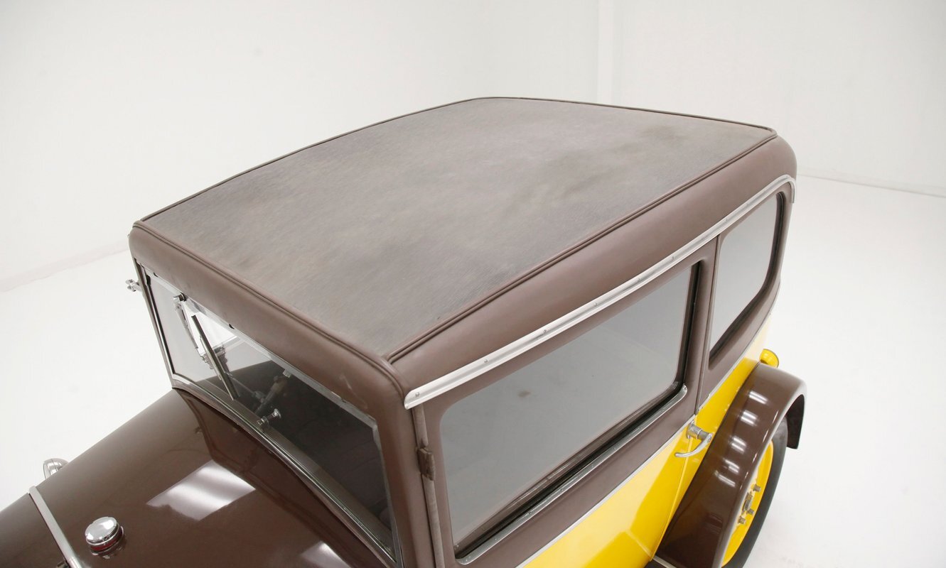 Looking the part of all automobiles of the day, it leads the way with a chromed radiator surround and circular headlights all shiny and nice. A cowled hood has brown on top and yellow for the sides. Curved fenders and a running board are attached and present in brown. 18-inch artillery wheels in contrasting yellow are on and looking in good condition. A 2 door version of the salon, all glass and surrounding trimmings are shiny and bright. This car is a right hand driver and to aid in the view, mirrors are attached to either side just prior to the firewall which is brown. The passenger compartment is covered in brown as are all the uppers of the car. A nicely curved line delineates the top from the bottom pan back and a spare tire is hanging off the bumper less rear of the car. No rust seen on this French steel femme.
