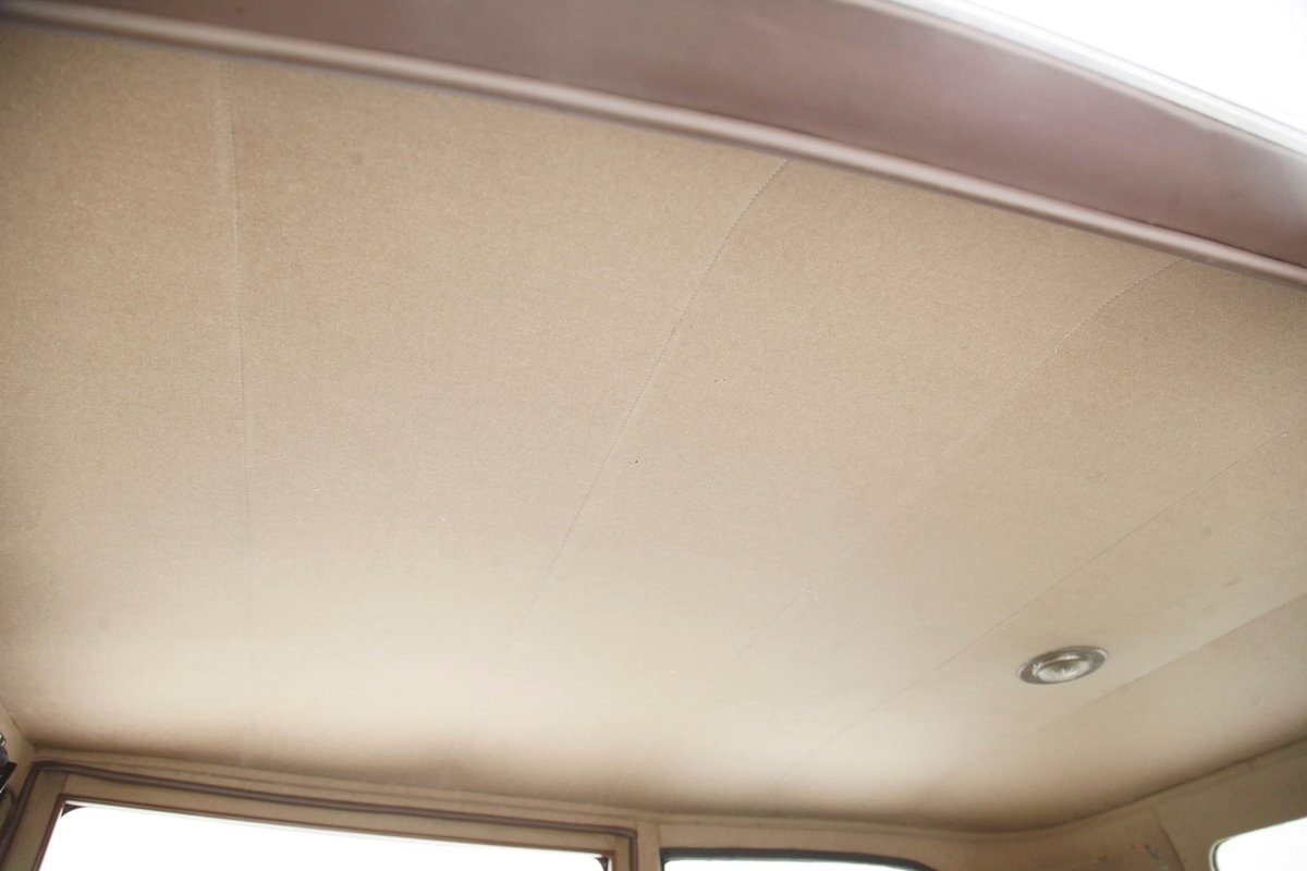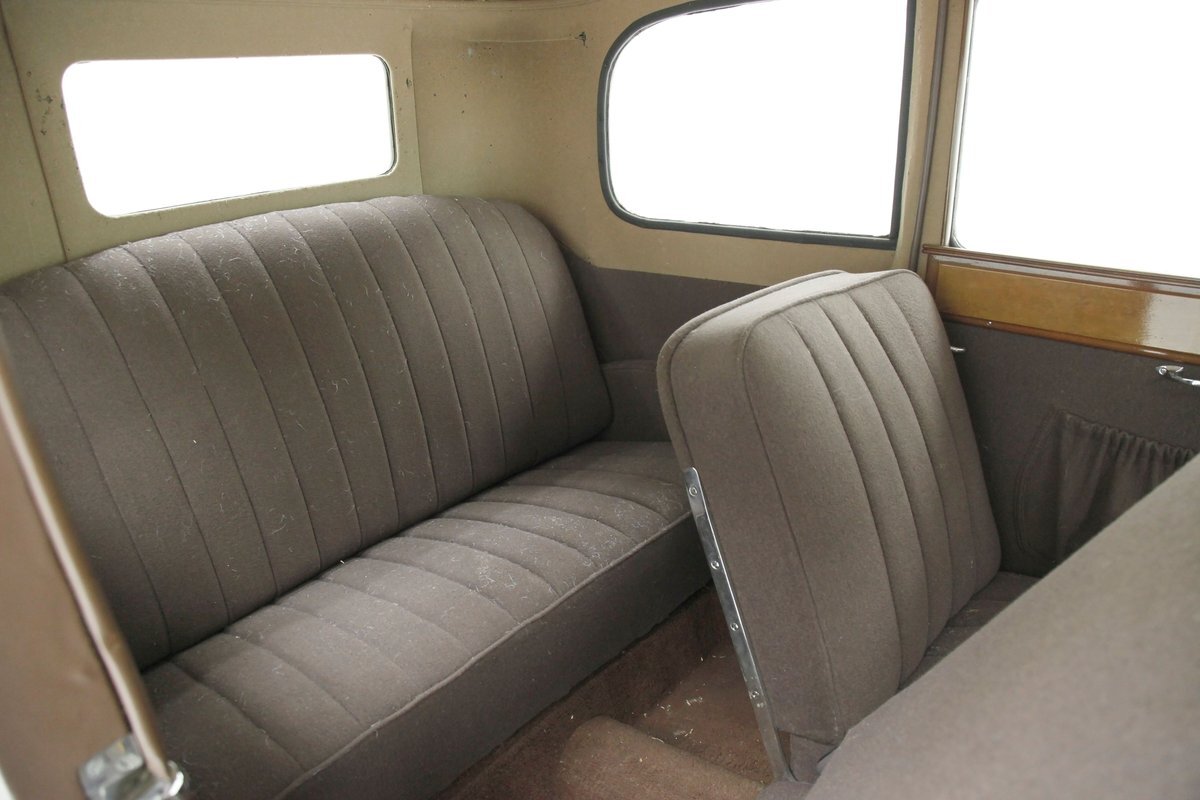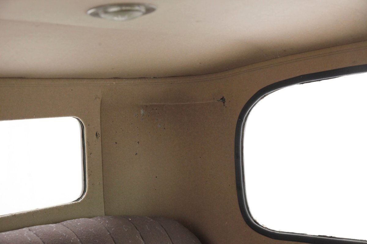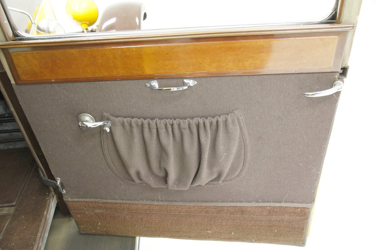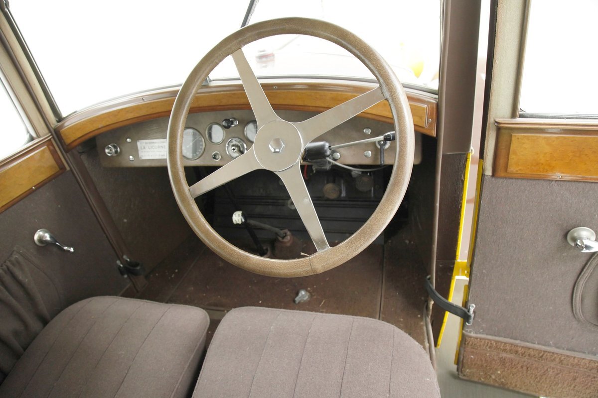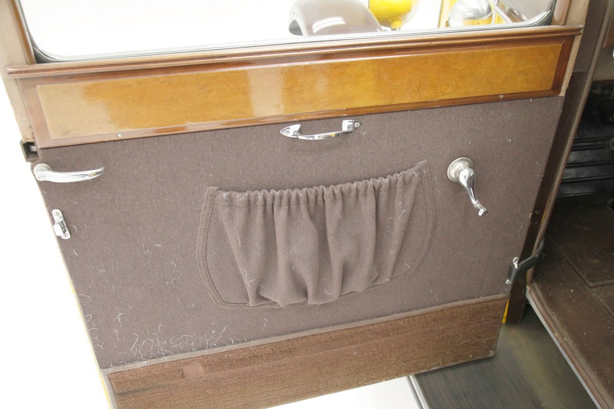 Also fully restored we see nicely covered and straight tight door panels in brown broadcloth. Upfront, the seats are squared off buckets with tuck and roll pattern in brown broadcloth. These have chromed metal edging for the hinges and backs. In the back is a long bench stretching from side to side. Meanwhile, the carpeting is another shade of brown and nicely preserved and like new. Sides and headliner are in a cream broadcloth and all nice and tight and not stained. A curved wood dash top is above a leather covered dash front in a shiny brown which is semi-metallic finished. A wood rimmed steering wheel fronts the dash and delicate gauges in French are seen with patina bezels. A few knobs and pulls in silver are also installed to perform various functions. All looking great for this French designed and inspired interior.