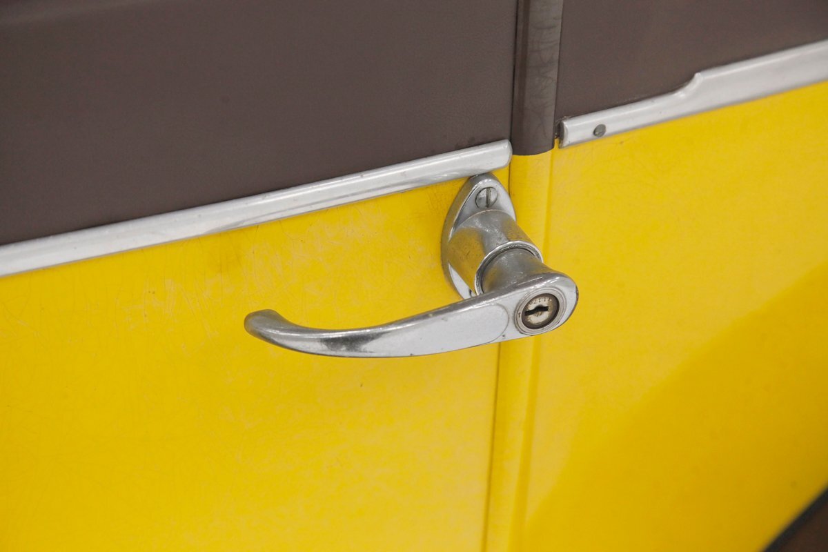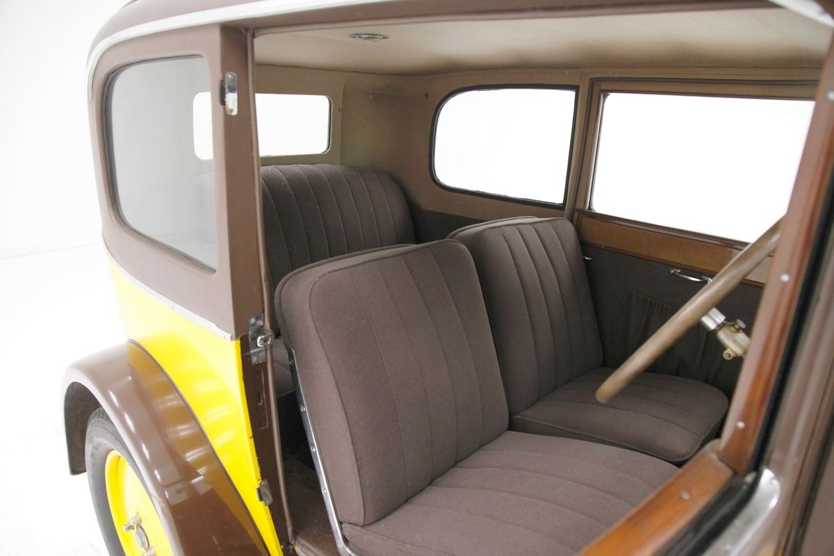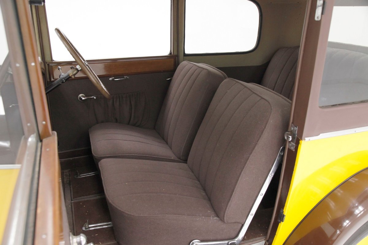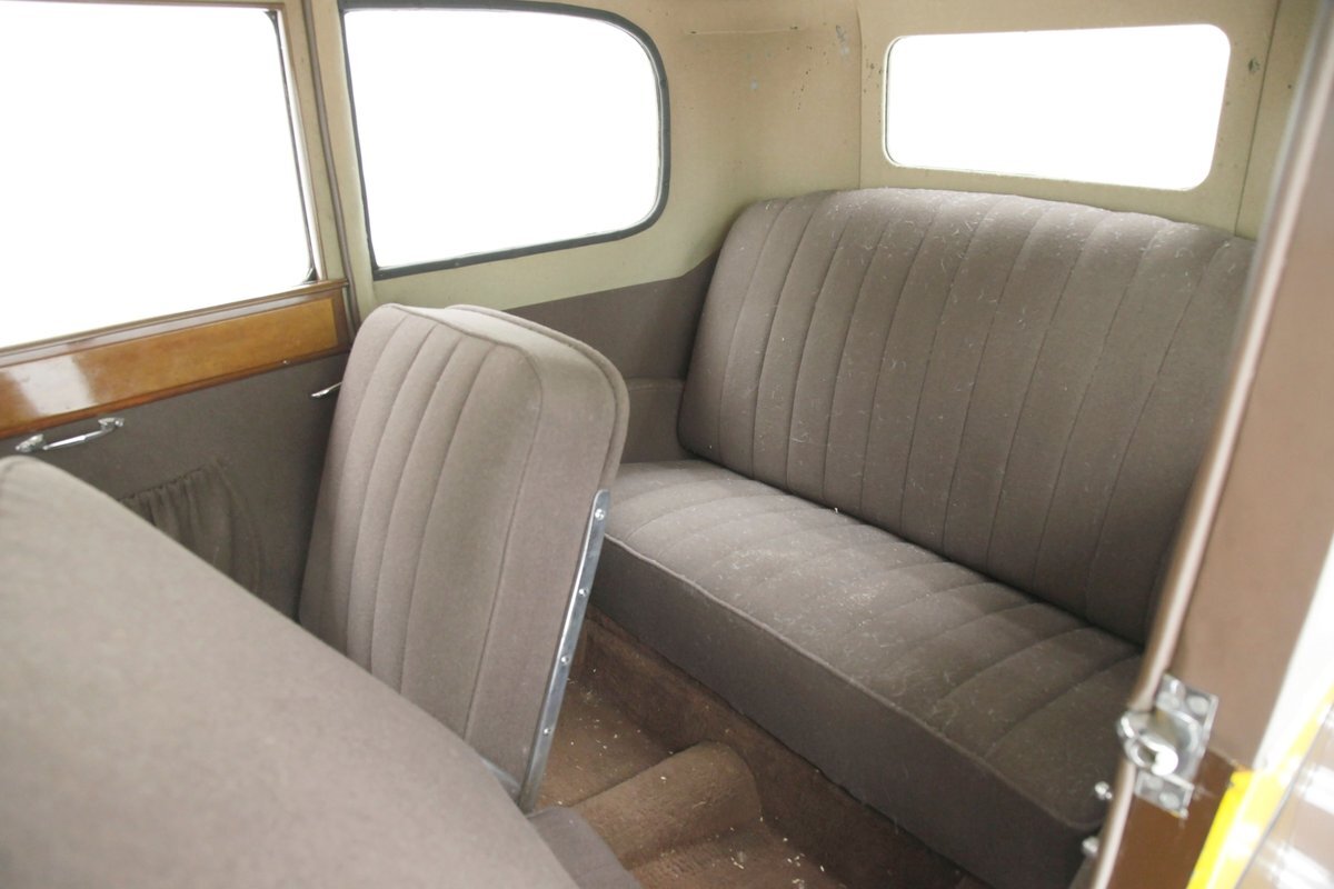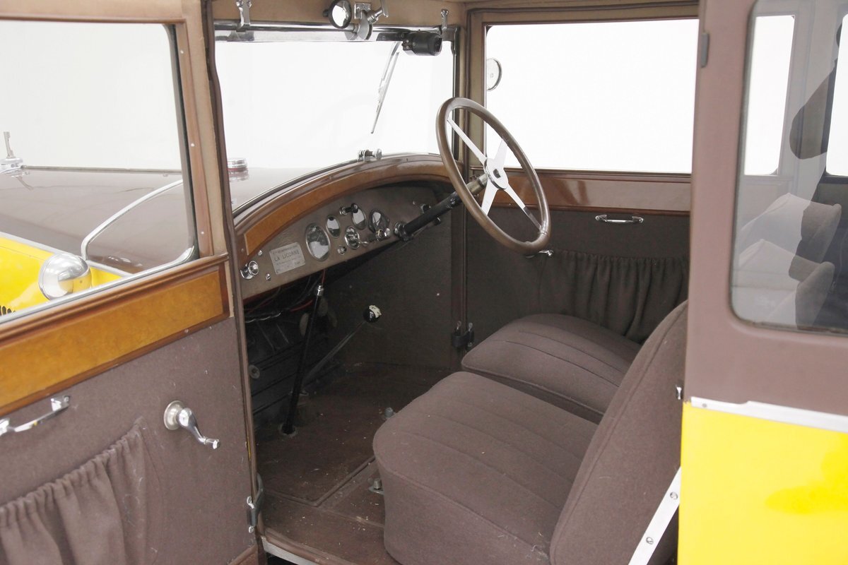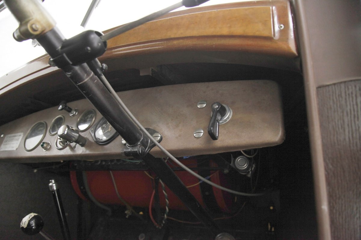 Also fully restored we see nicely covered and straight tight door panels in brown broadcloth. Upfront, the seats are squared off buckets with tuck and roll pattern in brown broadcloth. These have chromed metal edging for the hinges and backs. In the back is a long bench stretching from side to side. Meanwhile, the carpeting is another shade of brown and nicely preserved and like new. Sides and headliner are in a cream broadcloth and all nice and tight and not stained. A curved wood dash top is above a leather covered dash front in a shiny brown which is semi-metallic finished. A wood rimmed steering wheel fronts the dash and delicate gauges in French are seen with patina bezels. A few knobs and pulls in silver are also installed to perform various functions. All looking great for this French designed and inspired interior.
