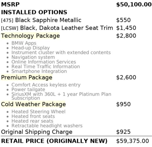 FACTORY-INSTALLED OPTIONS[475] Black Sapphire Metallic ($550)[LCSW] Black, Dakota Leather Seat Trim ($1,450)Technology Package ($2,800)BMW AppsHead-up DisplayInstrument cluster with extended contentsNavigation SystemOnline Information ServicesReal-Time Traffic InformationSmartphone IntegrationPremium Package ($2,600)Comfort Access Keyless EntryPower TailgateSiriusXMCold Weather Package ($950)Heated Steering WheelHeated Front seatsHeated Rear seatsRetractable headlight washersTotal Factory-Installed Options: $8,350