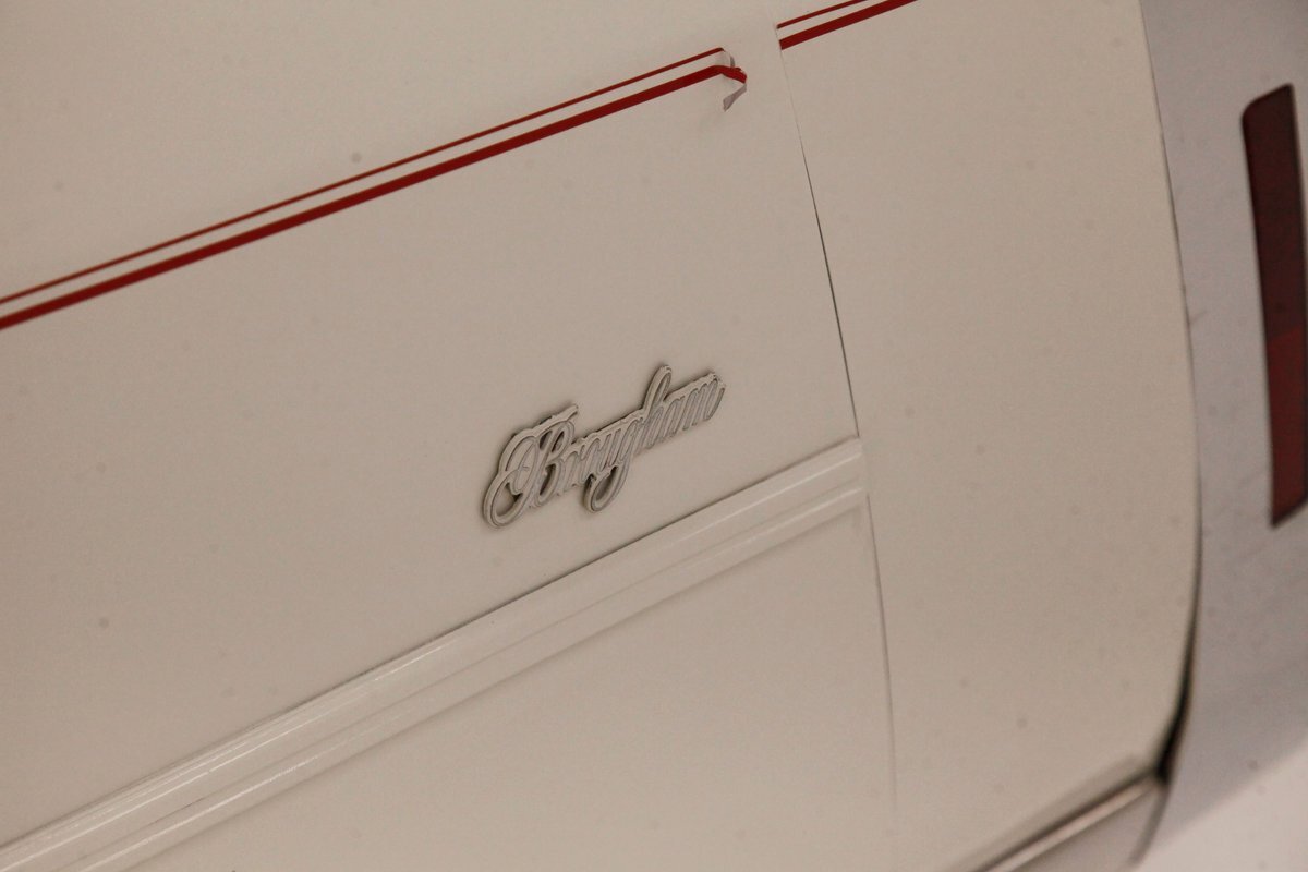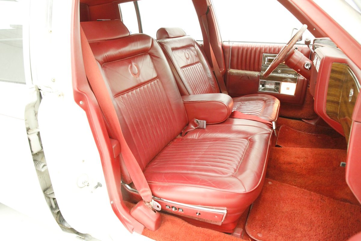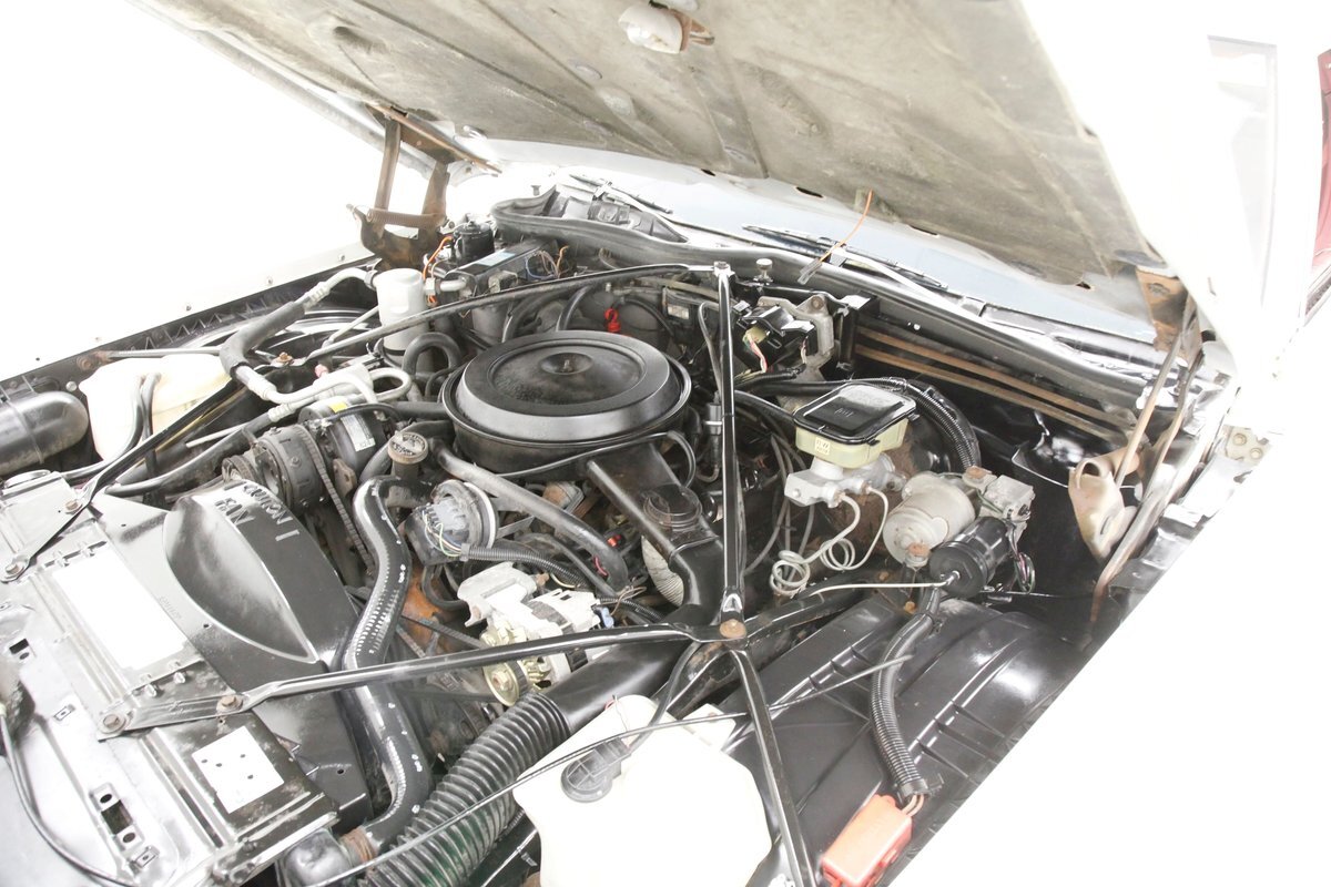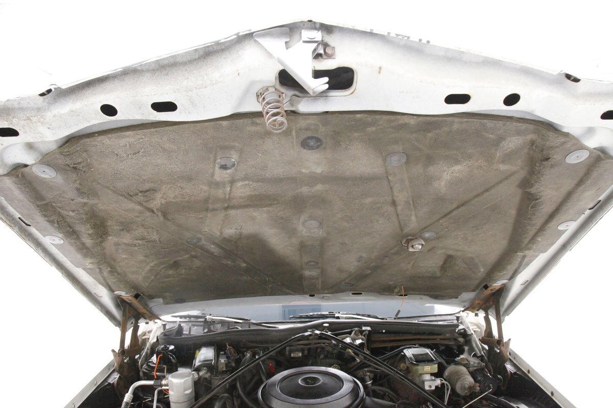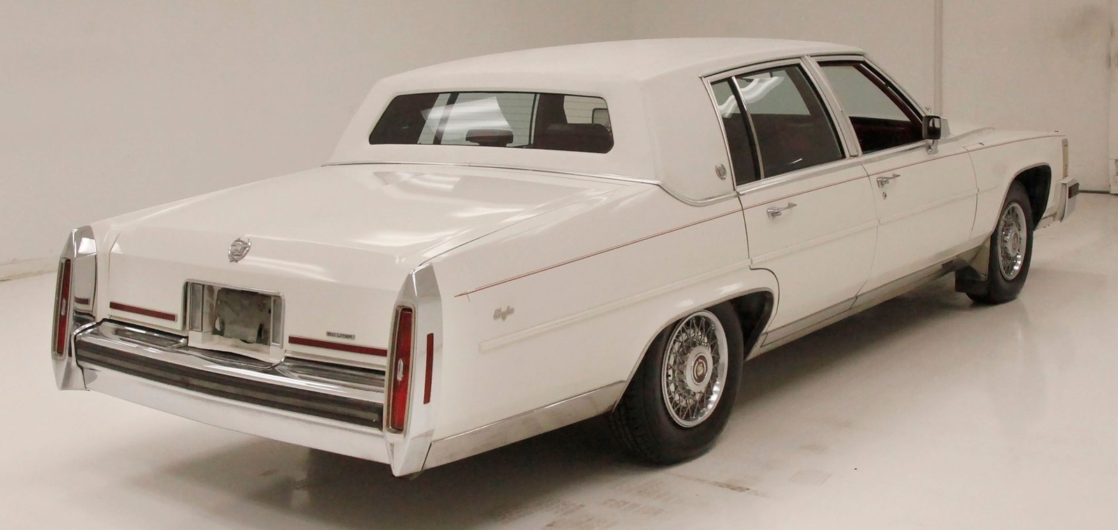 The gold faded to silver wreathed, cloisonne center crowned badge leads the way on top of the V style egg crate chromed grille which is flanked by some serious spare and rectangle design in the form of dual headlights. Just below the horizontal turn signals with a winged crown crest adhered to them, wrap around the front quarters, where they have some running lights just above them. Below all this late 80's menagerie is a clean chromed bumper with some rubber strips inserted. A large stainless rocker covering takes over up front of the wheel well and works its way to the rear of the car. This is a 4-door luxury sedan and for the gaps of this we note they are all well minded. On the roof is a new padded vinyl top in white just like the rest of the exterior. The three bedroom size trunk lid is framed on either side by vertical big bezeled taillights and more caddy crests in their centers. A shiny rear bumper is below, and I can see no problems visually with this rear framer. Faded gold leafed crown crests are peppering the exterior throughout the car, and for the chromed wire wheel covers they are also not to be out done. Finally, some tasteful red pin striping makes its way throughout the edges and panels of this wonderful piece of Detroit iron. Overall the color matched repaint presents well with some minor chips and inclusion but the body remains rust free.