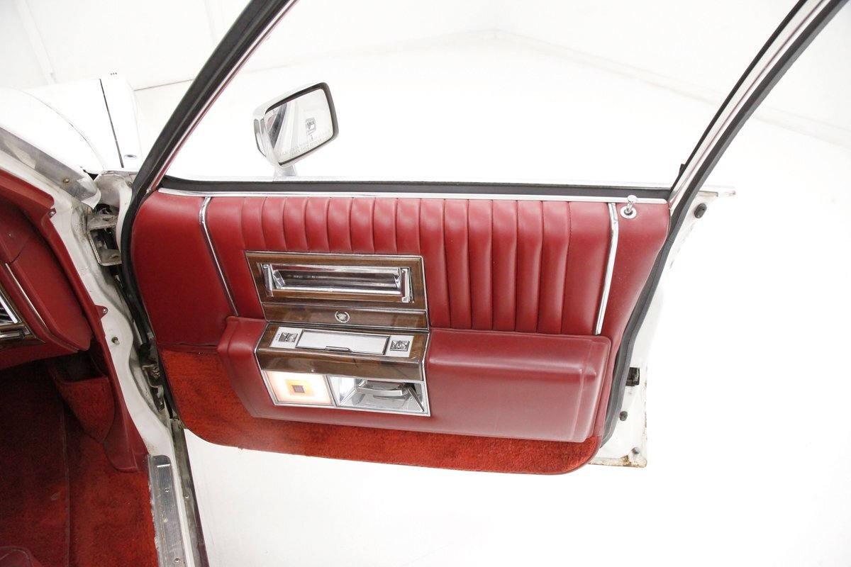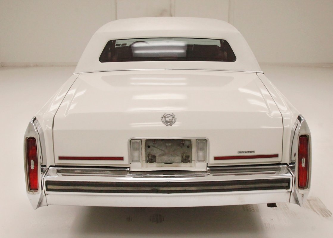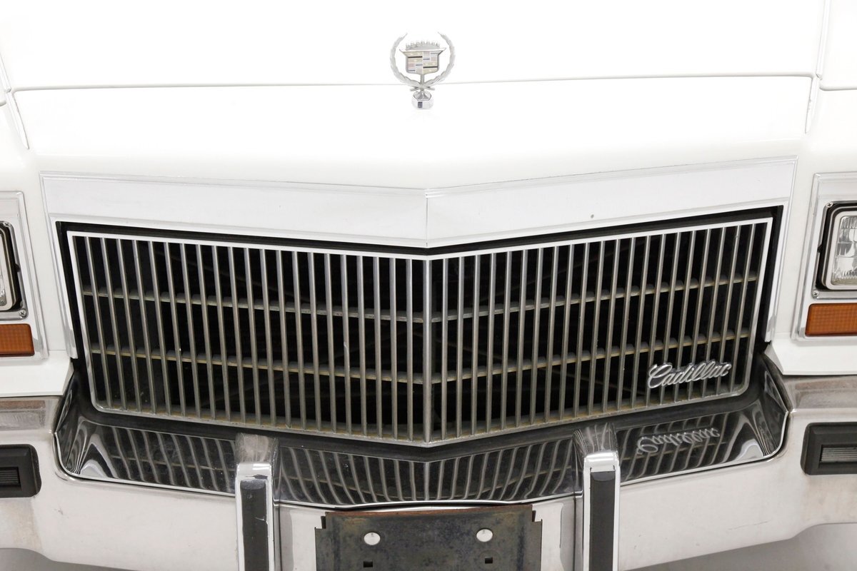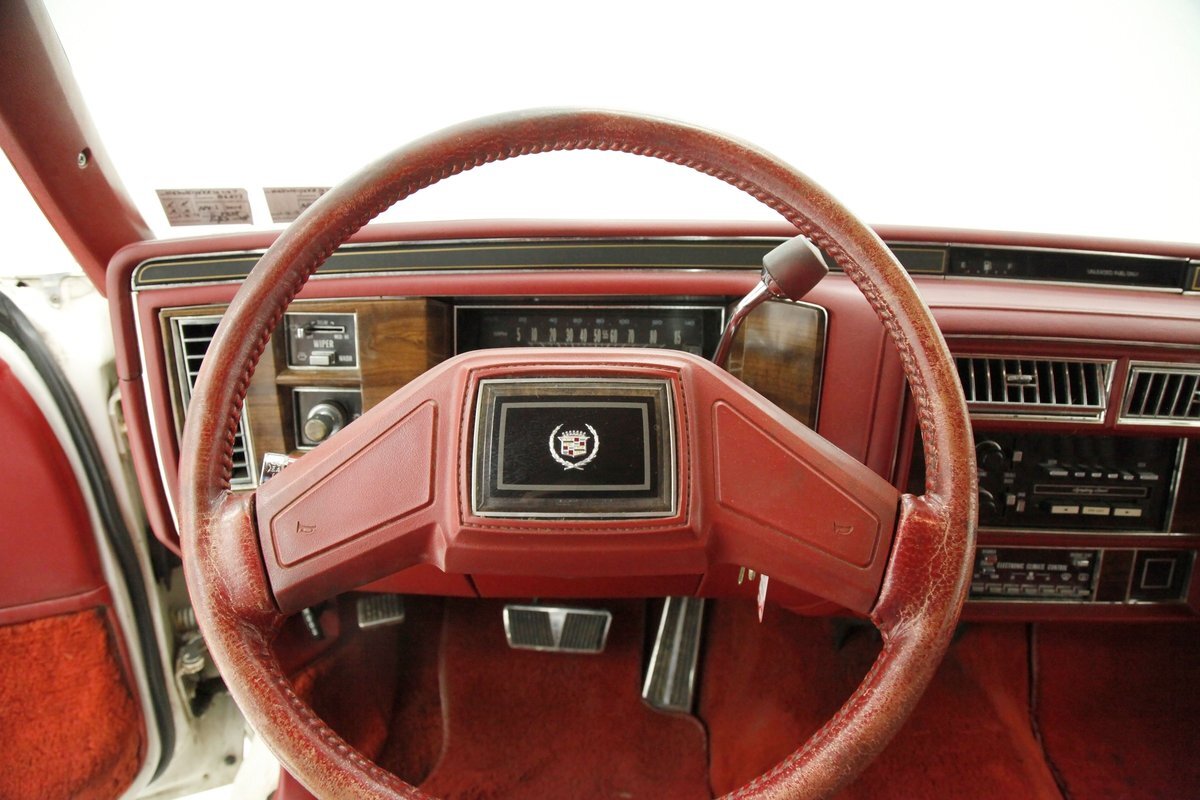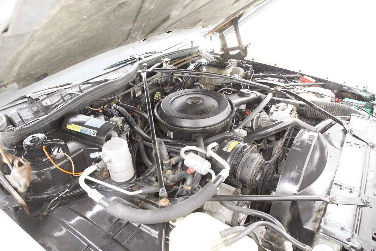 The gold faded to silver wreathed, cloisonne center crowned badge leads the way on top of the V style egg crate chromed grille which is flanked by some serious spare and rectangle design in the form of dual headlights. Just below the horizontal turn signals with a winged crown crest adhered to them, wrap around the front quarters, where they have some running lights just above them. Below all this late 80's menagerie is a clean chromed bumper with some rubber strips inserted. A large stainless rocker covering takes over up front of the wheel well and works its way to the rear of the car. This is a 4-door luxury sedan and for the gaps of this we note they are all well minded. On the roof is a new padded vinyl top in white just like the rest of the exterior. The three bedroom size trunk lid is framed on either side by vertical big bezeled taillights and more caddy crests in their centers. A shiny rear bumper is below, and I can see no problems visually with this rear framer. Faded gold leafed crown crests are peppering the exterior throughout the car, and for the chromed wire wheel covers they are also not to be out done. Finally, some tasteful red pin striping makes its way throughout the edges and panels of this wonderful piece of Detroit iron. Overall the color matched repaint presents well with some minor chips and inclusion but the body remains rust free.