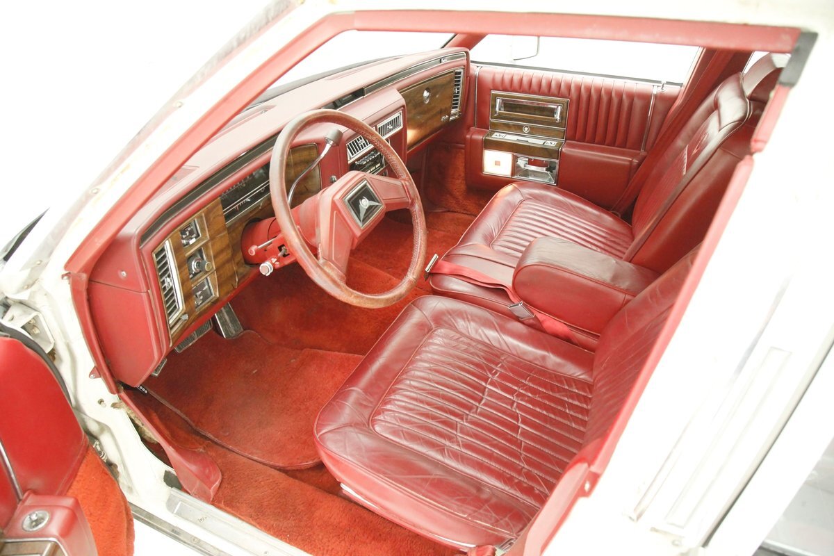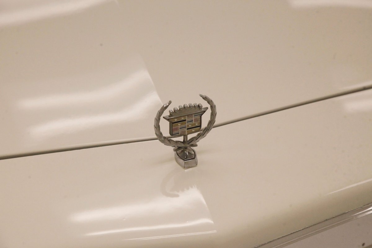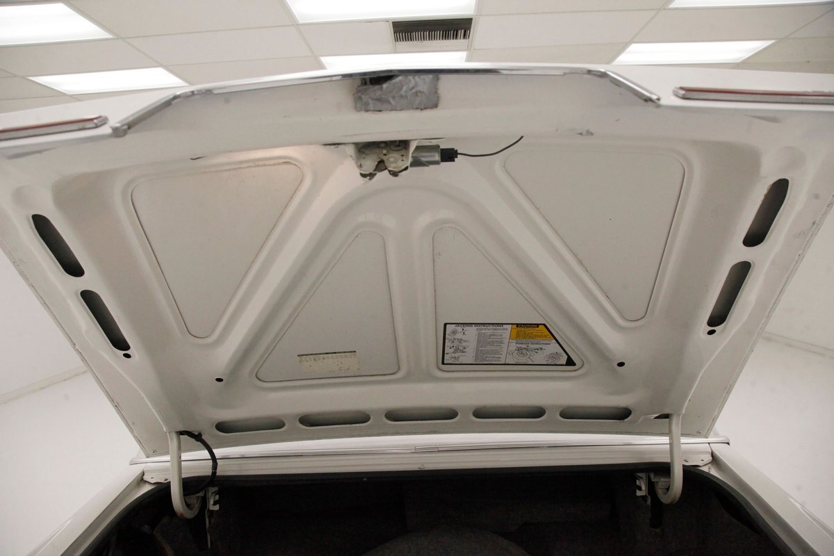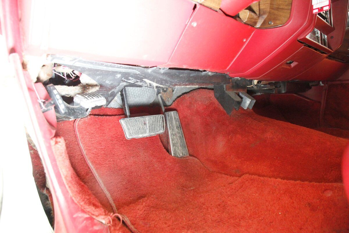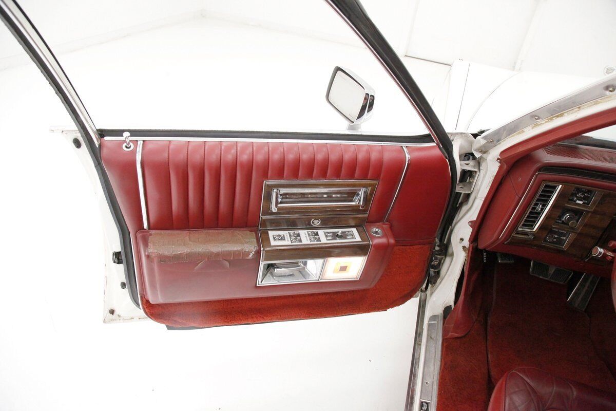 The gold faded to silver wreathed, cloisonne center crowned badge leads the way on top of the V style egg crate chromed grille which is flanked by some serious spare and rectangle design in the form of dual headlights. Just below the horizontal turn signals with a winged crown crest adhered to them, wrap around the front quarters, where they have some running lights just above them. Below all this late 80's menagerie is a clean chromed bumper with some rubber strips inserted. A large stainless rocker covering takes over up front of the wheel well and works its way to the rear of the car. This is a 4-door luxury sedan and for the gaps of this we note they are all well minded. On the roof is a new padded vinyl top in white just like the rest of the exterior. The three bedroom size trunk lid is framed on either side by vertical big bezeled taillights and more caddy crests in their centers. A shiny rear bumper is below, and I can see no problems visually with this rear framer. Faded gold leafed crown crests are peppering the exterior throughout the car, and for the chromed wire wheel covers they are also not to be out done. Finally, some tasteful red pin striping makes its way throughout the edges and panels of this wonderful piece of Detroit iron. Overall the color matched repaint presents well with some minor chips and inclusion but the body remains rust free.