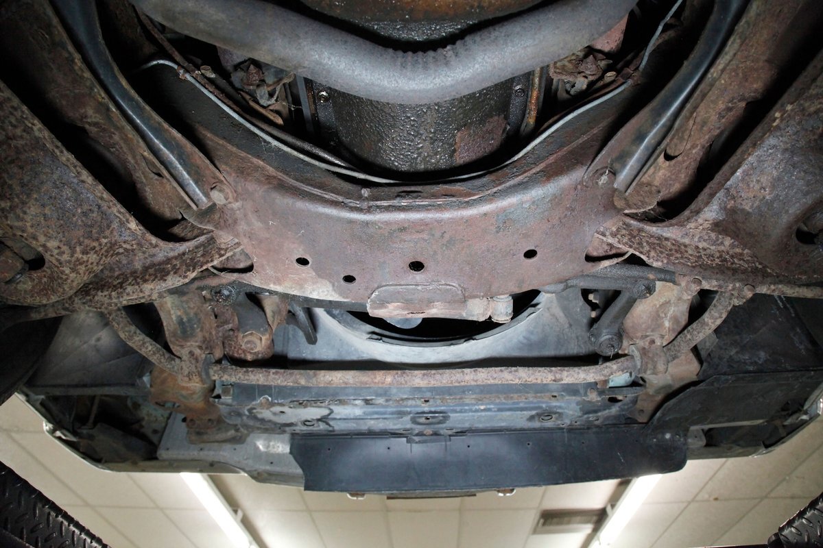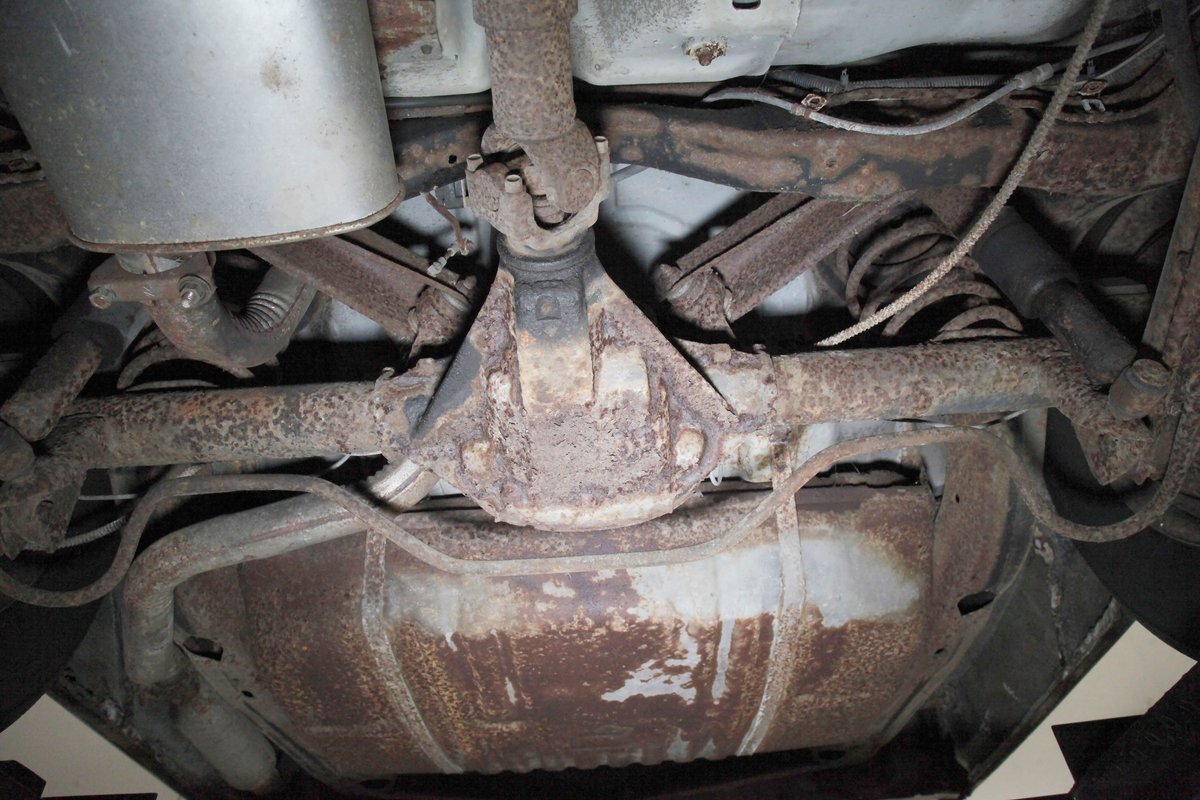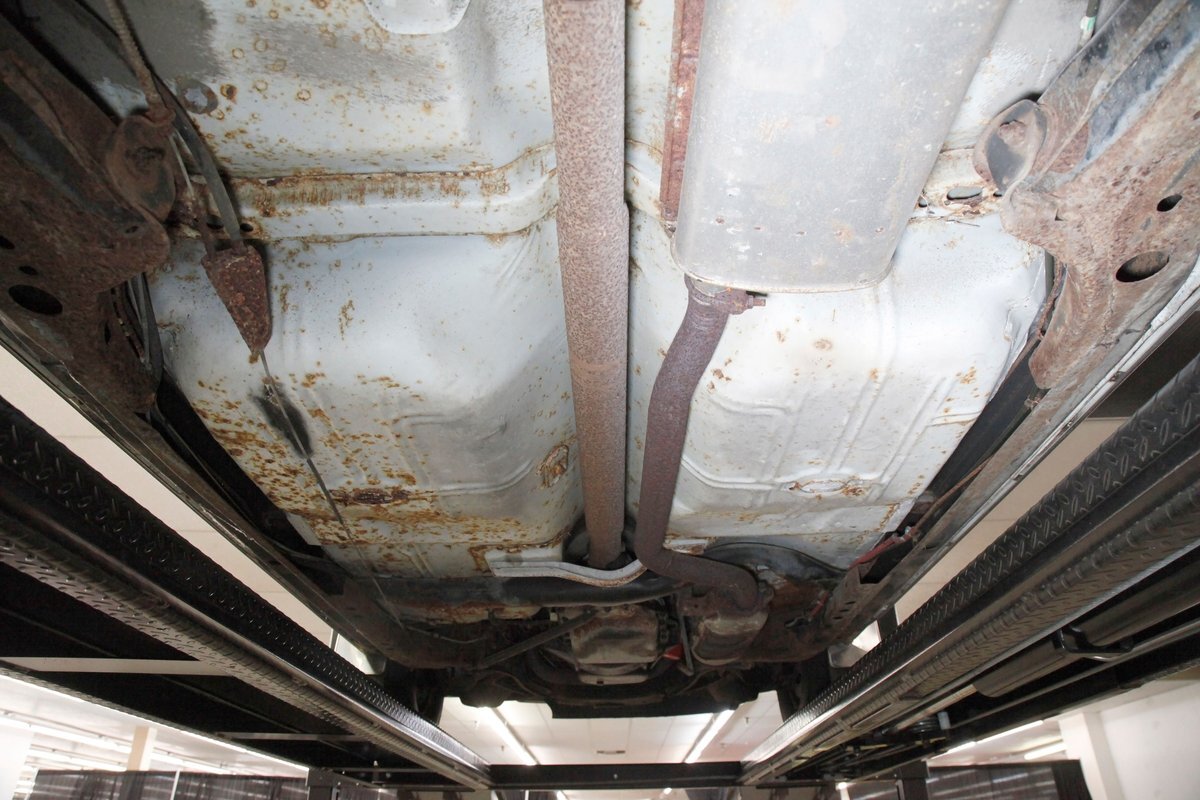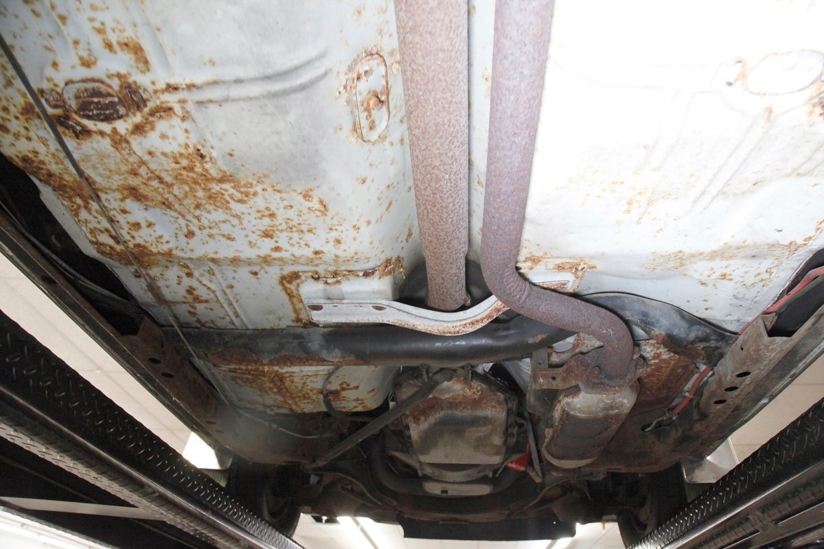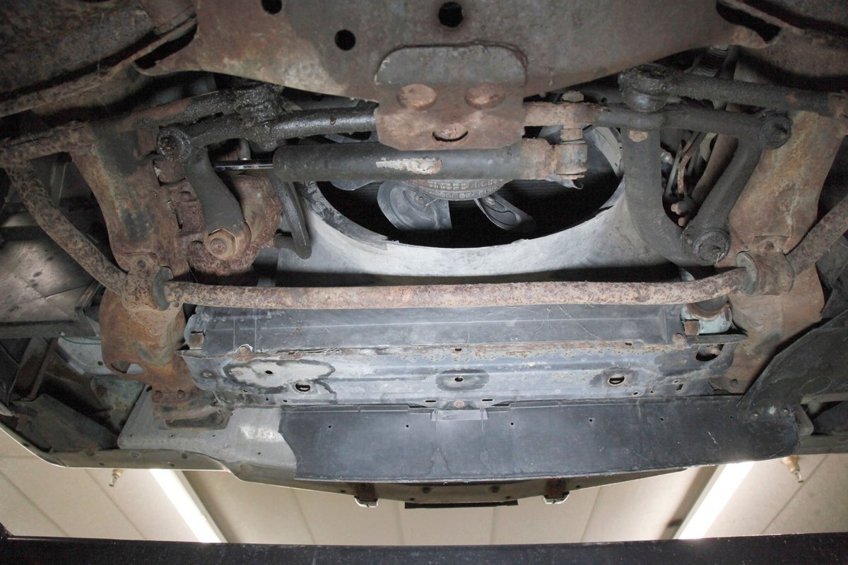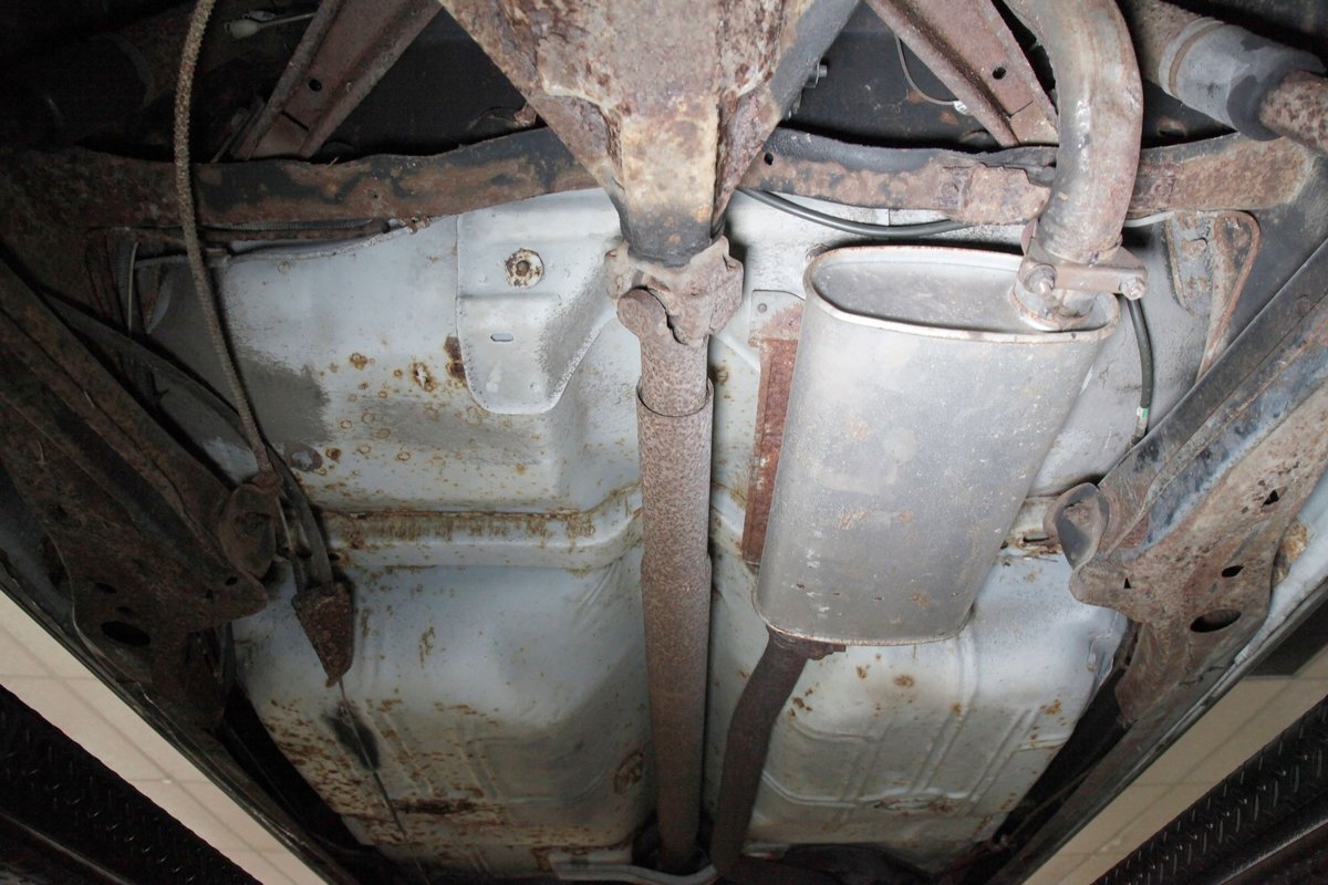 Up on the lift and it can be proven from the appearance that this is a well cared for car. All surfaces are clean save for some road splatter over sparse surface rust and solid body on framing all covered in black undercoating. Independent coil springs up front and 4 link with coil springs for the back provide the cushy rode, and power disc fronts and power drums backs all with new hoses provide the stopping.