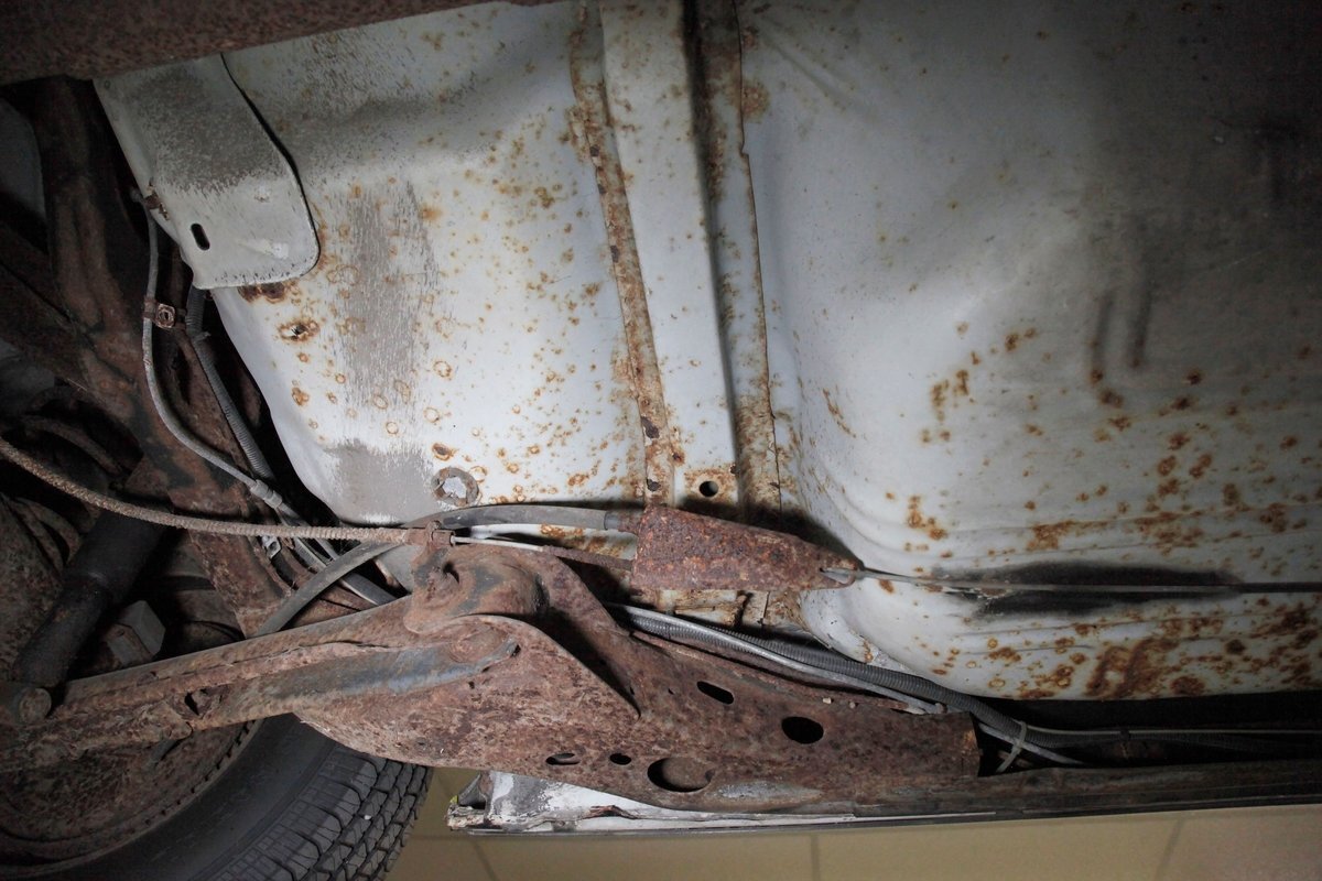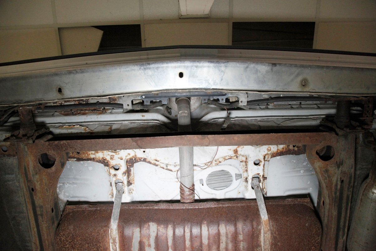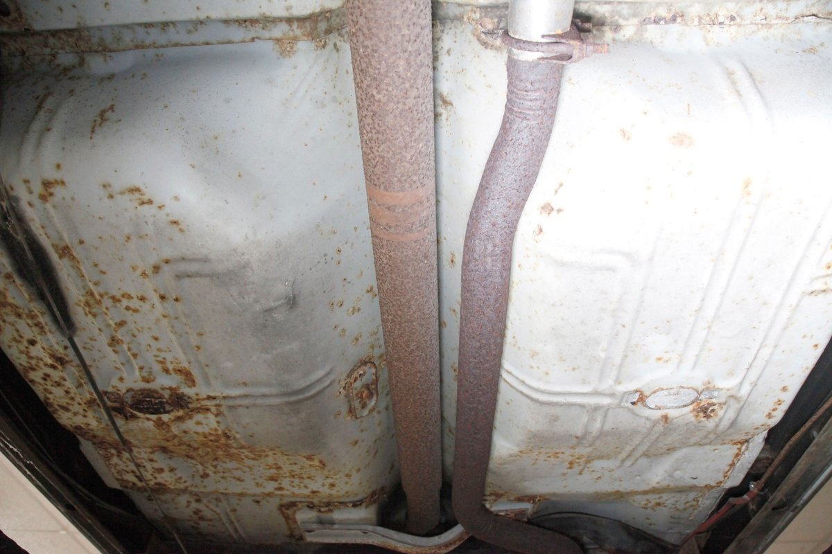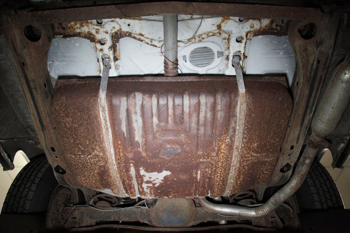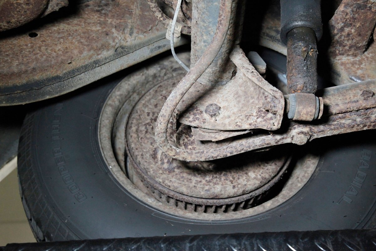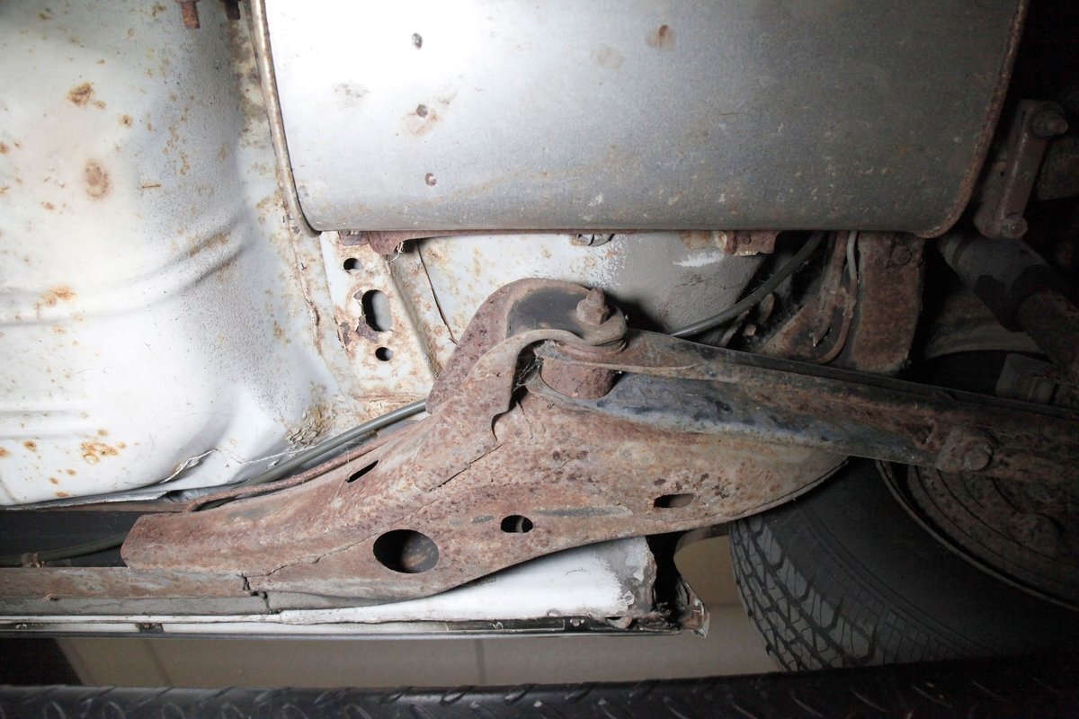 Up on the lift and it can be proven from the appearance that this is a well cared for car. All surfaces are clean save for some road splatter over sparse surface rust and solid body on framing all covered in black undercoating. Independent coil springs up front and 4 link with coil springs for the back provide the cushy rode, and power disc fronts and power drums backs all with new hoses provide the stopping.