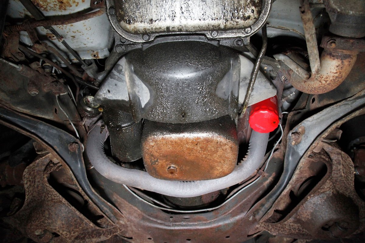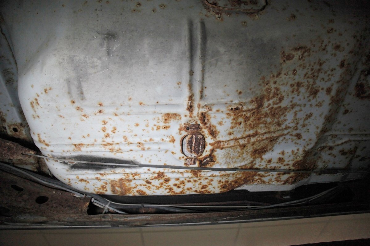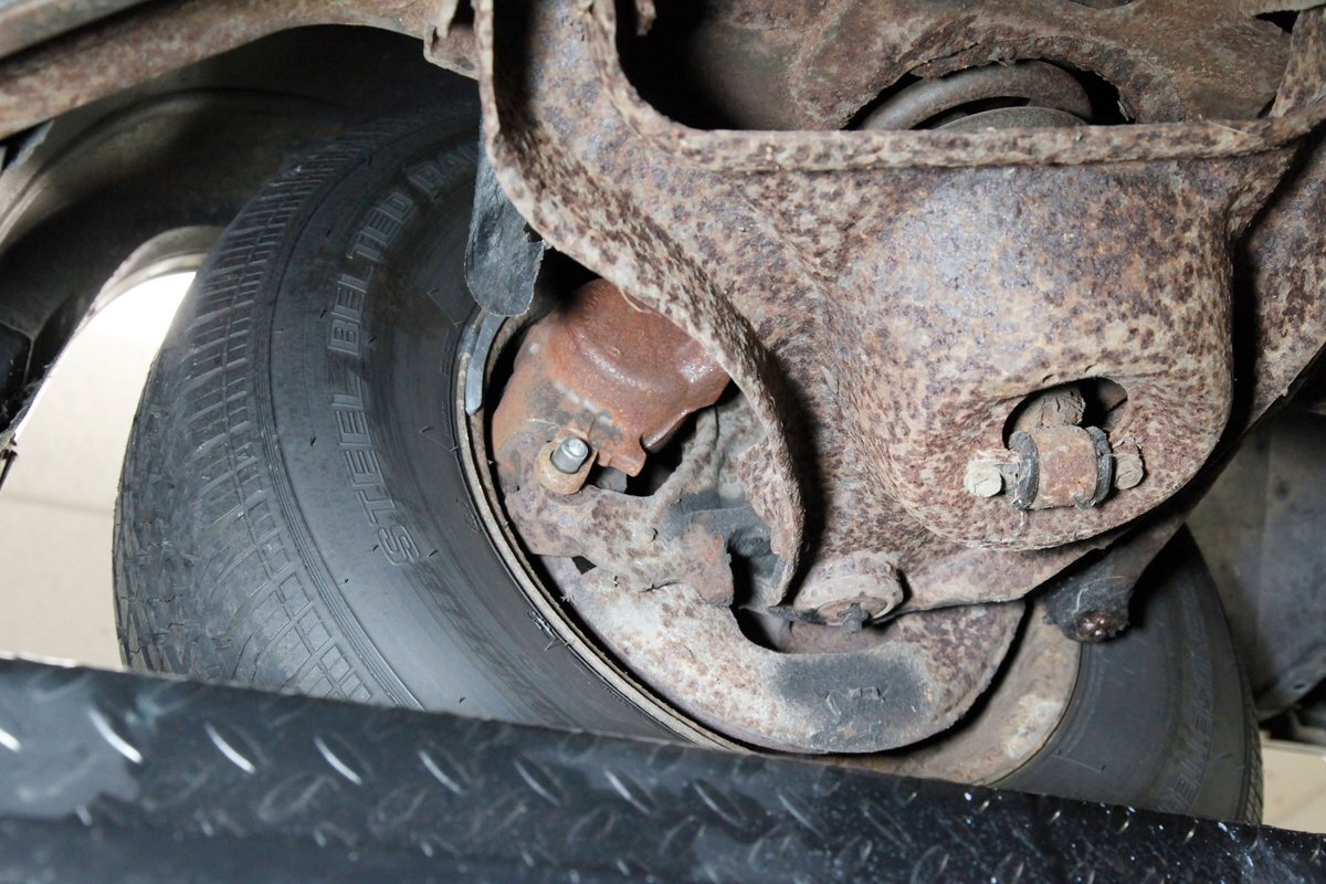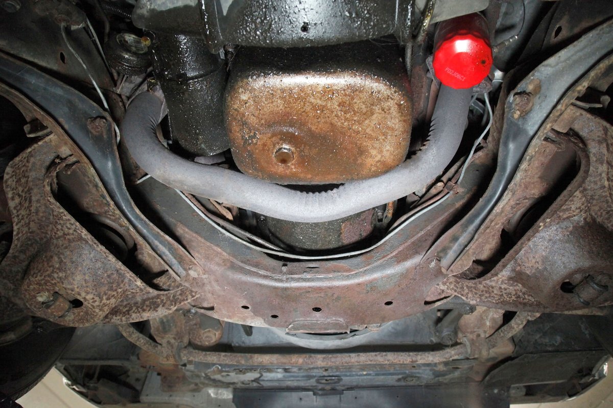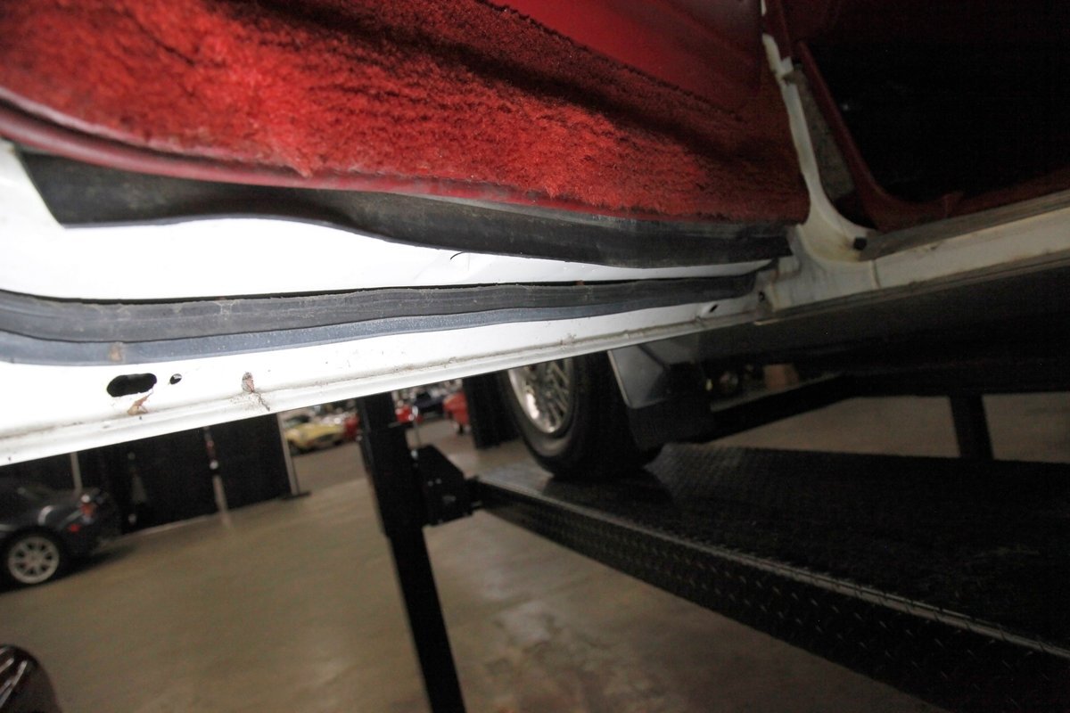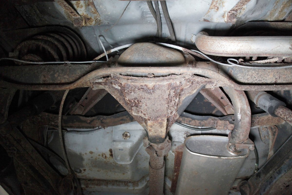 Up on the lift and it can be proven from the appearance that this is a well cared for car. All surfaces are clean save for some road splatter over sparse surface rust and solid body on framing all covered in black undercoating. Independent coil springs up front and 4 link with coil springs for the back provide the cushy rode, and power disc fronts and power drums backs all with new hoses provide the stopping.