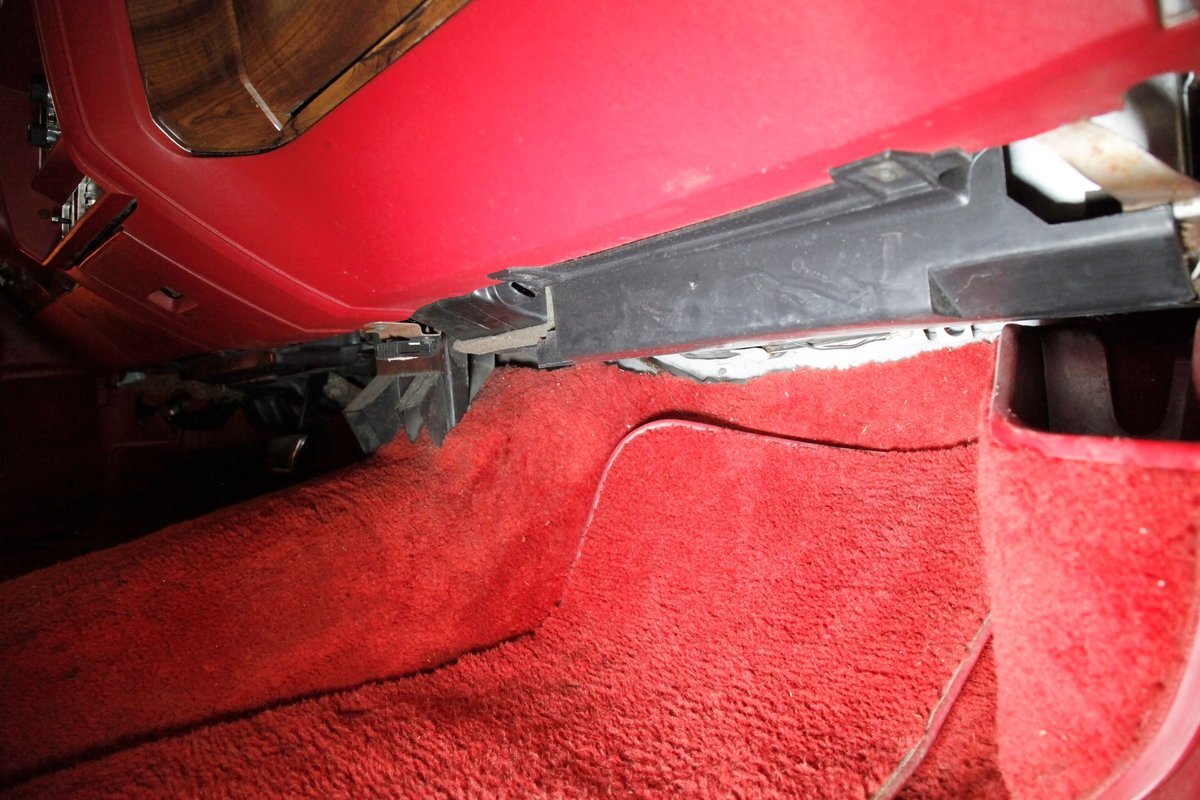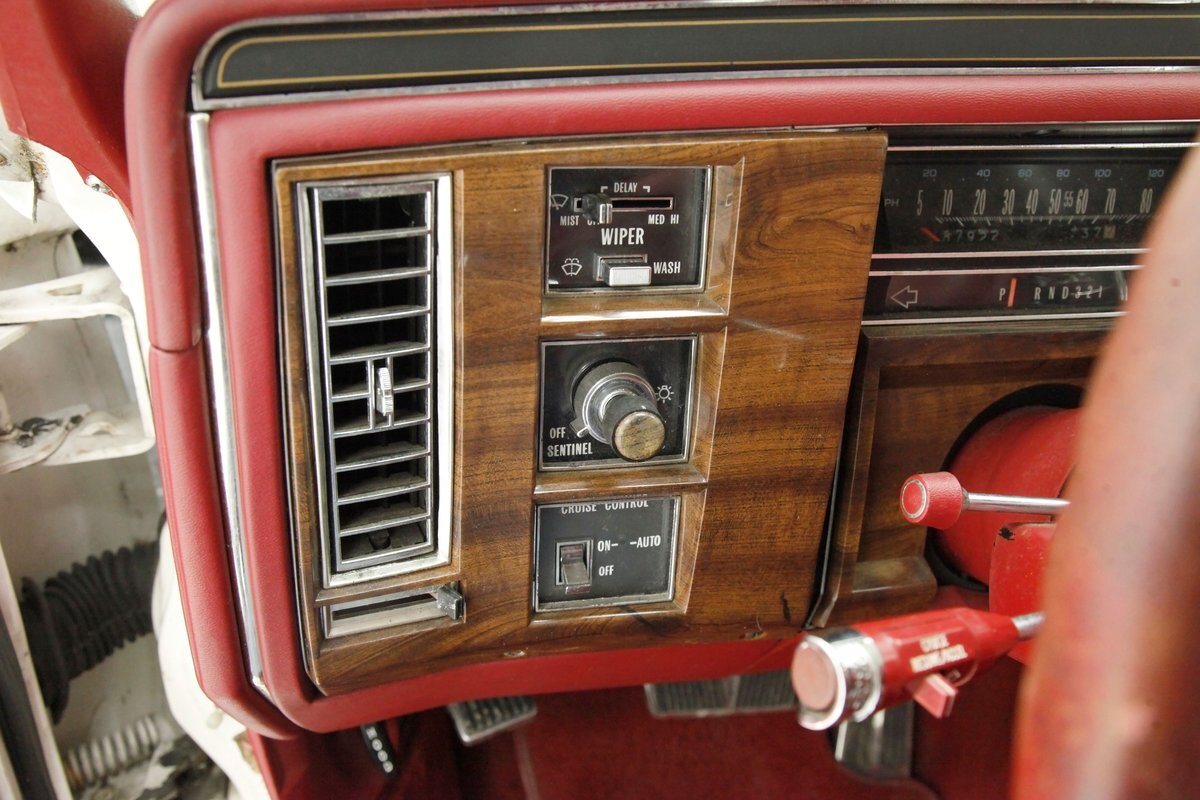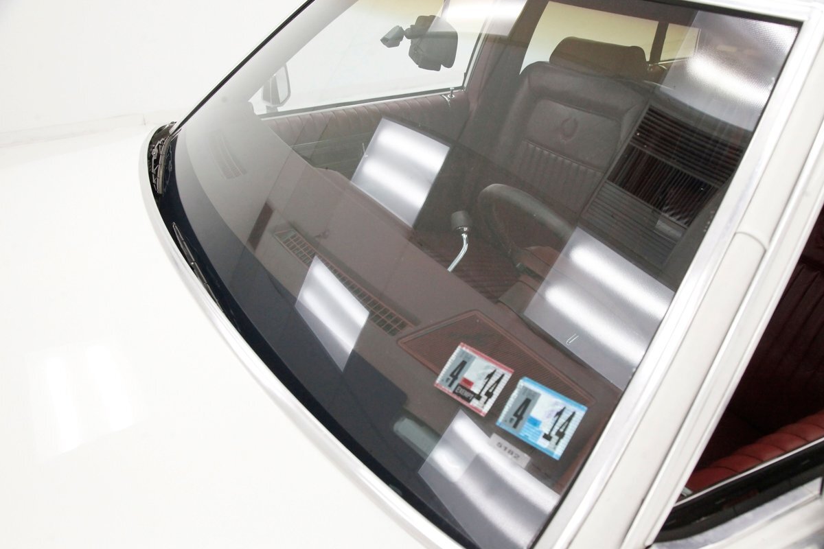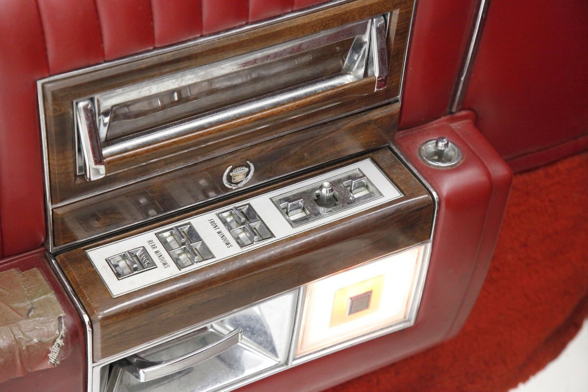 Just as luxurious as the exterior, we see plenty of red padded vinyl, wood applique, chromed panels, and red carpeting covering the door's insides. The customary power toggles are on the armrest as the chromed door actuator and a courtesy light. Inside pillow-like red leather covered wide buckets are up front and there is a fold down white armrest in the center. These have aged gracefully and have a few folds in the leather thrown in for that character. In back a spacious rear bench has access to big pouches for storage and plenty of legroom covered entirely with well preserved, clean red carpeting. Upfront a nicely curved U shape is reserved for the dash, and it has wood applique within the red padded surroundings. It's 1989 and all the creature comforts are controlled by push buttons and even some blue LCD readouts are within. More wood applique for the passenger glove box and above all this finery is a clean and tight felted broadcloth headliner.