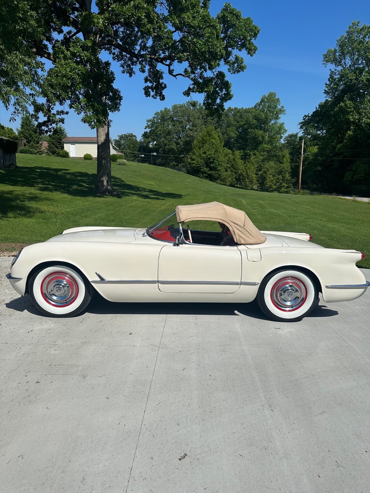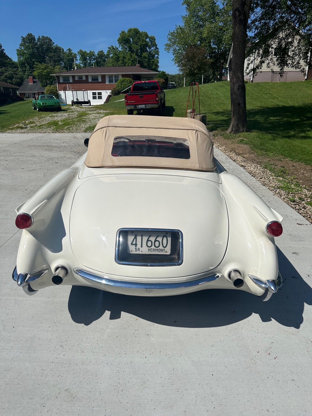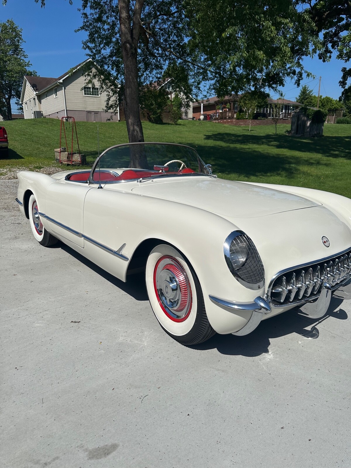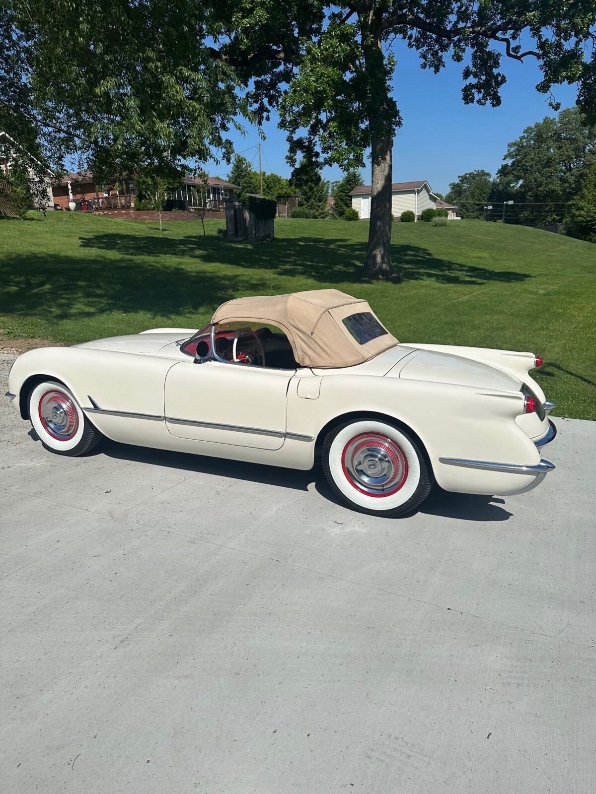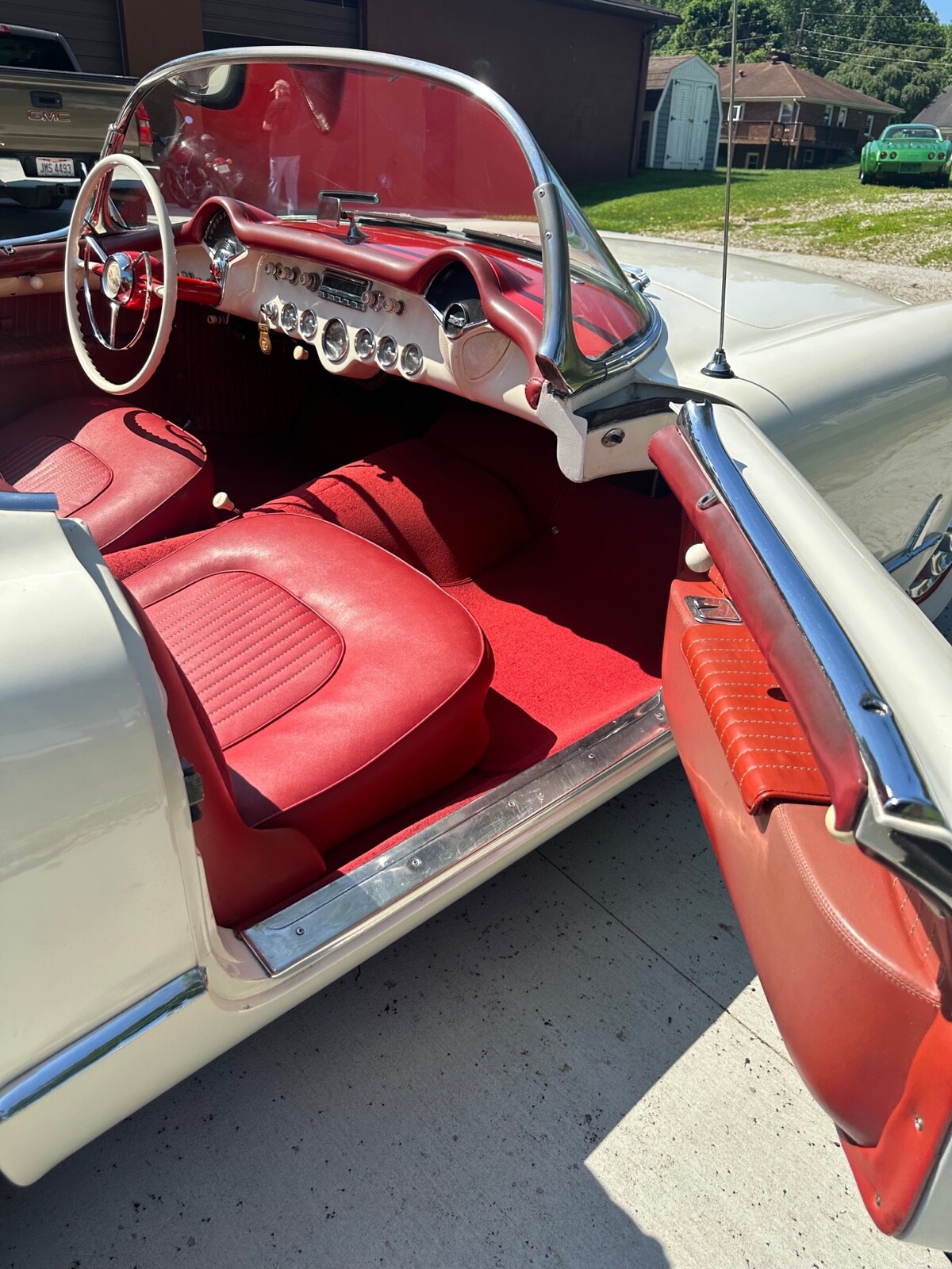 A super nice 1954 corvette with matching numbers and an unhit body. Car just came out of storage and is an older restoration. Paint is very nice and interior is new. Car has new Firestone wide whites and original spare is in trunk with jack and tools. Car starts, runs and drives excellent and would win most local shows. Top is new and operates like it should. Lots of paperwork and owner history comes with car. Priced below market at 61,900 or best offer. Chuck 606-232-9116