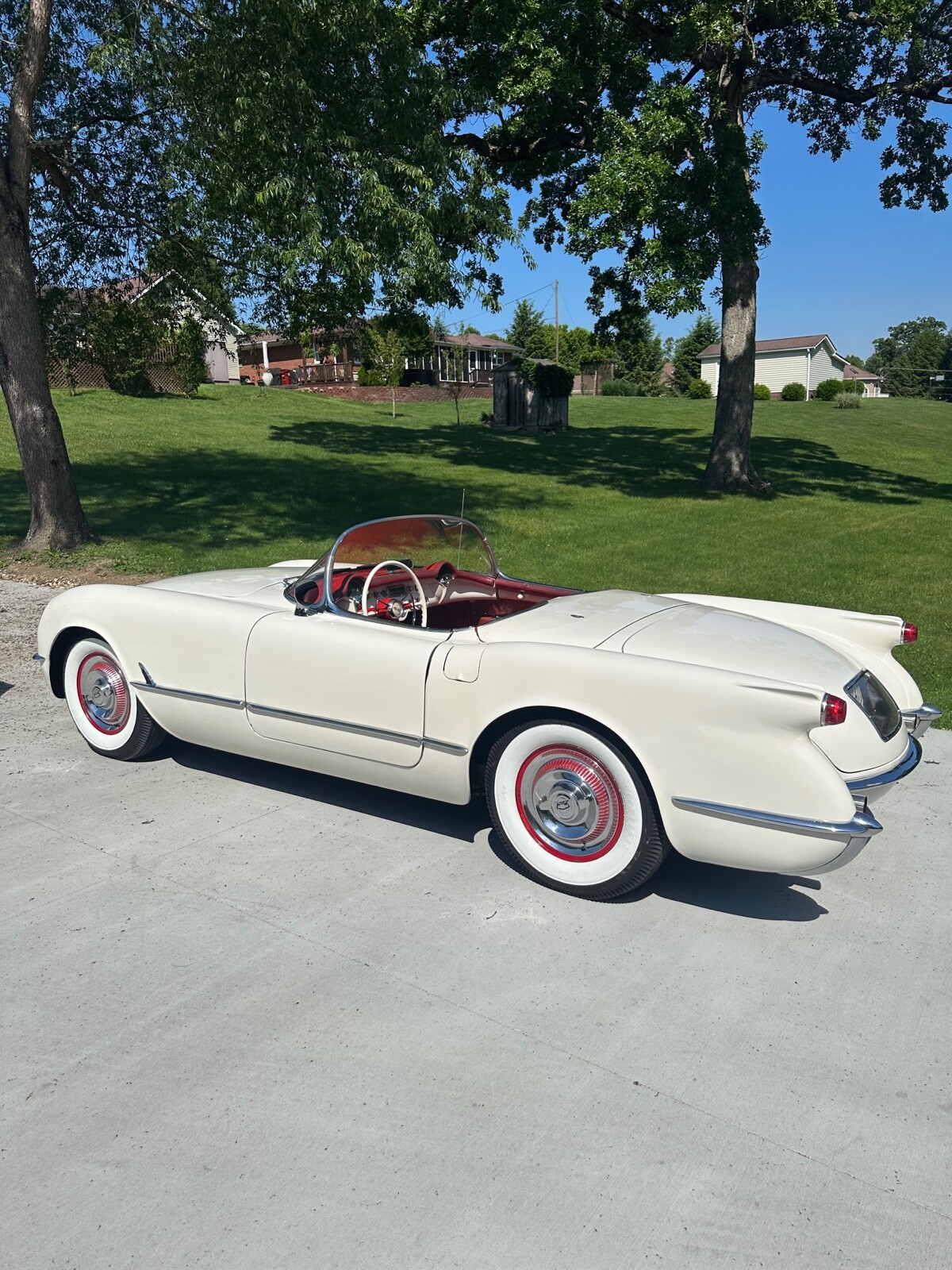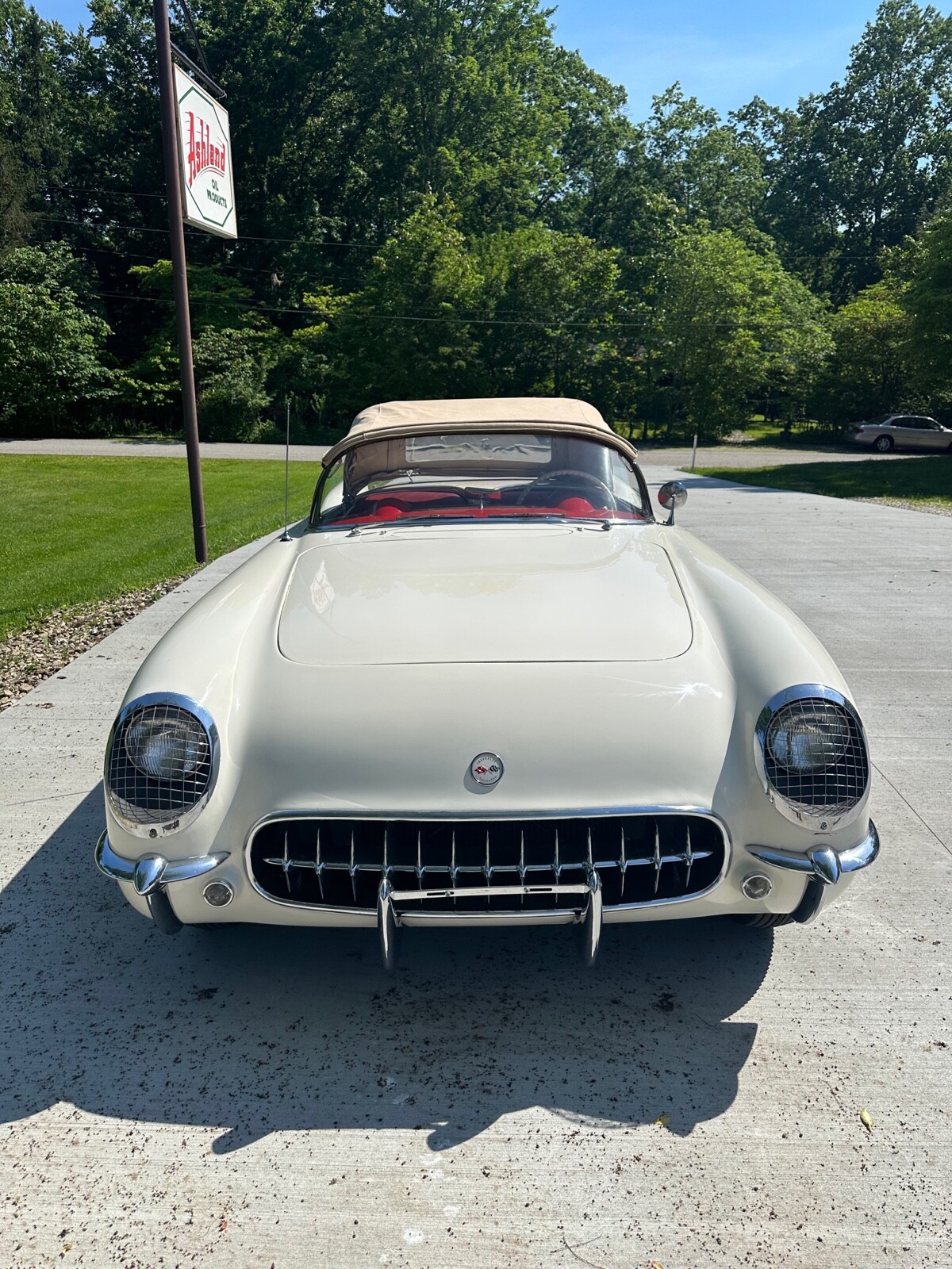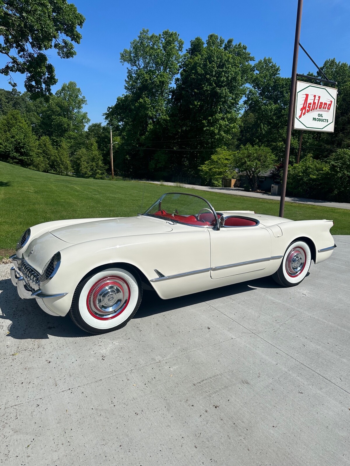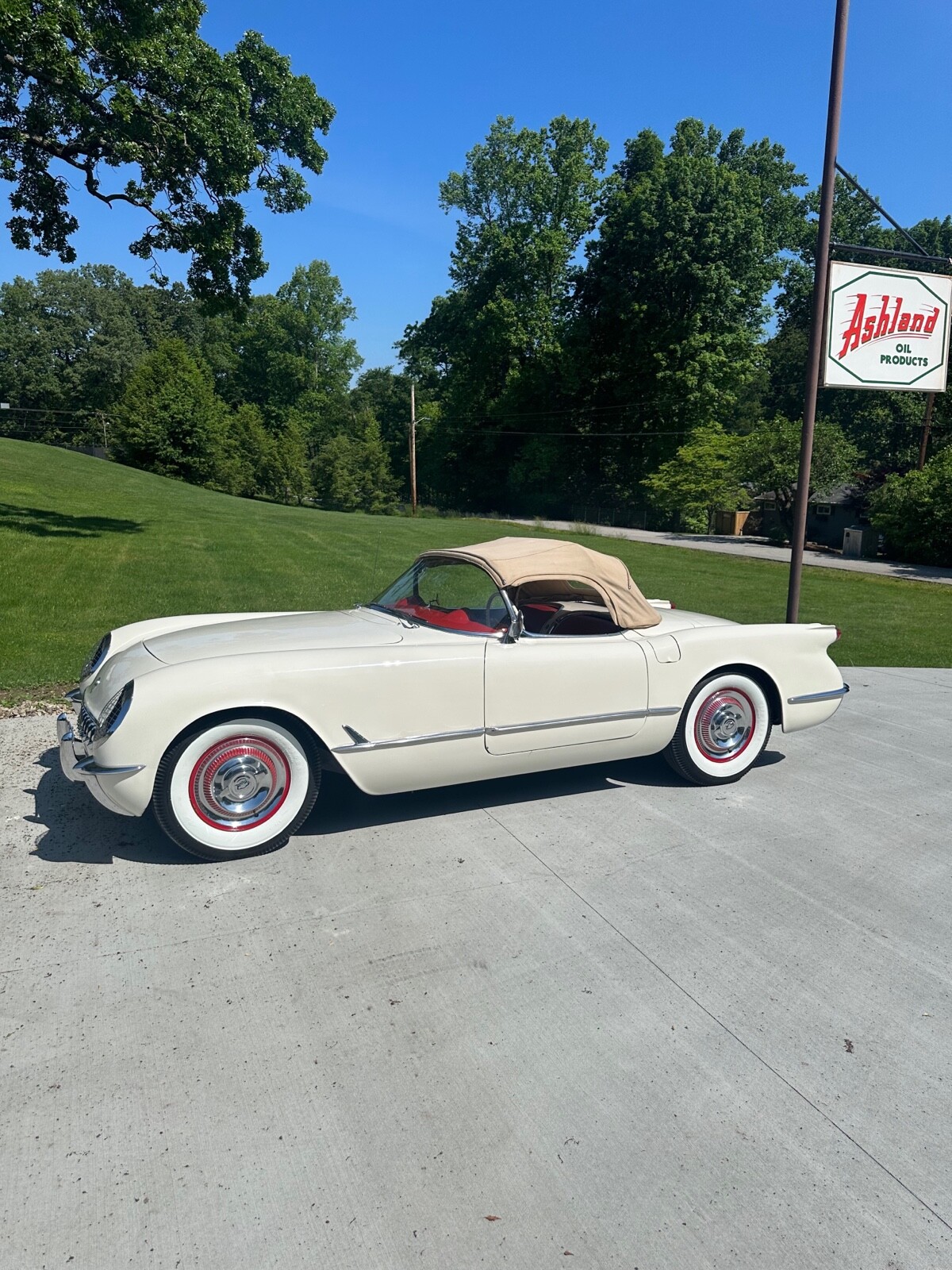 A super nice 1954 corvette with matching numbers and an unhit body. Car just came out of storage and is an older restoration. Paint is very nice and interior is new. Car has new Firestone wide whites and original spare is in trunk with jack and tools. Car starts, runs and drives excellent and would win most local shows. Top is new and operates like it should. Lots of paperwork and owner history comes with car. Priced below market at 61,900 or best offer. Chuck 606-232-9116