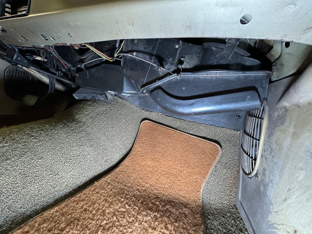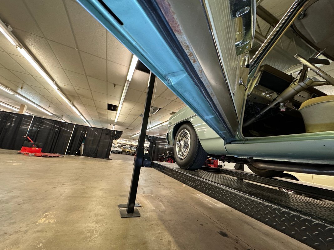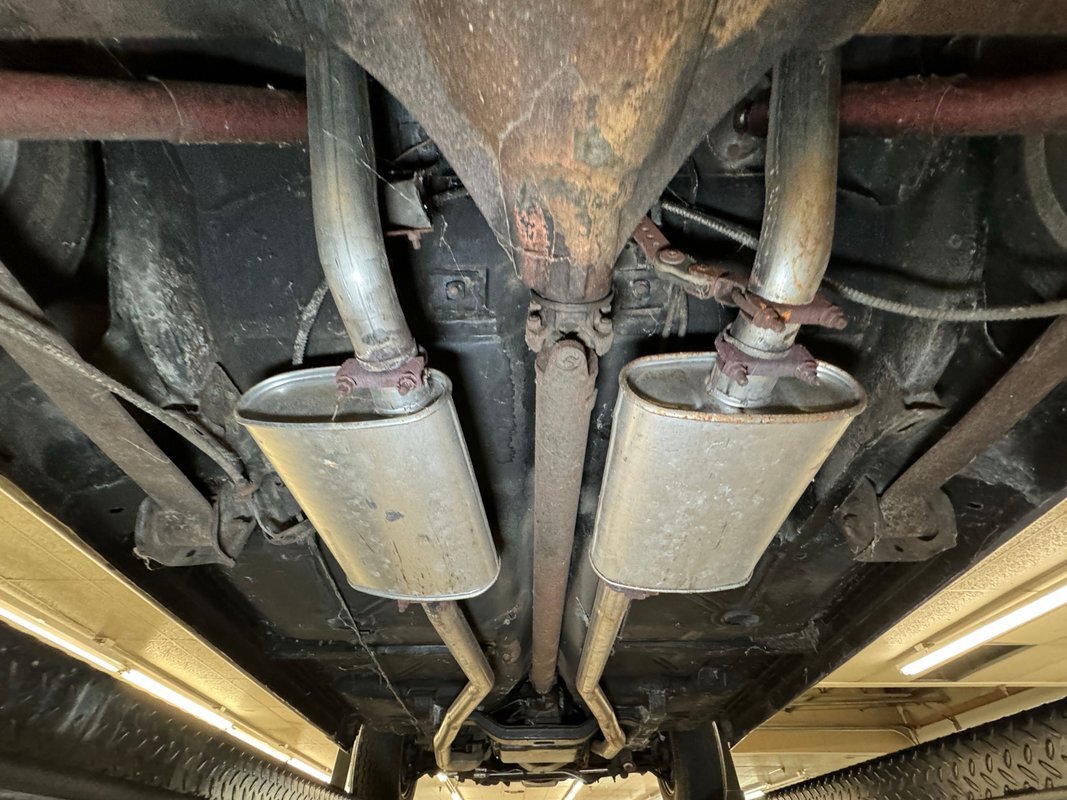Under the hood we find the 350ci V8 in driver quality conditions but clean and topped with a 4-barrel carburetor on an Edelbrock intake. A Powerglide 2-speed automatic transmission sets the car in motion and sends power back to the 10 bolt rear with 3.08 gears. Drum brakes are on all four wheels. UndercarriageClean, driver quality underside with typical surface rust and no oil leaks that we could see. And more importantly, no invasive rust anywhere. The dual exhaust looks newer and enters stock style mufflers, then exits modestly behind the rear wheels. Coil spring suspension is found up front and leaf springs in back.