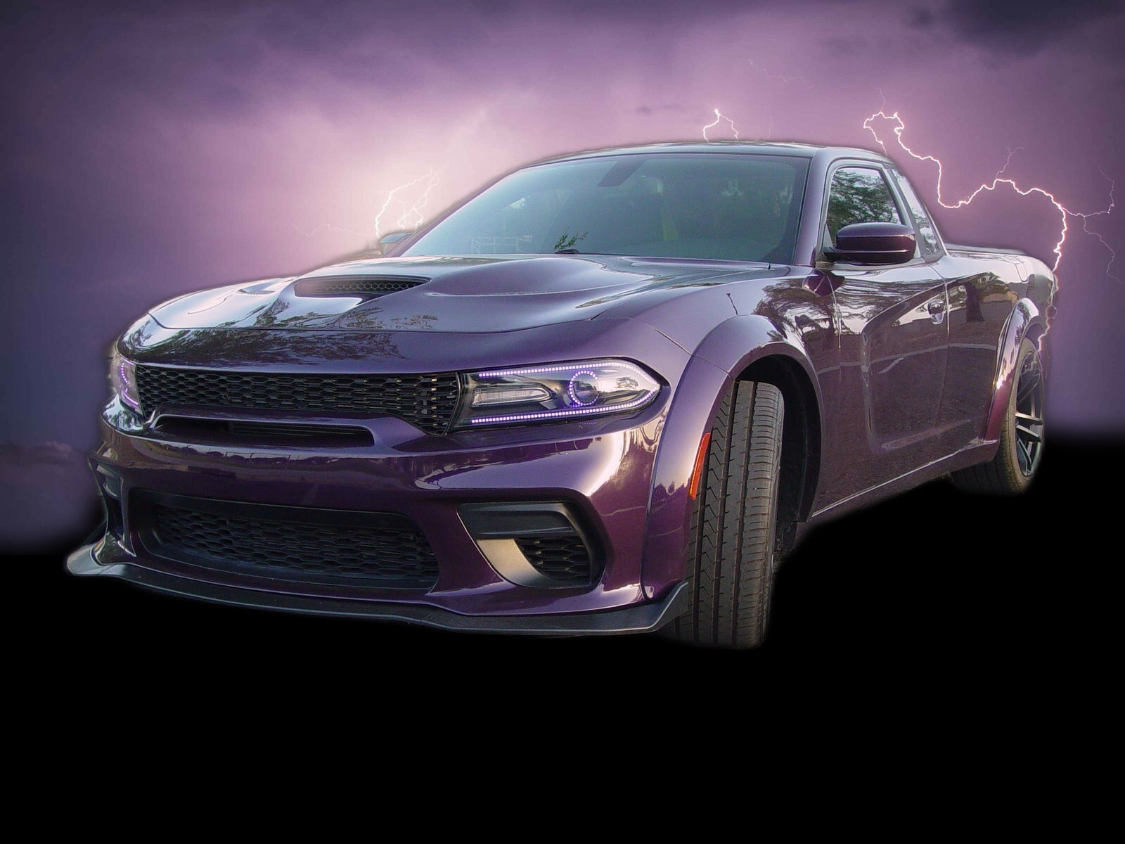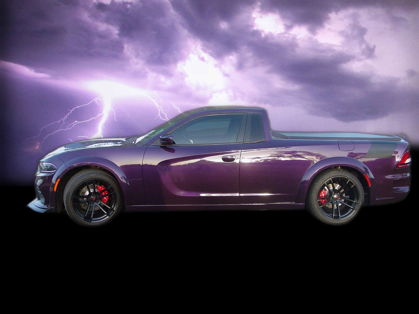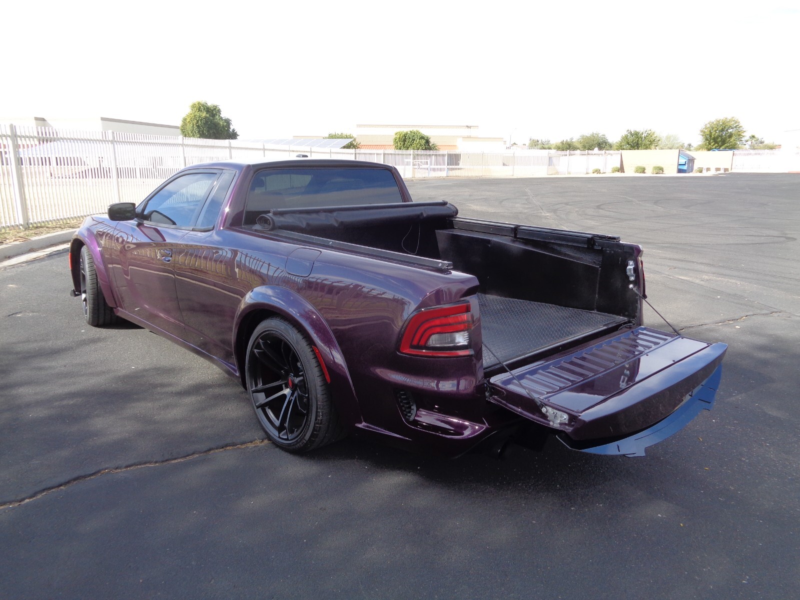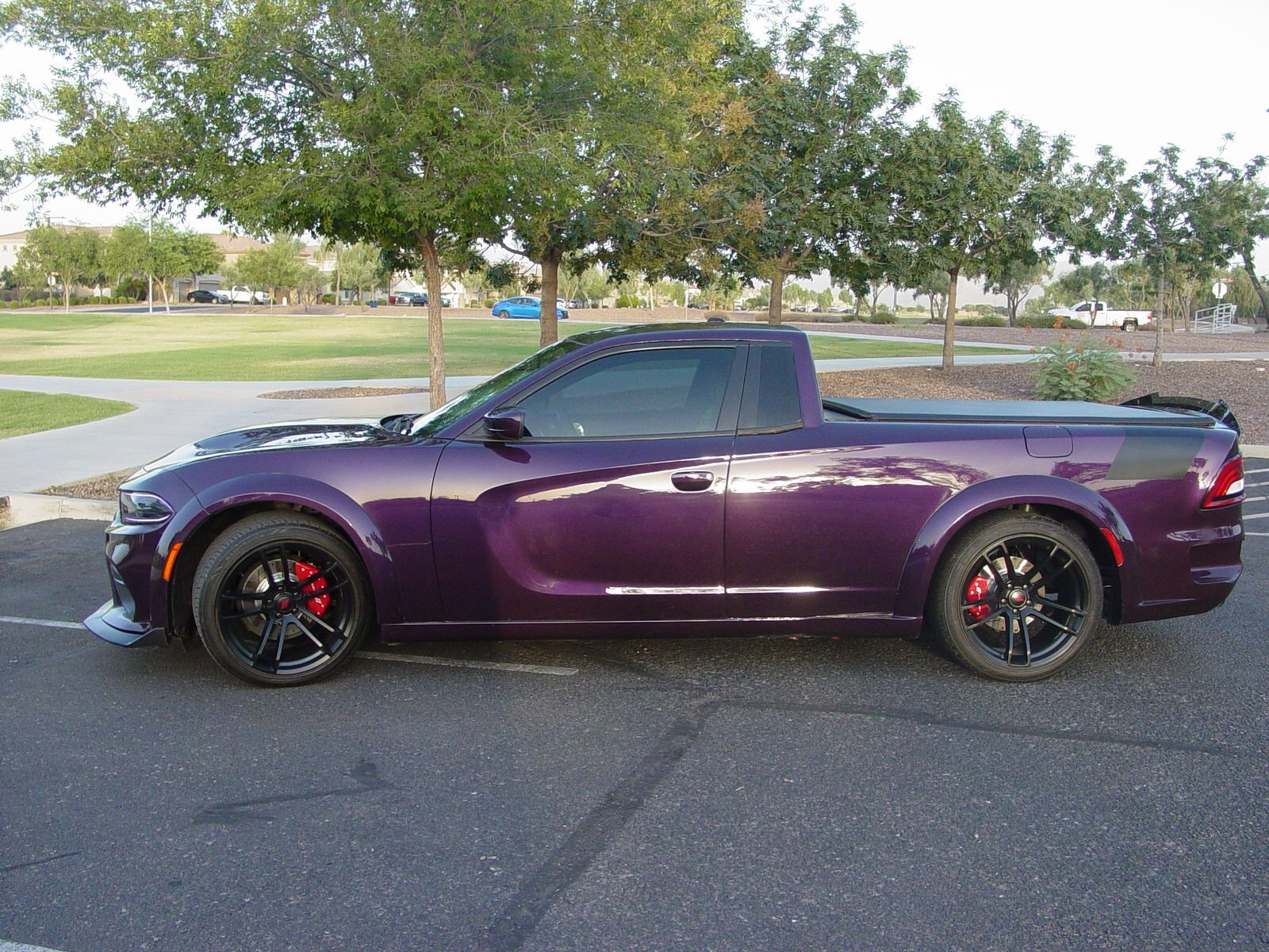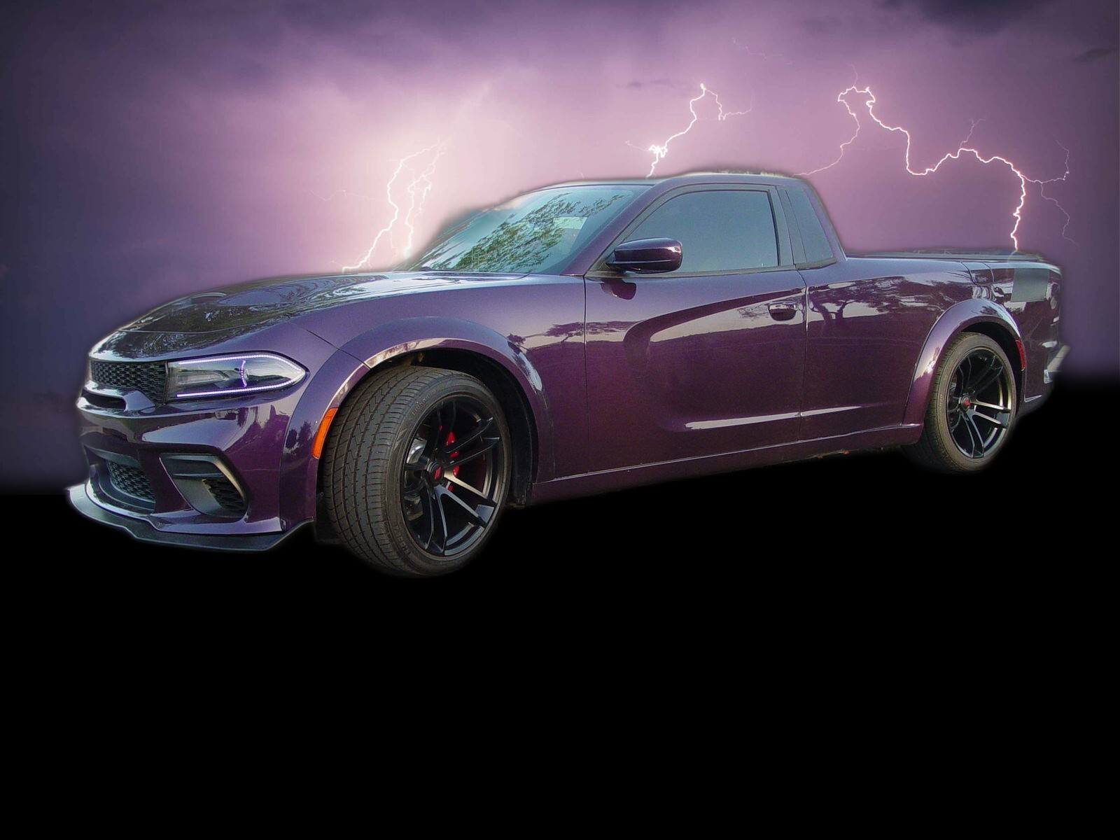 WOW check out this bad ass one of custom charger pickup that turns heads gives thumbs up and smiles everywhere it goes. The project was called operation THUNDER which started with a 2015 dodge charger as a donor for the build. The charger was cut down to a bare chassis leaving only the cowl, both doors, and half of half the roof with no engine or interior. The total front clip is all brand new 2023 charger hell cat and the rear is a Smyth Performance basic kit. The design of the basic kit did not match up with the hell cat wide body front, so a new design concept was created. The new design uses features of the hell cat car, so a lot of work went into the final design to make a working tail gate. The design after being drawn up was built using foam crafted too the design a fiber glass mold was made to make the new parts. The kit rear section was replaced with new parts a very time-consuming process. The final product after several tweaks ended up blending the hell cat look to the rear creating one bad to to bone ride. The chosen color is of course hell razin purple with new leather two tone Katskin covered sports performance seats with lime trim accents and carbon fiber steering wheel. The replacement engine is av6 3.6l@300hp with 8 speed auto trans from a 2018 charger with 30000 miles I have paperwork on it and vin#. The engine was updated by adding a cold air system, high performance output coils, and a cat back performance exhaust. The list of new parts starts with windshield, back glass, brake rotors, brake pads, front struts, rear springs, rear springs, alternator, ac pump, ac condenser, water pump, making in close to a new car. The wheels and tires are hell cat spec 20x11 to match the wide body. The end results are a factory looking package with style and aggressive stance. The best part about this bad ass charger pickup it is ONE OF ONE and could be yours. THANKS