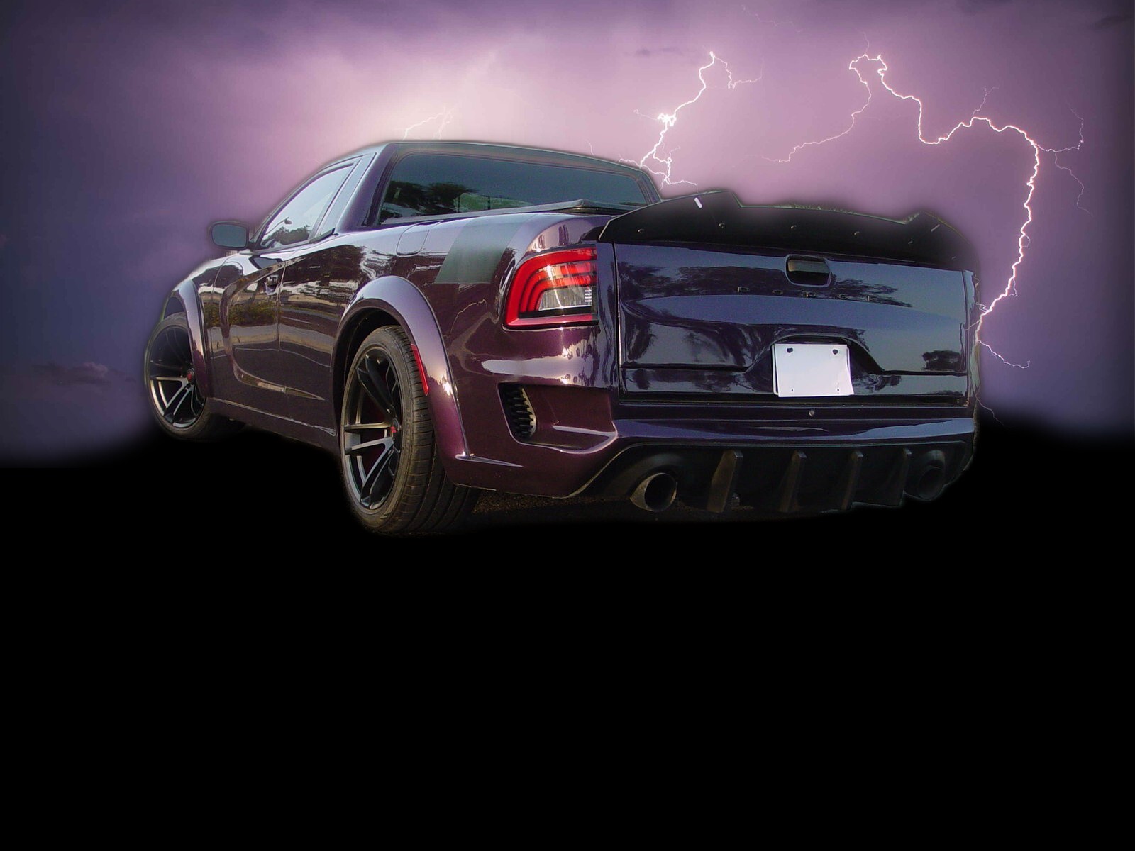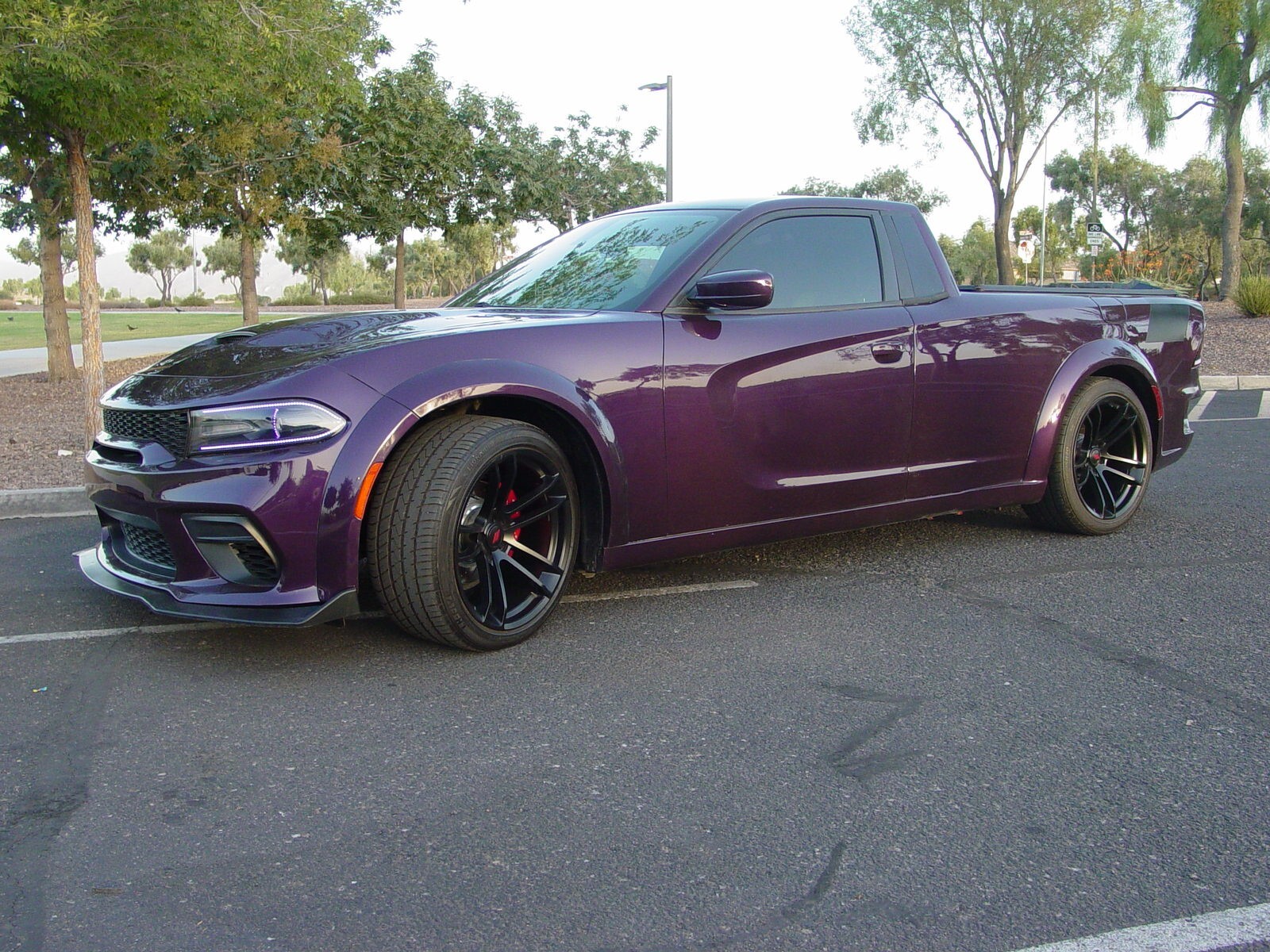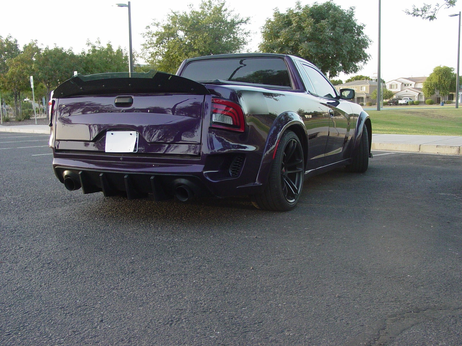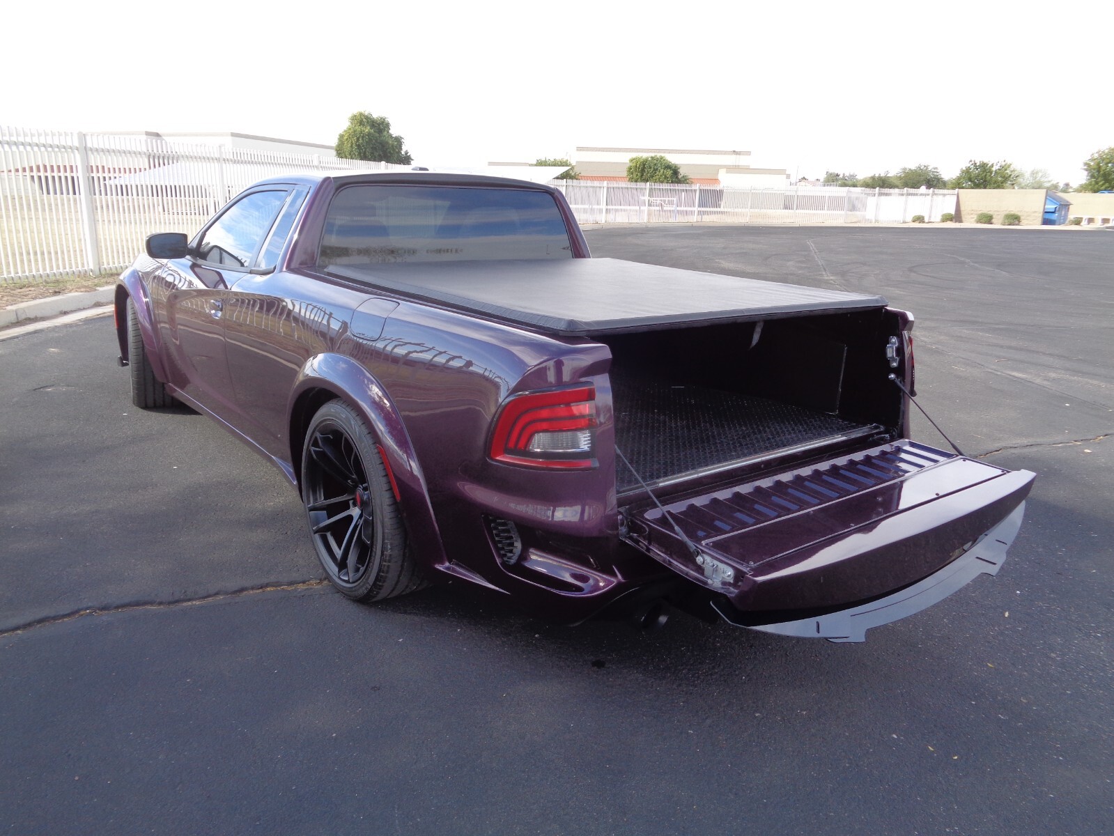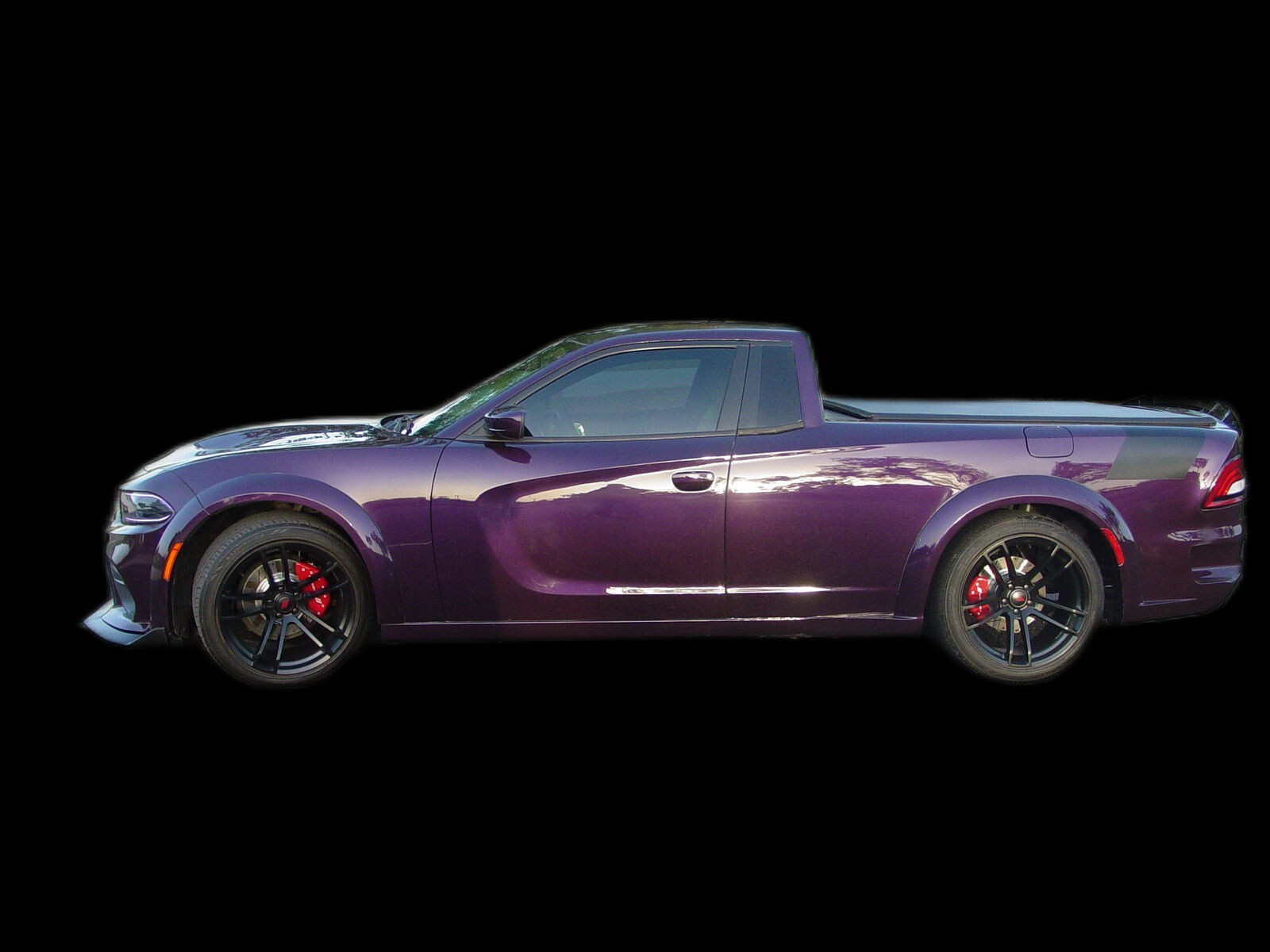 WOW check out this bad ass one of custom charger pickup that turns heads gives thumbs up and smiles everywhere it goes. The project was called operation THUNDER which started with a 2015 dodge charger as a donor for the build. The charger was cut down to a bare chassis leaving only the cowl, both doors, and half of half the roof with no engine or interior. The total front clip is all brand new 2023 charger hell cat and the rear is a Smyth Performance basic kit. The design of the basic kit did not match up with the hell cat wide body front, so a new design concept was created. The new design uses features of the hell cat car, so a lot of work went into the final design to make a working tail gate. The design after being drawn up was built using foam crafted too the design a fiber glass mold was made to make the new parts. The kit rear section was replaced with new parts a very time-consuming process. The final product after several tweaks ended up blending the hell cat look to the rear creating one bad to to bone ride. The chosen color is of course hell razin purple with new leather two tone Katskin covered sports performance seats with lime trim accents and carbon fiber steering wheel. The replacement engine is av6 3.6l@300hp with 8 speed auto trans from a 2018 charger with 30000 miles I have paperwork on it and vin#. The engine was updated by adding a cold air system, high performance output coils, and a cat back performance exhaust. The list of new parts starts with windshield, back glass, brake rotors, brake pads, front struts, rear springs, rear springs, alternator, ac pump, ac condenser, water pump, making in close to a new car. The wheels and tires are hell cat spec 20x11 to match the wide body. The end results are a factory looking package with style and aggressive stance. The best part about this bad ass charger pickup it is ONE OF ONE and could be yours. THANKS