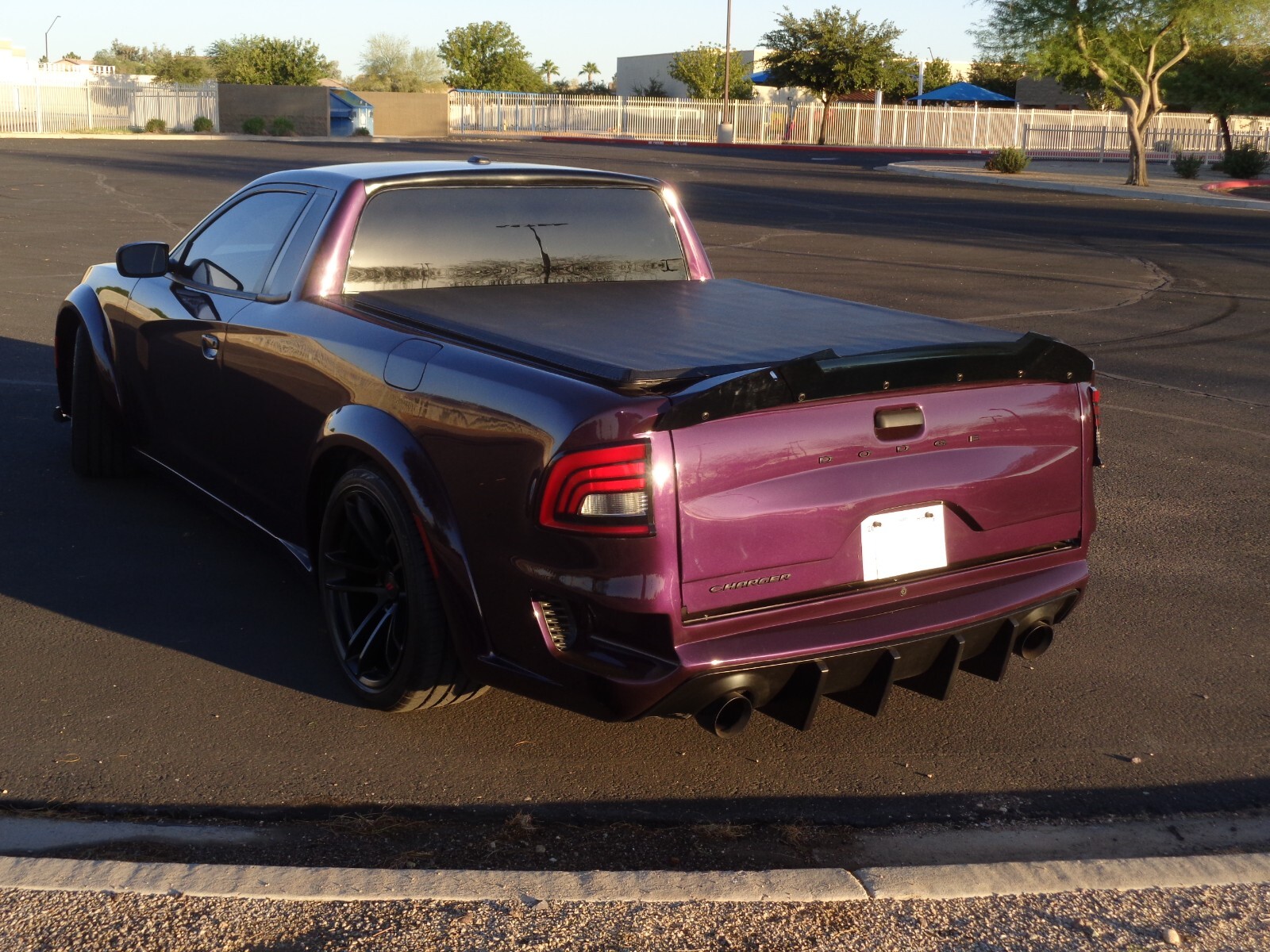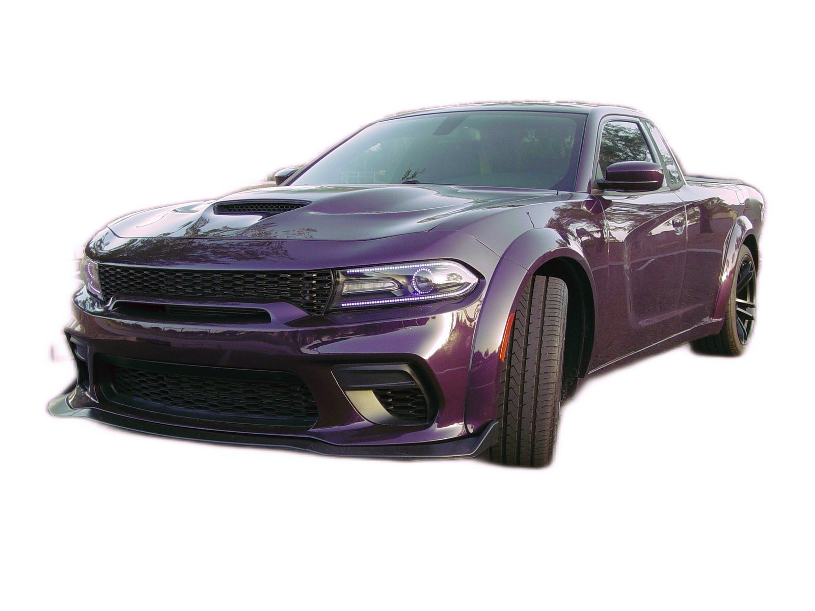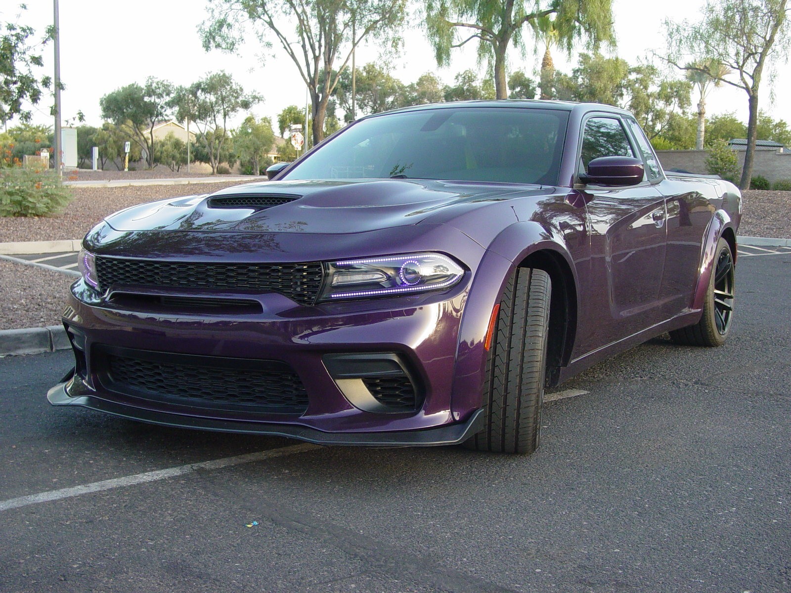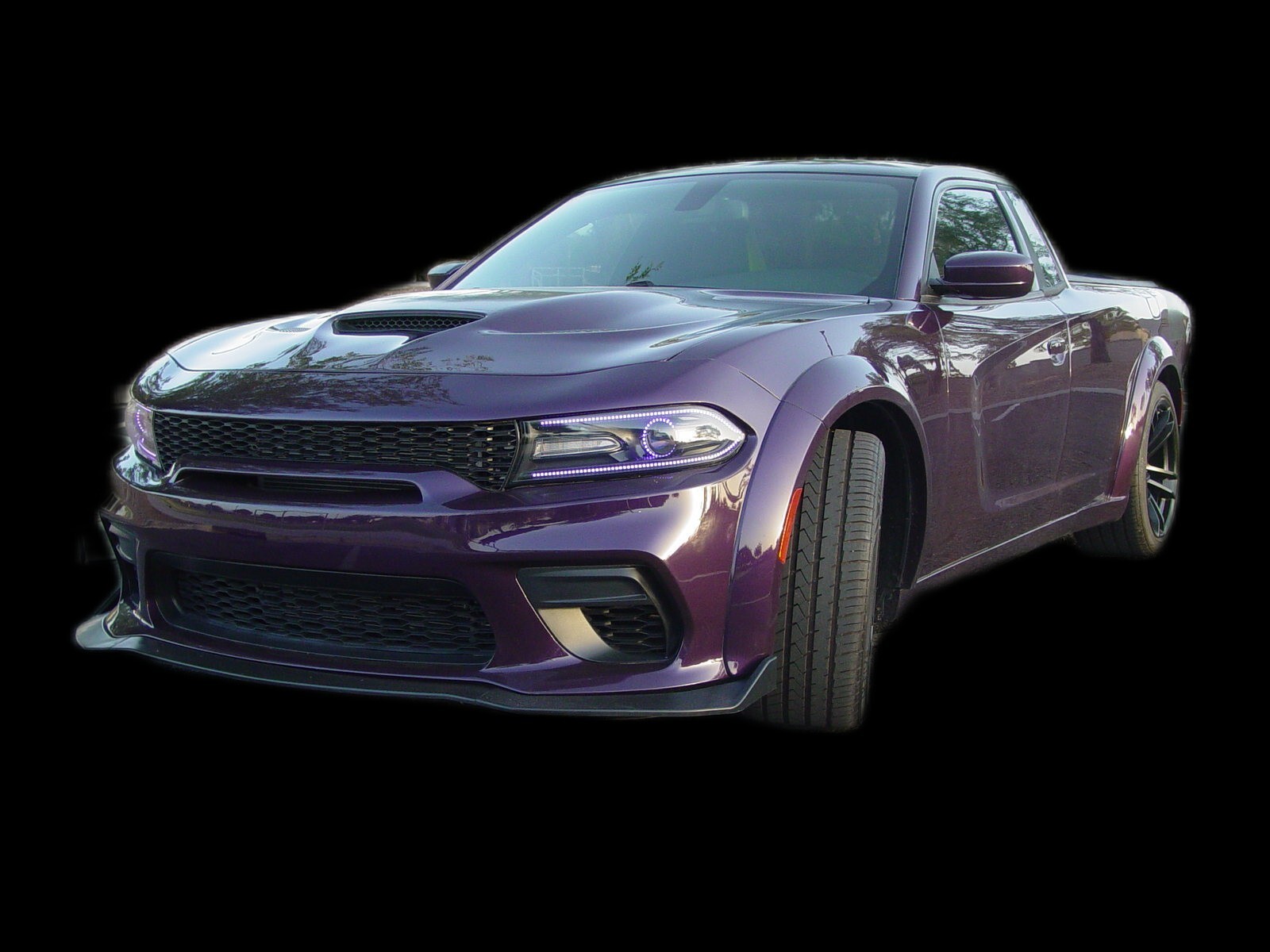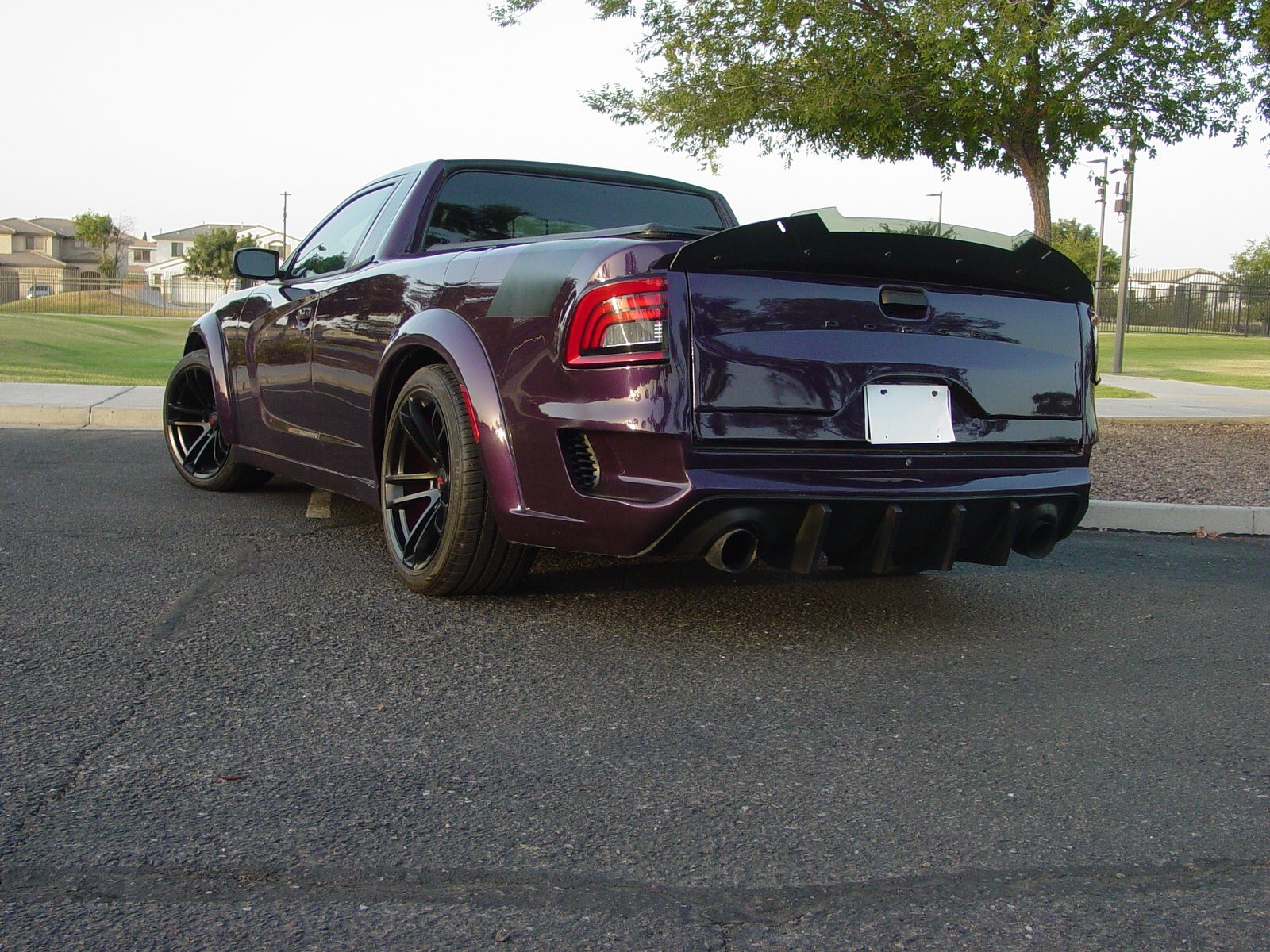 WOW check out this bad ass one of custom charger pickup that turns heads gives thumbs up and smiles everywhere it goes. The project was called operation THUNDER which started with a 2015 dodge charger as a donor for the build. The charger was cut down to a bare chassis leaving only the cowl, both doors, and half of half the roof with no engine or interior. The total front clip is all brand new 2023 charger hell cat and the rear is a Smyth Performance basic kit. The design of the basic kit did not match up with the hell cat wide body front, so a new design concept was created. The new design uses features of the hell cat car, so a lot of work went into the final design to make a working tail gate. The design after being drawn up was built using foam crafted too the design a fiber glass mold was made to make the new parts. The kit rear section was replaced with new parts a very time-consuming process. The final product after several tweaks ended up blending the hell cat look to the rear creating one bad to to bone ride. The chosen color is of course hell razin purple with new leather two tone Katskin covered sports performance seats with lime trim accents and carbon fiber steering wheel. The replacement engine is av6 3.6l@300hp with 8 speed auto trans from a 2018 charger with 30000 miles I have paperwork on it and vin#. The engine was updated by adding a cold air system, high performance output coils, and a cat back performance exhaust. The list of new parts starts with windshield, back glass, brake rotors, brake pads, front struts, rear springs, rear springs, alternator, ac pump, ac condenser, water pump, making in close to a new car. The wheels and tires are hell cat spec 20x11 to match the wide body. The end results are a factory looking package with style and aggressive stance. The best part about this bad ass charger pickup it is ONE OF ONE and could be yours. THANKS