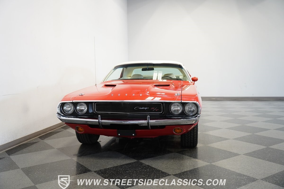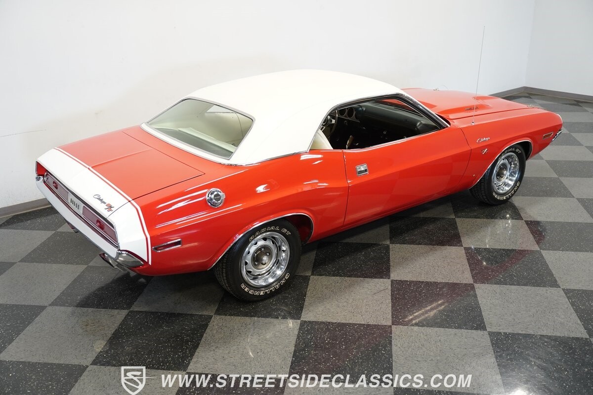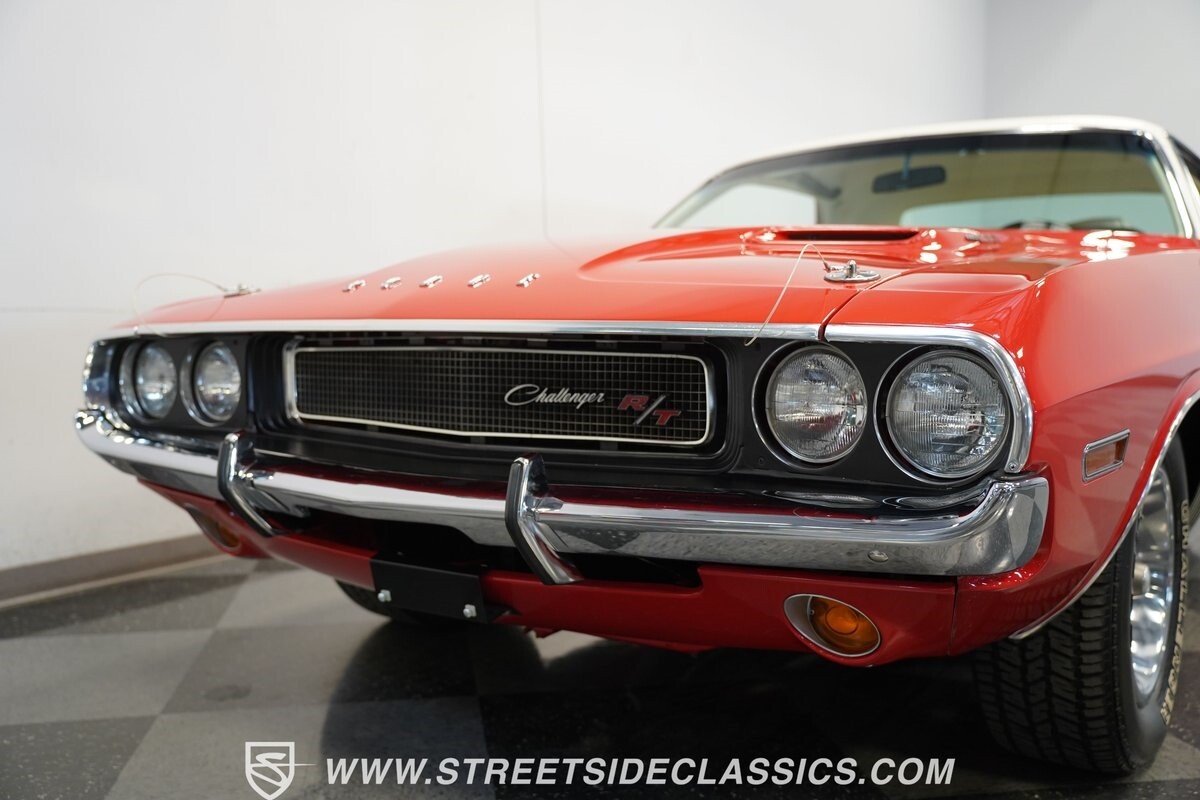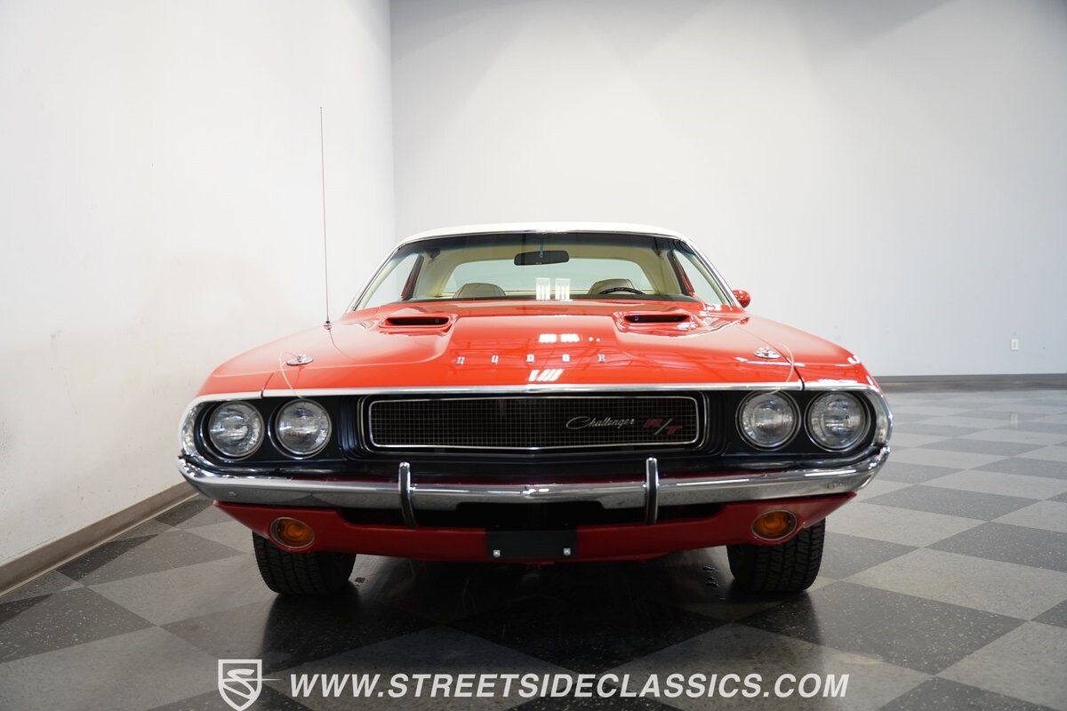 Code stampings on the fender tag indicate that this Challenger R/T was further equipped from the factory with power brakes, dual exhaust system with bright tips, hood tie-down pins, V9W code rear bumble bee stripe, bucket seats, center console with woodgrain trim, painted racing mirrors with driver's side remote adjustment, tachometer, Rallye gauge cluster and AM radio.