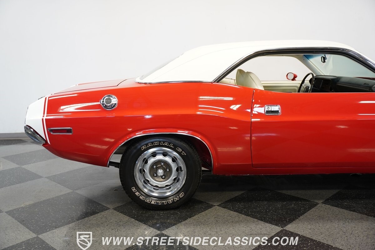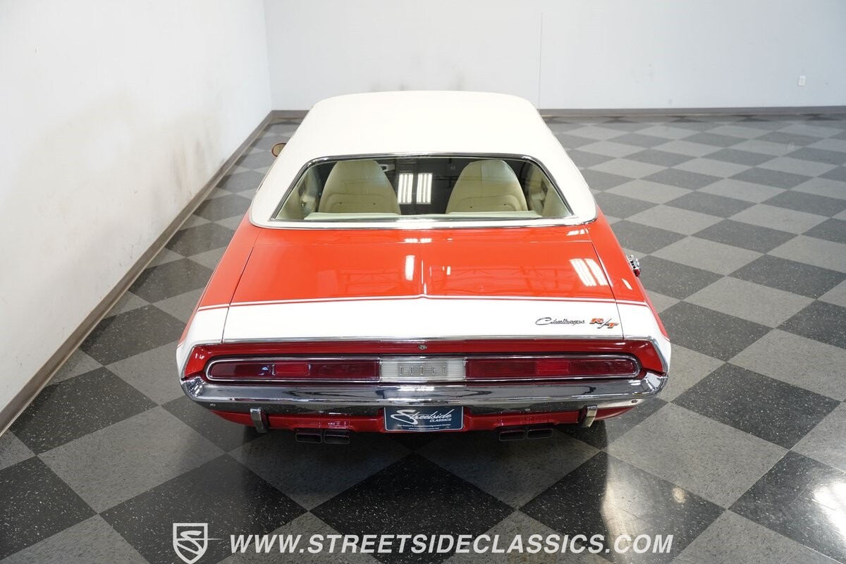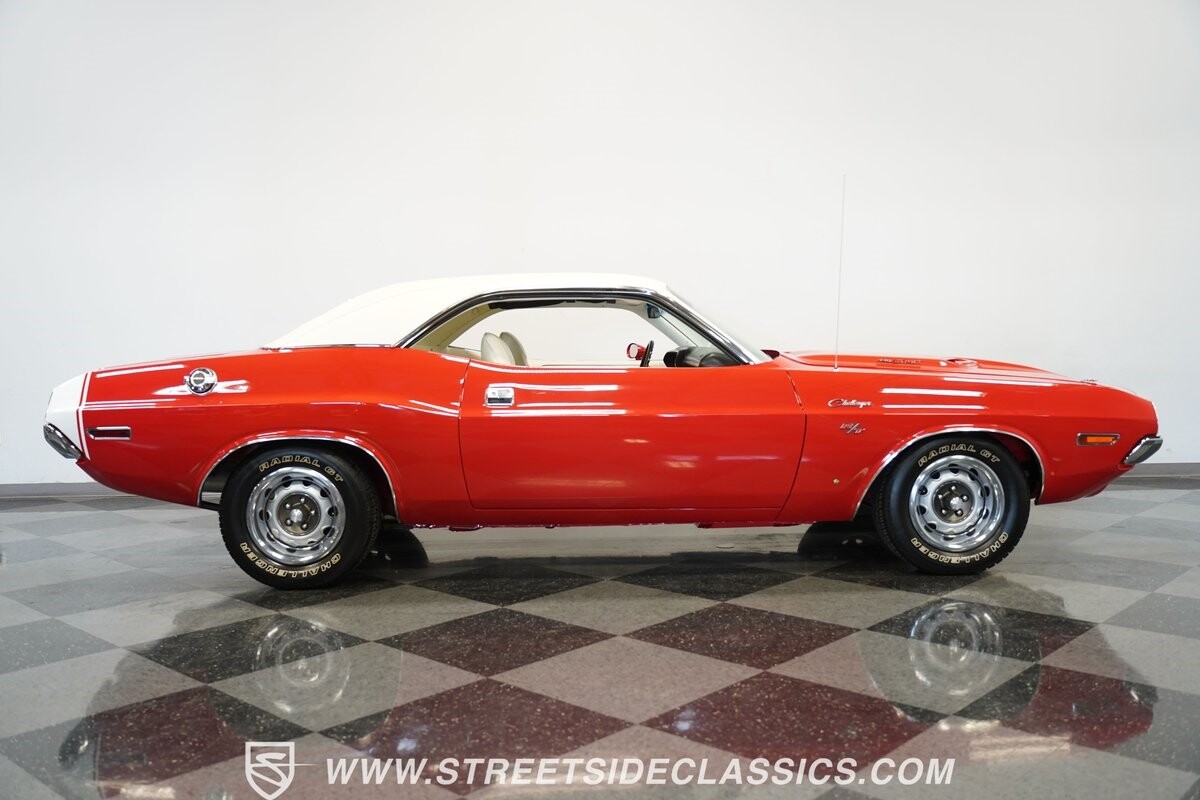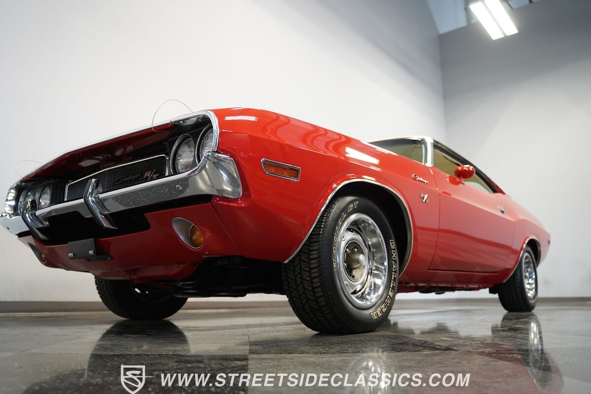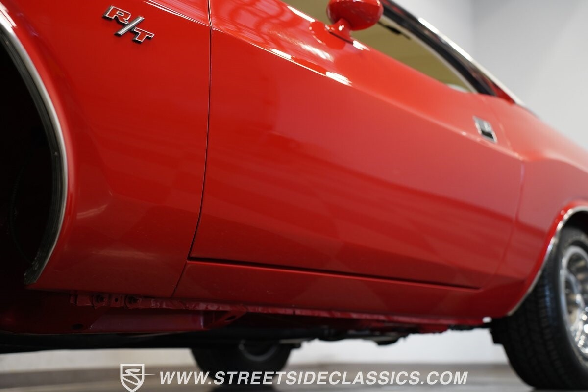 Code stampings on the fender tag indicate that this Challenger R/T was further equipped from the factory with power brakes, dual exhaust system with bright tips, hood tie-down pins, V9W code rear bumble bee stripe, bucket seats, center console with woodgrain trim, painted racing mirrors with driver's side remote adjustment, tachometer, Rallye gauge cluster and AM radio.
