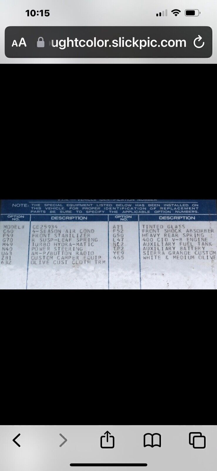 1972 GMC Sierra Grande 2500 Beautiful Inside and Out Very Rare Sierra Grande Fully Optioned Truck Original Olive Vinyl with Inserts Interior Code - 632 New Cooper Tires, Original GMC Wheels and Hubcaps, Dual Chrome Mirrors, Wood Inlay Trim, Front Bumperettes, Nice Chrome Inside and Out, Auxiliary Fuel Tank, Power Brakes, Power Steering, Original Factory Sierra Grande Package, Factory Optioned with Camper Equipment, Retractable Belts, Factory Cold A/C Converted to R-134A, Original Delco AM Strong Numbers Matching 400 Big Block V8 Engine, Smooth Shifting Turbo 400 Automatic Transmission, Factory Engine Bay, Brake Proportioning Valve, Dual Exhaust, Original Solid Floors, Original Owner's manual Original radio converted to fm and Bluetooth 900Seller's Notes