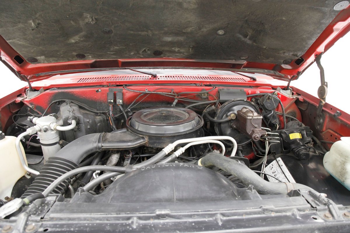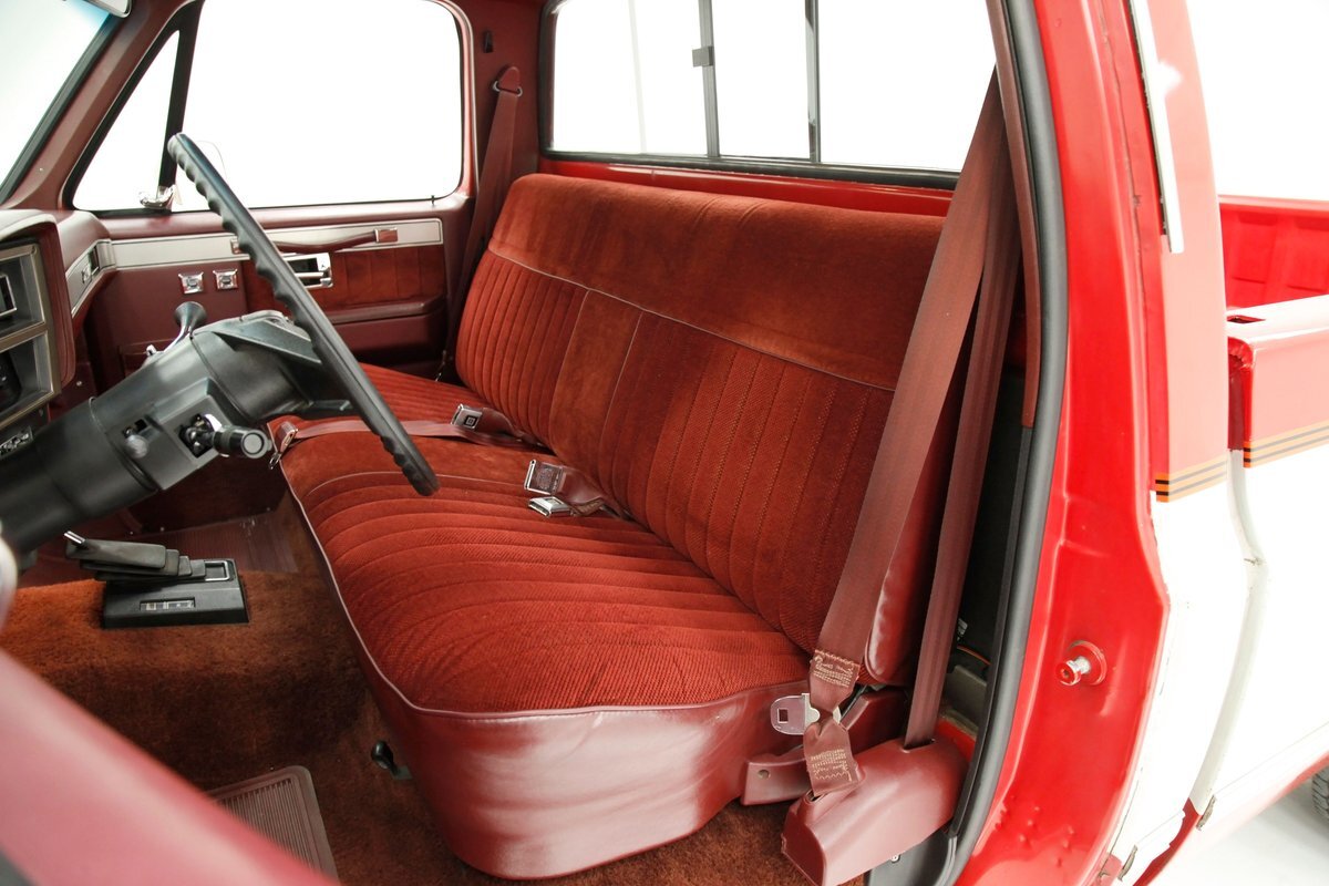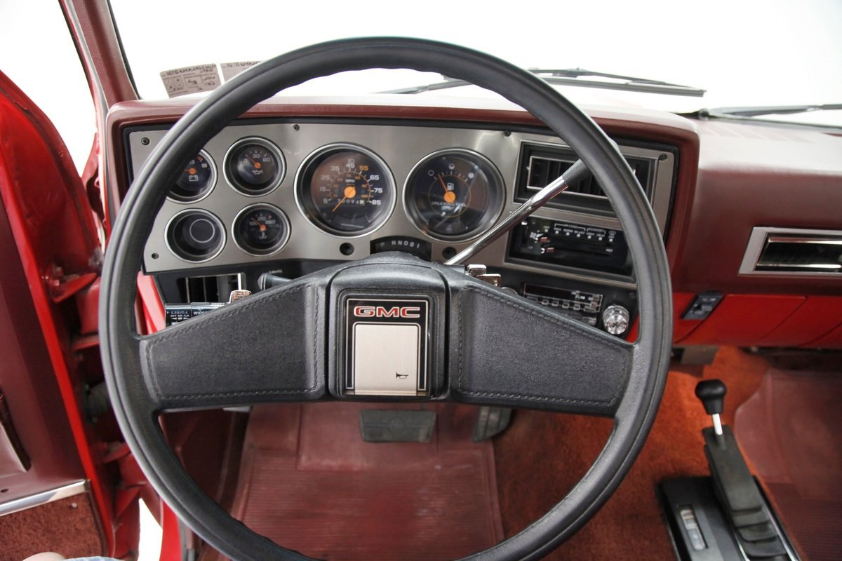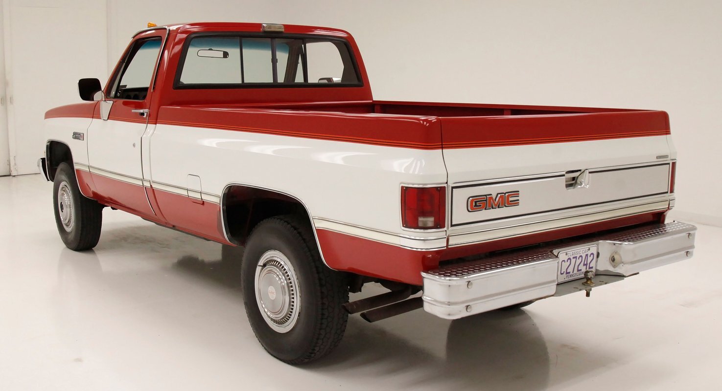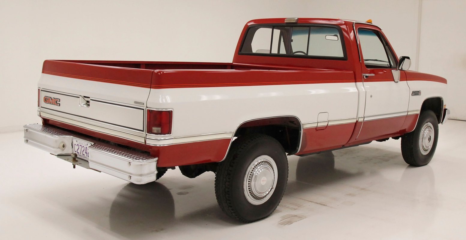 Known as the rounded line as tagged by GM, the lines appear to be more square and rectangle than anything else. This includes a rectangular blacked out chrome trimmed grille with stacked square headlights in square bezel panels, a deep red GMC badge, and a shiny bumper below. Straight bright red factory steel wraps all sides and the bed. framing the white painted side inserts and all support well minded gaps. Some thin stainless trimmings finish off the wheel wells and straight clean body lines, with stainless trimmings below and orangish red and black pinstriping above the white along with clean badges make up the slab steel sides. Black trimmings surround the glass and for a little extra bling the drip rails are highlighted with shiny stainless trimming as well as clearance lights on the roof of the cab. The bed is covered with more of the original red paint, non clear coated, with just a bit of fade but nary a dent or any signs of heavy usage. This factory paint covers the sides and tailgate all remaining clean and mar free. 15-inch steel wheels are covered with ventilated wheel covers and are wrapped by like new 235/80R15 blackwall Firestone all-weather deep tread tires.