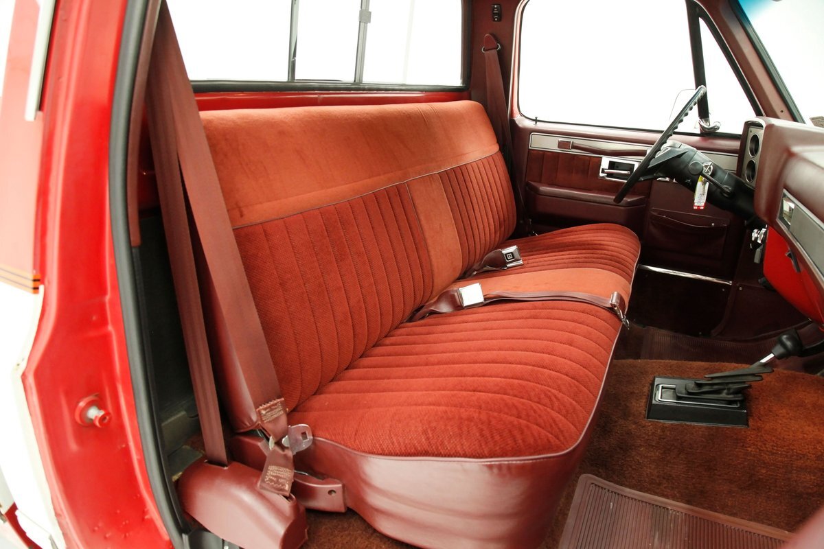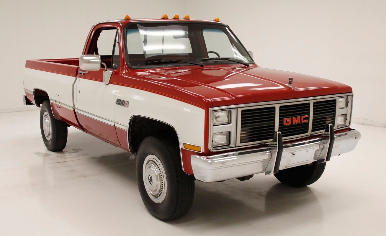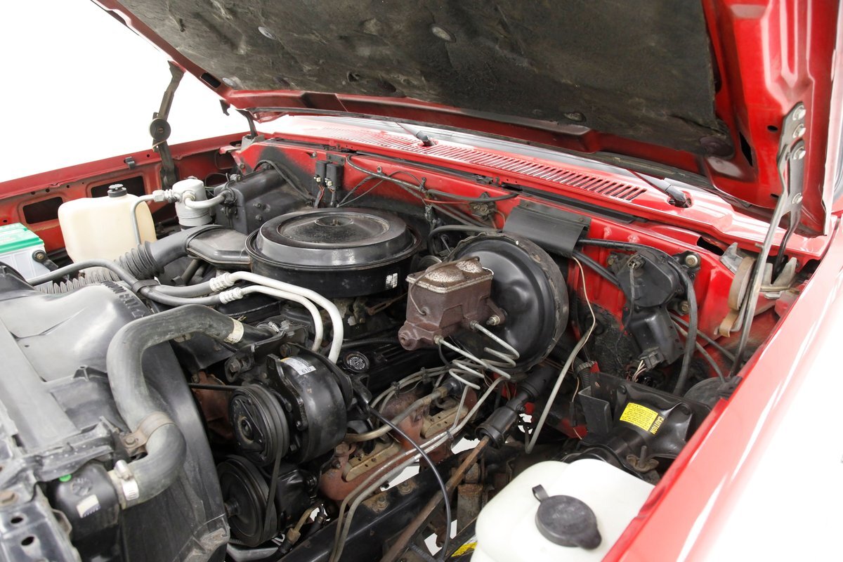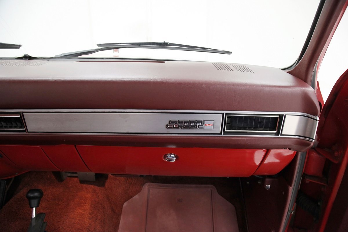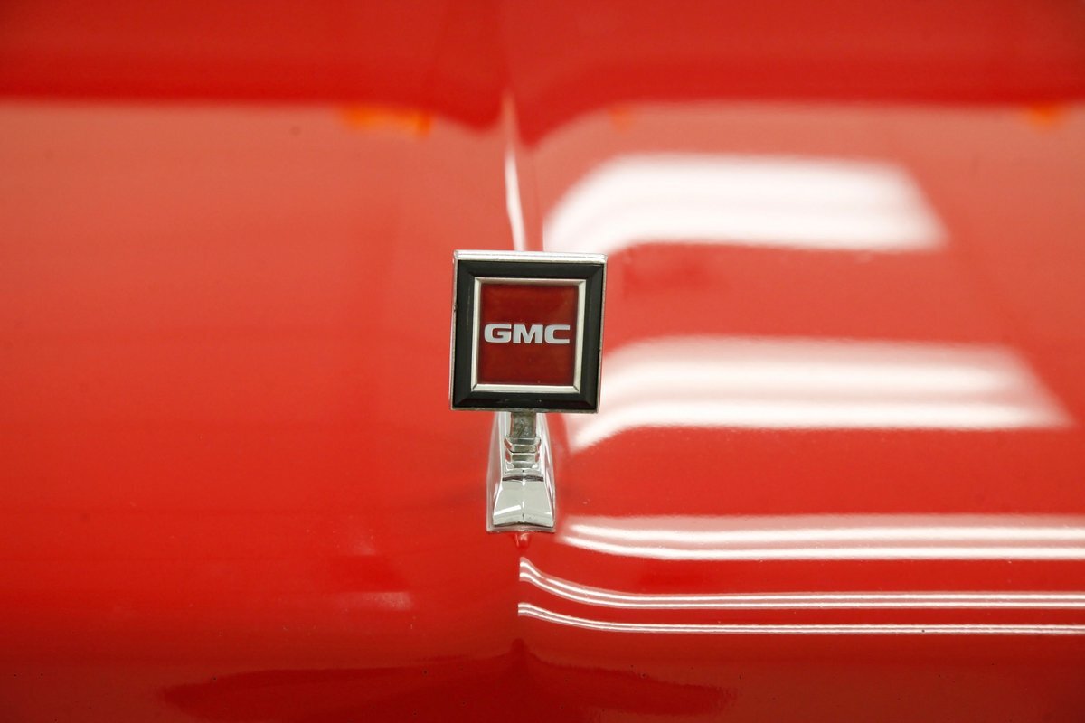Known as the rounded line as tagged by GM, the lines appear to be more square and rectangle than anything else. This includes a rectangular blacked out chrome trimmed grille with stacked square headlights in square bezel panels, a deep red GMC badge, and a shiny bumper below. Straight bright red factory steel wraps all sides and the bed. framing the white painted side inserts and all support well minded gaps. Some thin stainless trimmings finish off the wheel wells and straight clean body lines, with stainless trimmings below and orangish red and black pinstriping above the white along with clean badges make up the slab steel sides. Black trimmings surround the glass and for a little extra bling the drip rails are highlighted with shiny stainless trimming as well as clearance lights on the roof of the cab. The bed is covered with more of the original red paint, non clear coated, with just a bit of fade but nary a dent or any signs of heavy usage. This factory paint covers the sides and tailgate all remaining clean and mar free. 15-inch steel wheels are covered with ventilated wheel covers and are wrapped by like new 235/80R15 blackwall Firestone all-weather deep tread tires.