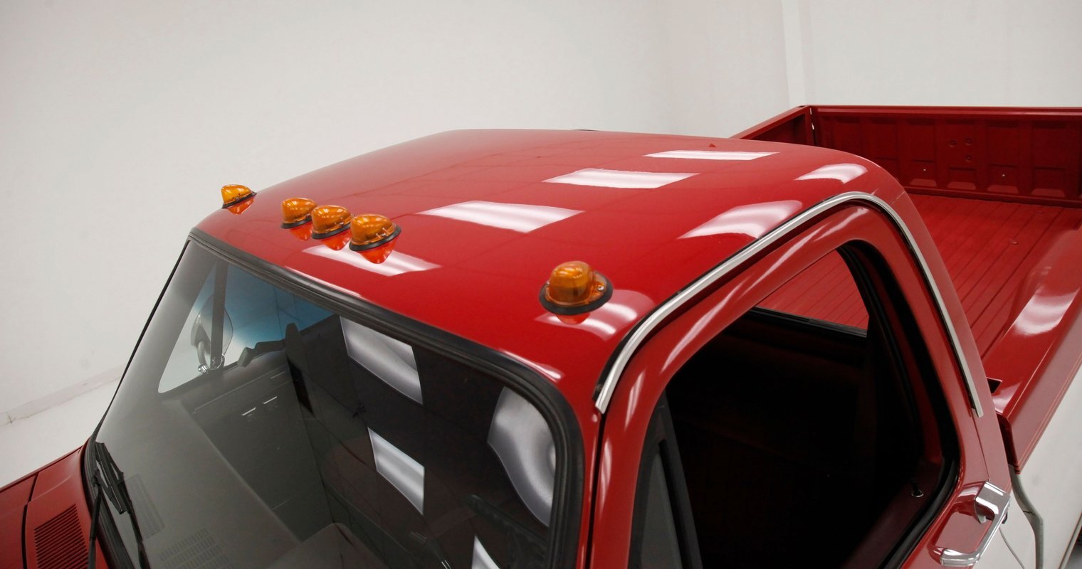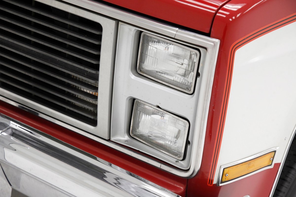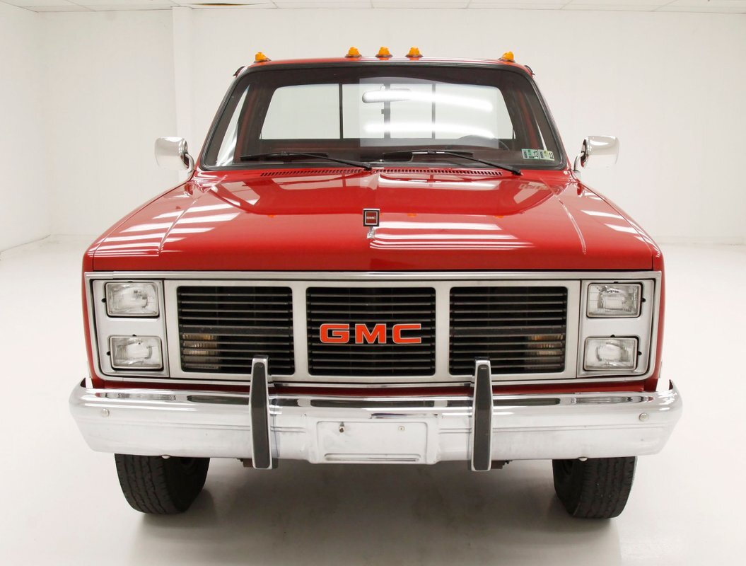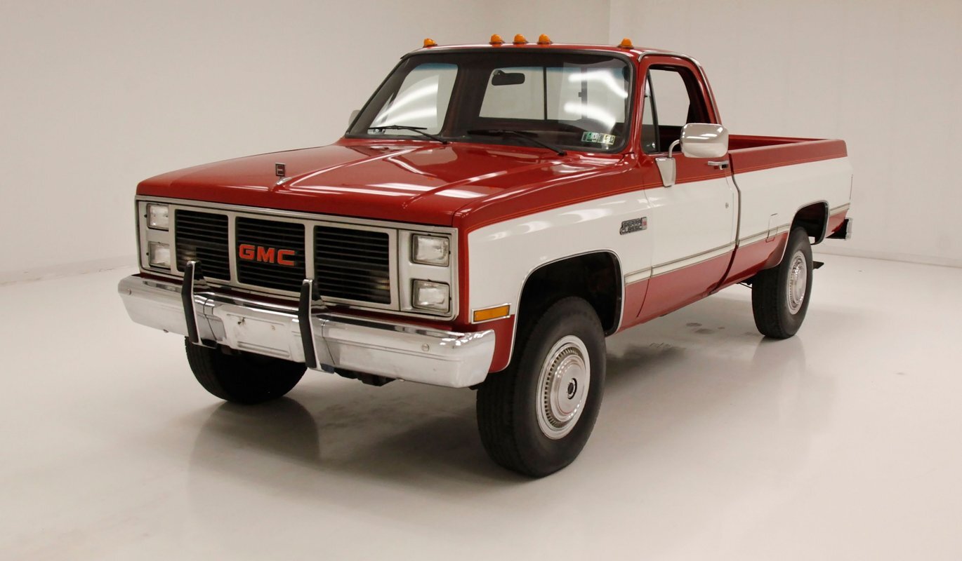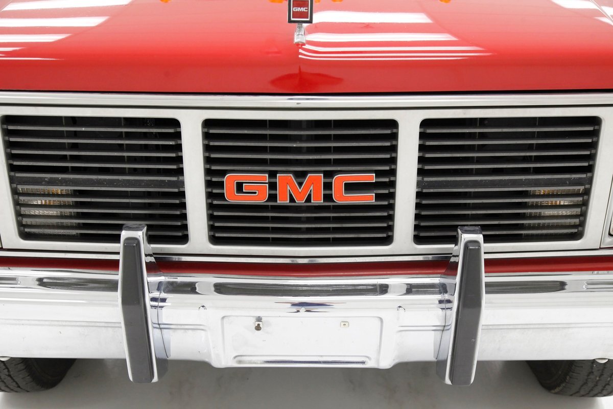 Known as the rounded line as tagged by GM, the lines appear to be more square and rectangle than anything else. This includes a rectangular blacked out chrome trimmed grille with stacked square headlights in square bezel panels, a deep red GMC badge, and a shiny bumper below. Straight bright red factory steel wraps all sides and the bed. framing the white painted side inserts and all support well minded gaps. Some thin stainless trimmings finish off the wheel wells and straight clean body lines, with stainless trimmings below and orangish red and black pinstriping above the white along with clean badges make up the slab steel sides. Black trimmings surround the glass and for a little extra bling the drip rails are highlighted with shiny stainless trimming as well as clearance lights on the roof of the cab. The bed is covered with more of the original red paint, non clear coated, with just a bit of fade but nary a dent or any signs of heavy usage. This factory paint covers the sides and tailgate all remaining clean and mar free. 15-inch steel wheels are covered with ventilated wheel covers and are wrapped by like new 235/80R15 blackwall Firestone all-weather deep tread tires.