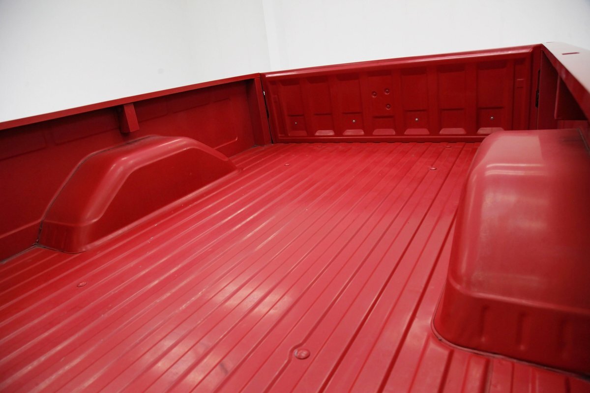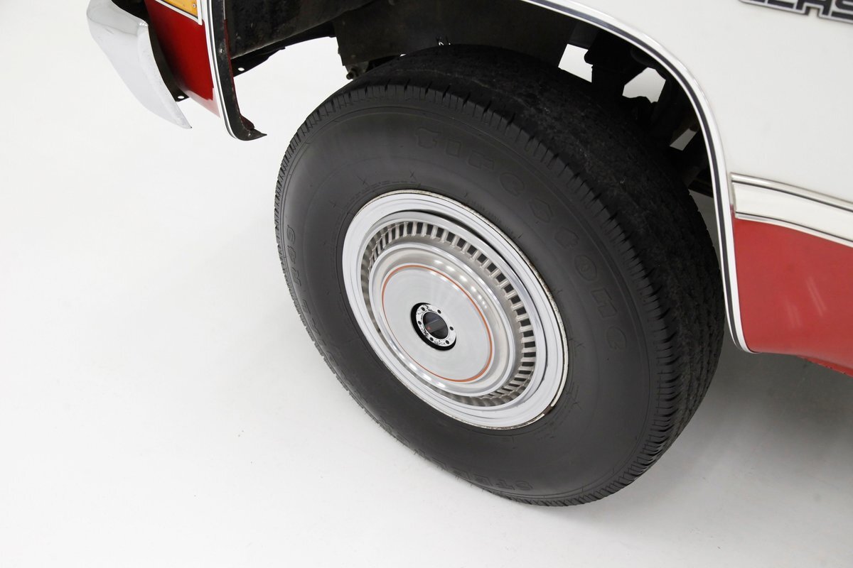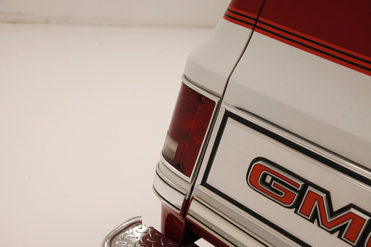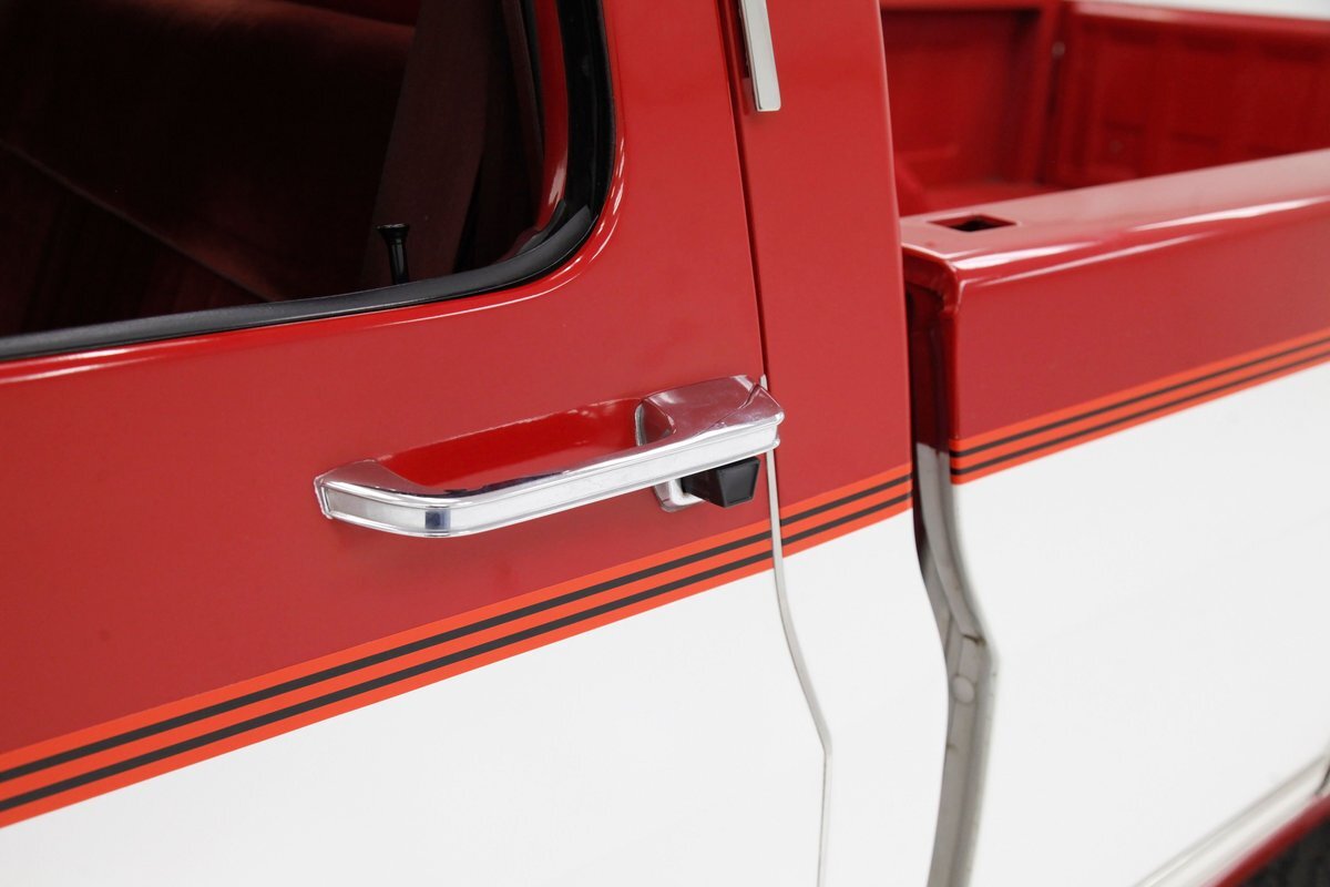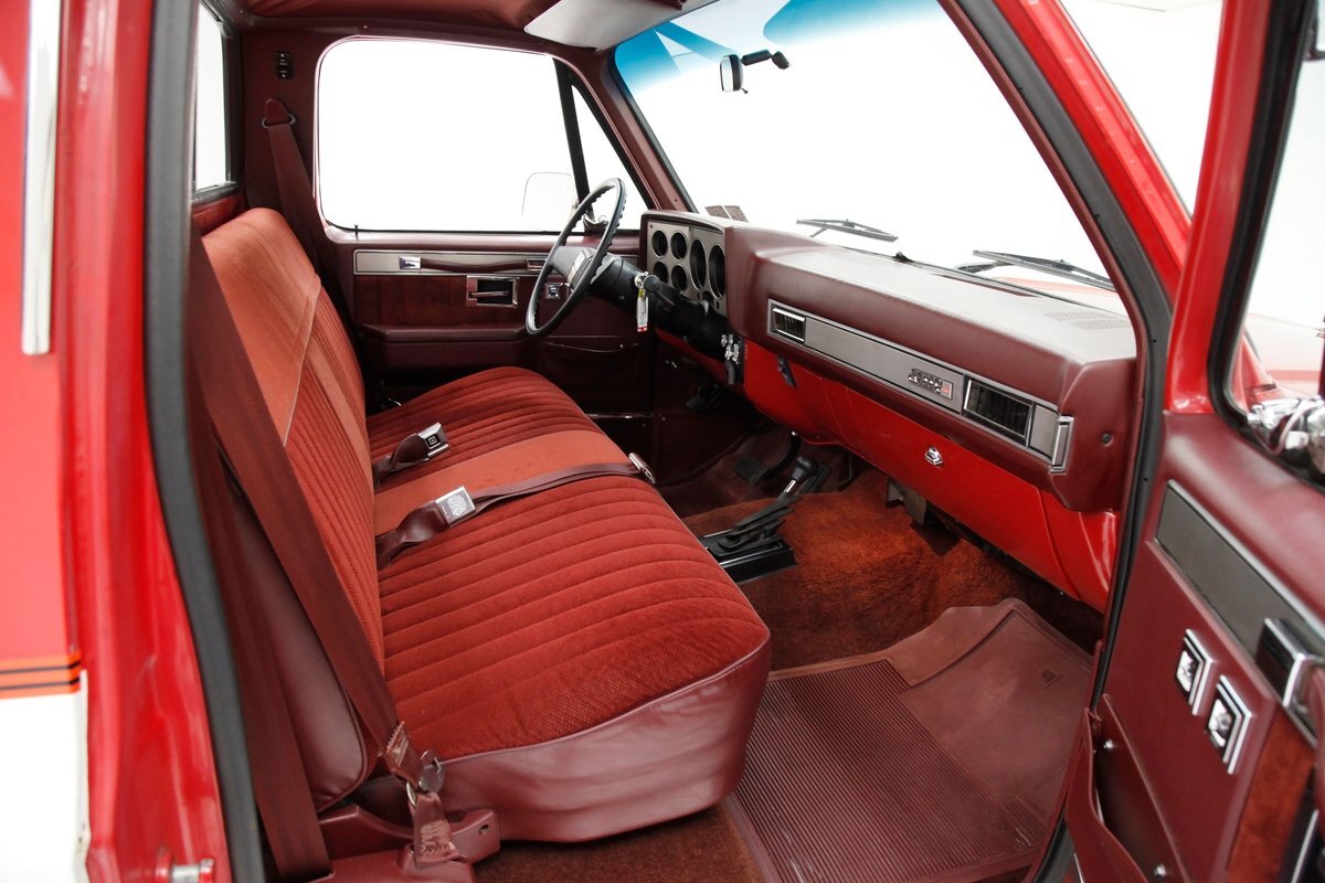Known as the rounded line as tagged by GM, the lines appear to be more square and rectangle than anything else. This includes a rectangular blacked out chrome trimmed grille with stacked square headlights in square bezel panels, a deep red GMC badge, and a shiny bumper below. Straight bright red factory steel wraps all sides and the bed. framing the white painted side inserts and all support well minded gaps. Some thin stainless trimmings finish off the wheel wells and straight clean body lines, with stainless trimmings below and orangish red and black pinstriping above the white along with clean badges make up the slab steel sides. Black trimmings surround the glass and for a little extra bling the drip rails are highlighted with shiny stainless trimming as well as clearance lights on the roof of the cab. The bed is covered with more of the original red paint, non clear coated, with just a bit of fade but nary a dent or any signs of heavy usage. This factory paint covers the sides and tailgate all remaining clean and mar free. 15-inch steel wheels are covered with ventilated wheel covers and are wrapped by like new 235/80R15 blackwall Firestone all-weather deep tread tires.