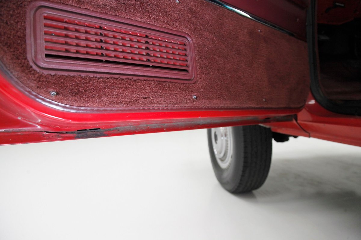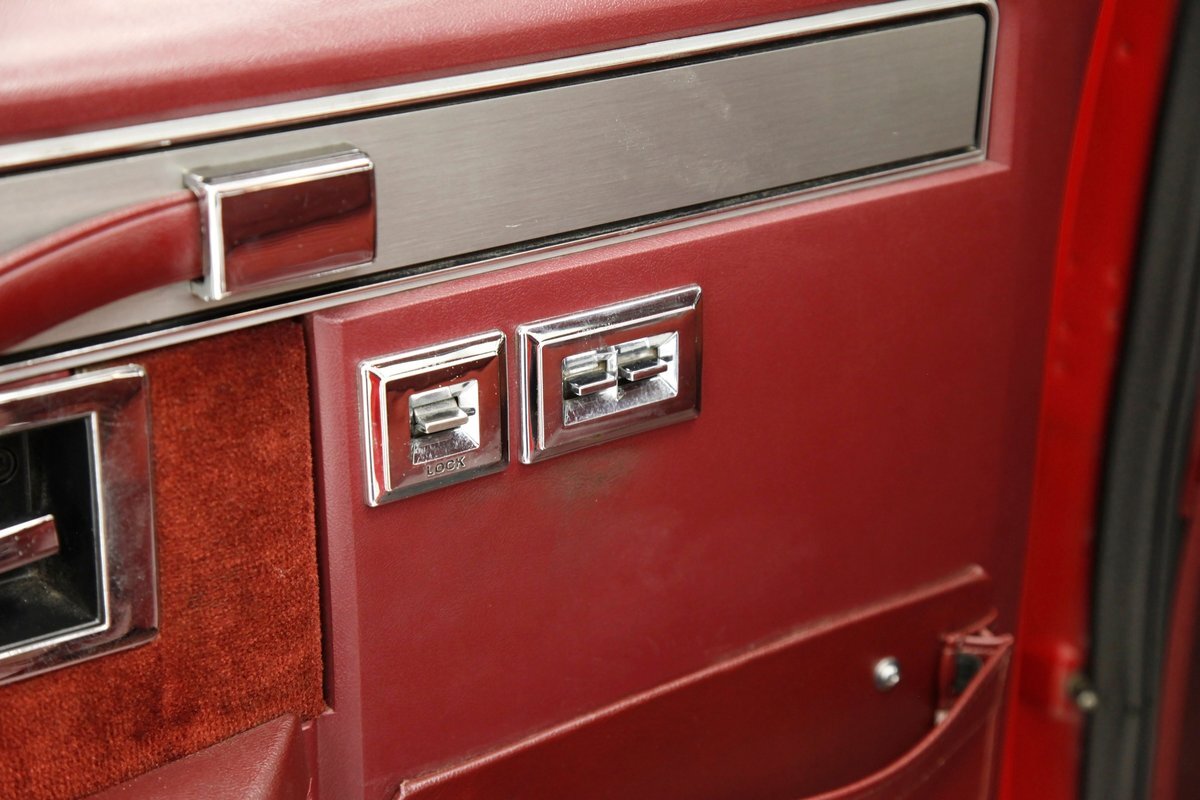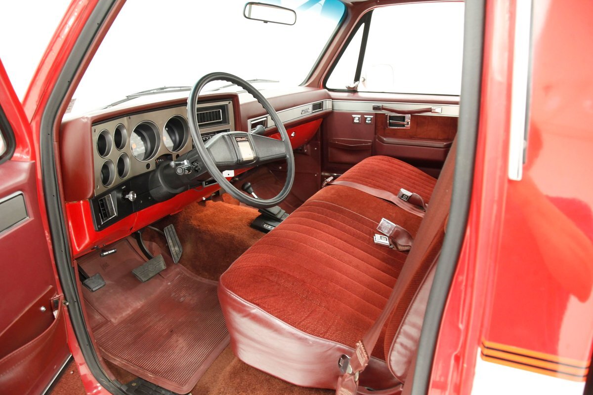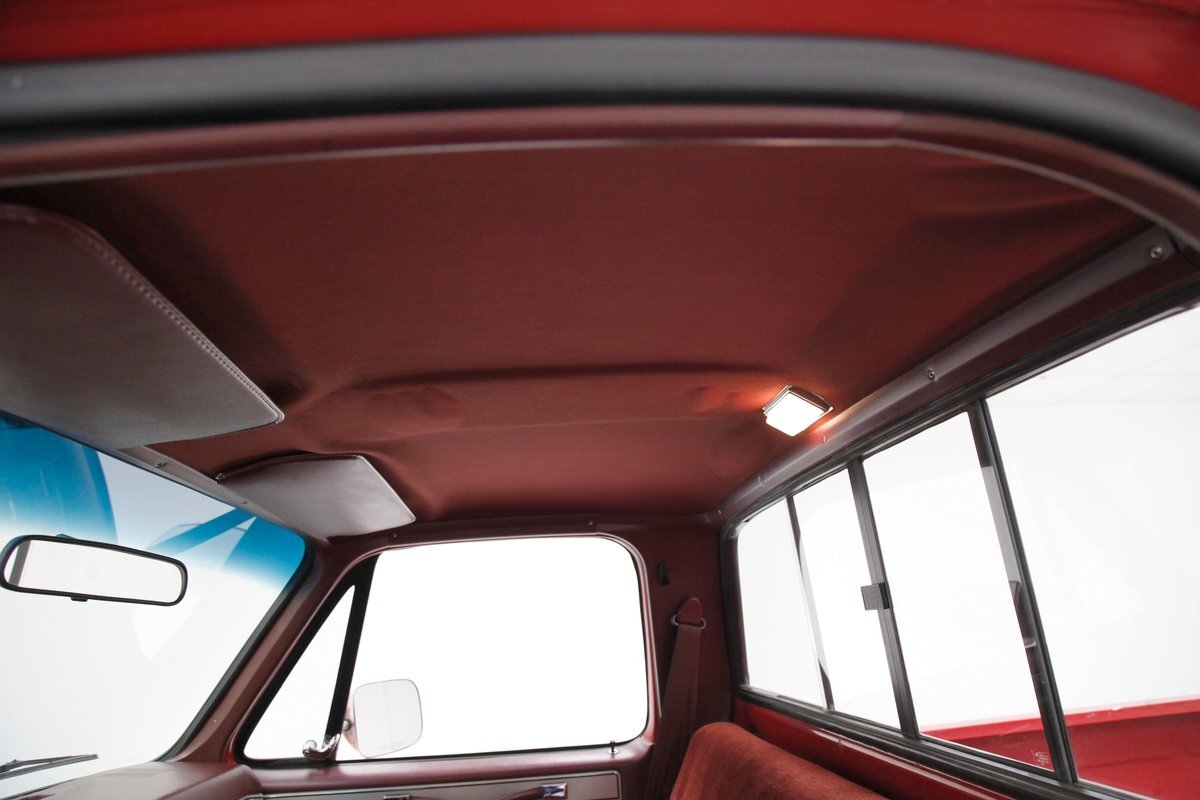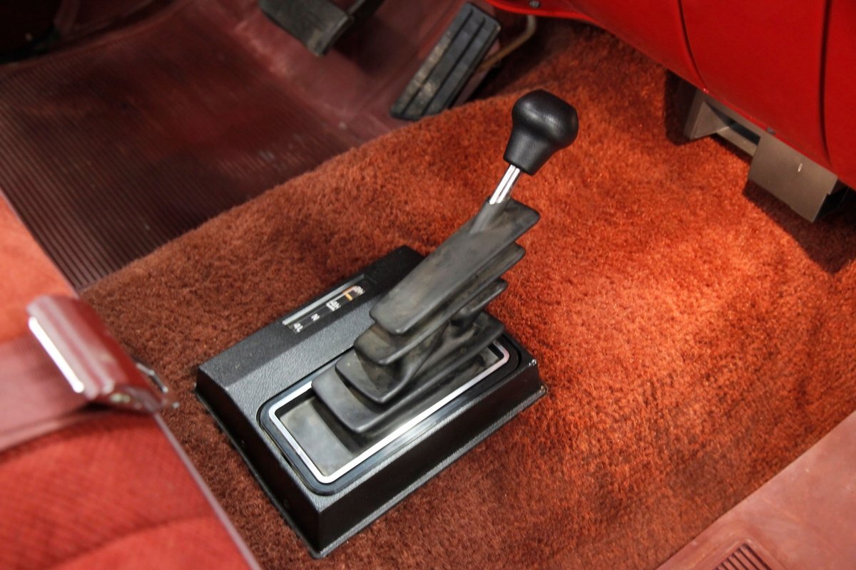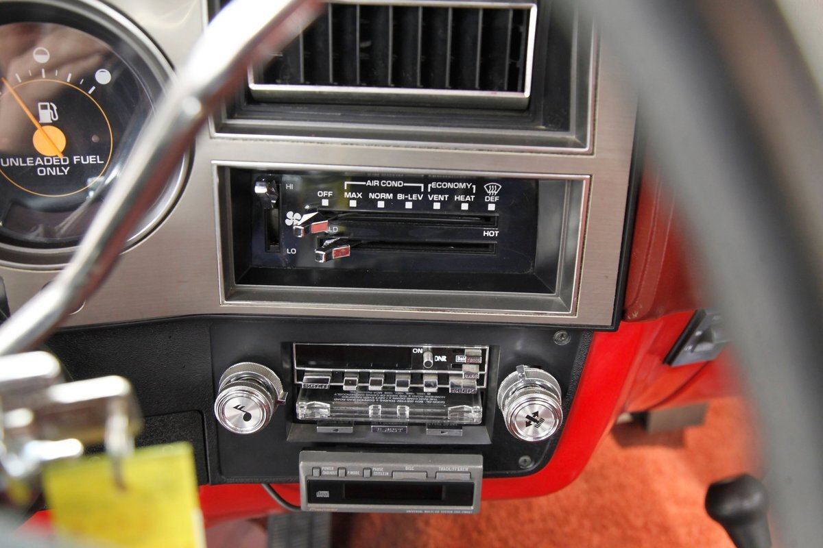 Red molded vinyl buttons up the door panels and these have a nicely contrasting brushed aluminum insert that holds the door pull and vies for space against padded vinyl armrests and a broadcloth insert. This panel is trimmed with a chrome delineation strip and down below is a carpeted band in red as well as chrome toggles for the power windows and locks. The original burgundy cloth bench seat with smooth dark red vinyl bolsters on the sides and tuck and roll cushions that make up the seating. The original dash is intact and looking clean with a multitude of inset round gauges within a brushed aluminum panel and a black plastic band is below and holds the headlight pull and the original AM/FM/Cassette stereo and an added Pioneer CD controller. The dash top is clean and shows no cracking or distortions and the lower is all steel in body matching red. Above is a lightly sagging red broadcloth headliner, and on the floors is clean medium pile red carpet with the transfer case shifter in the middle within its black housing.