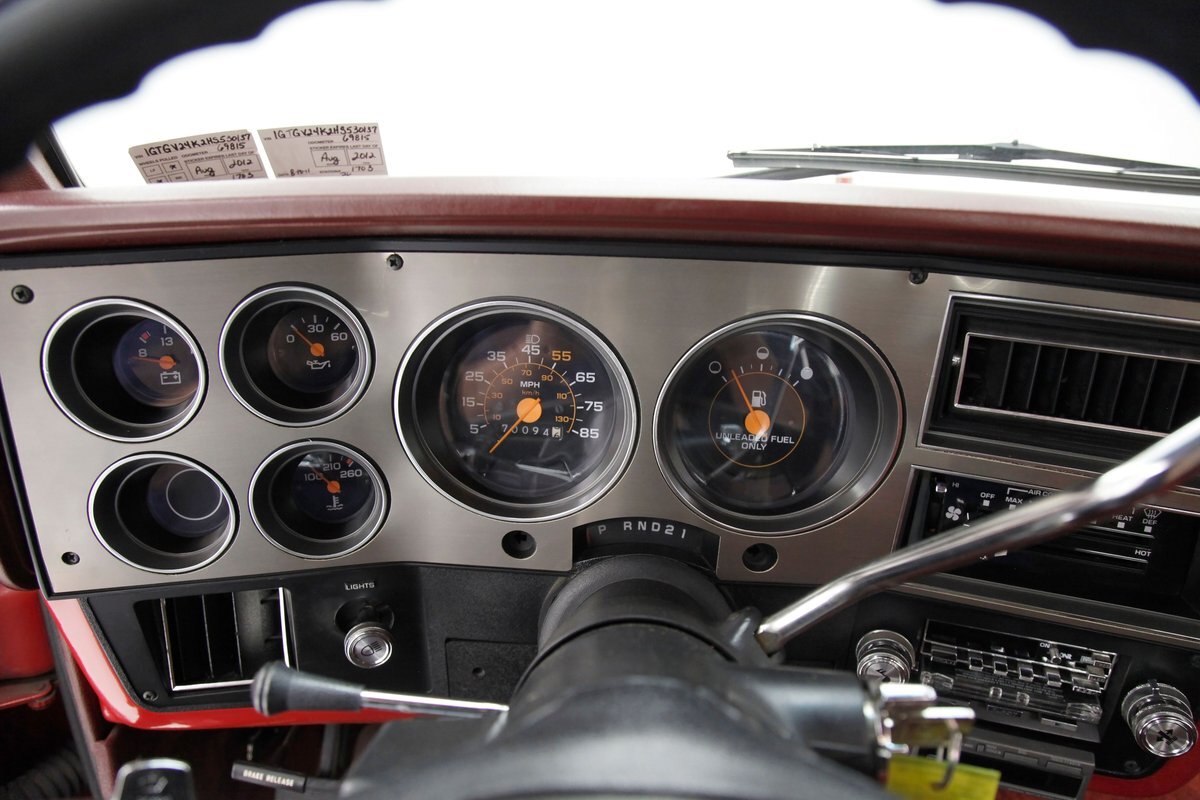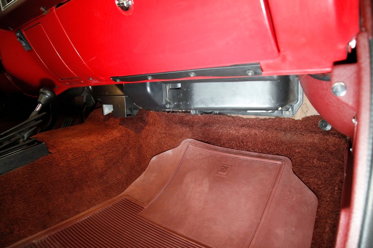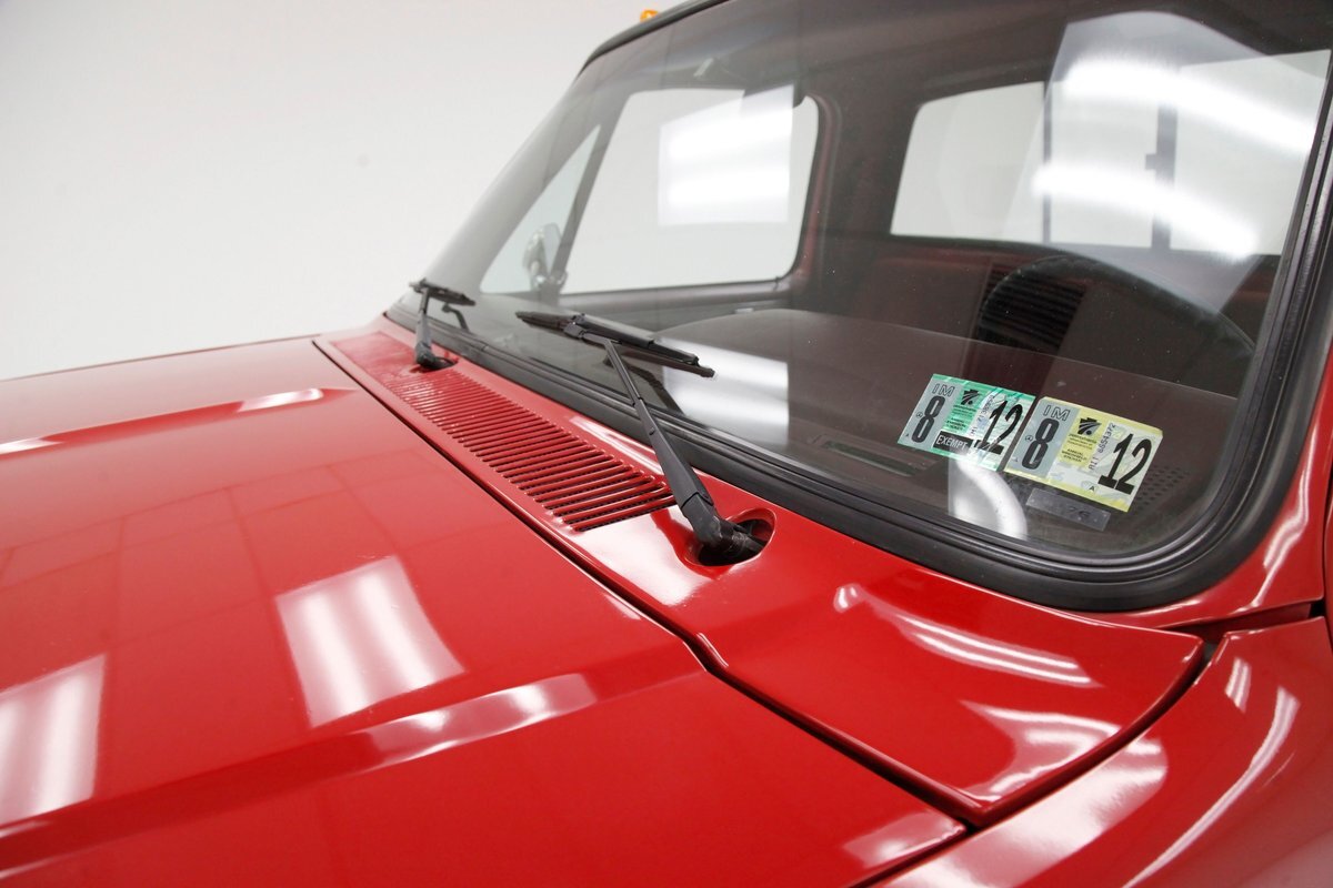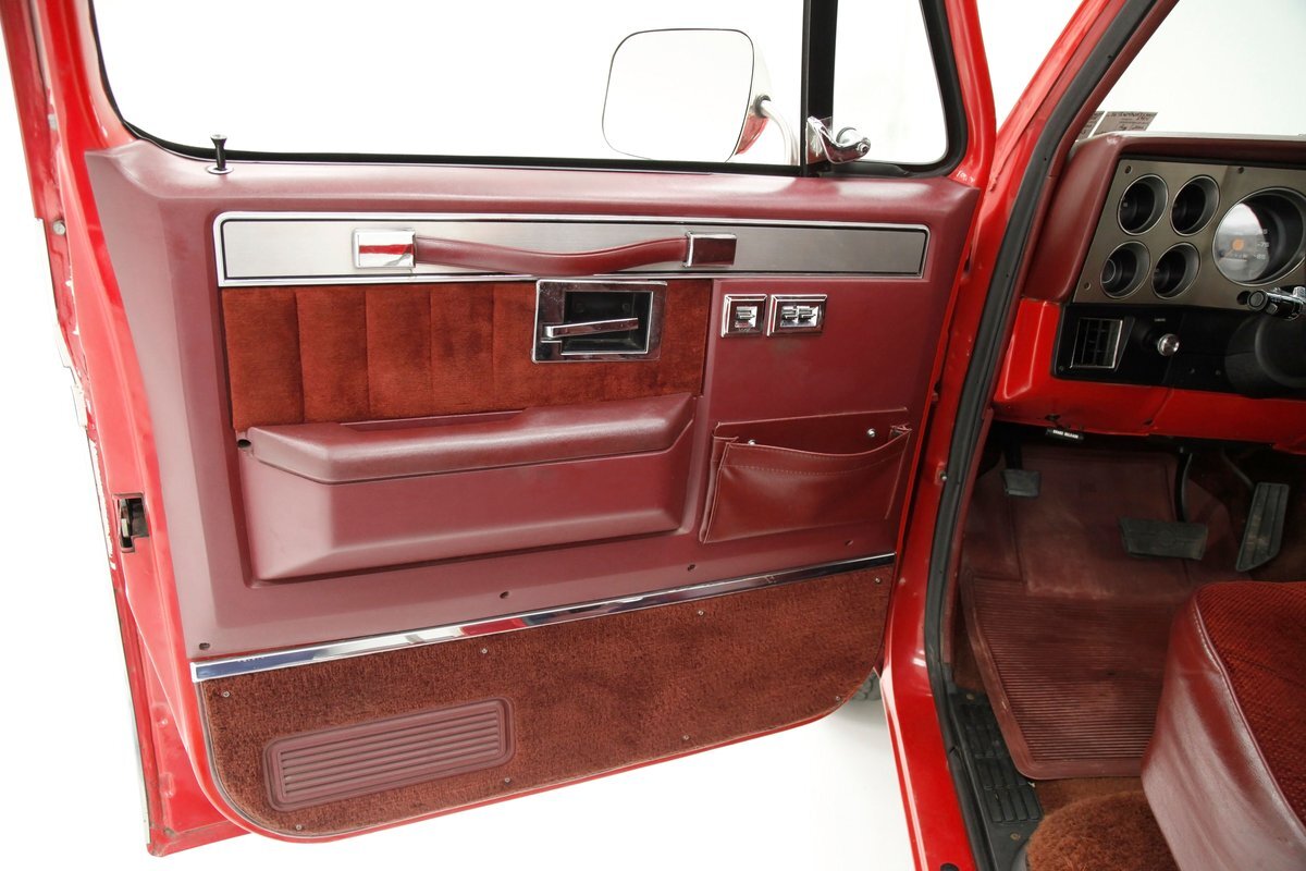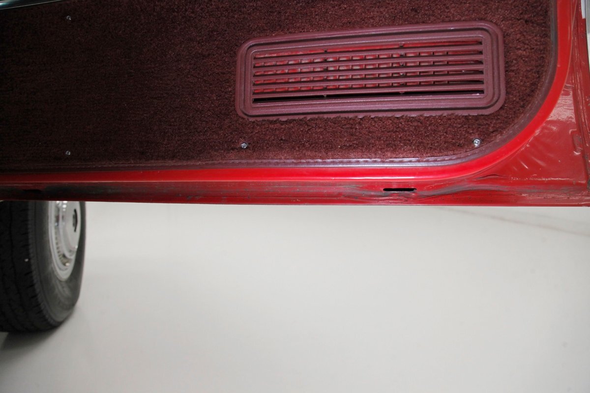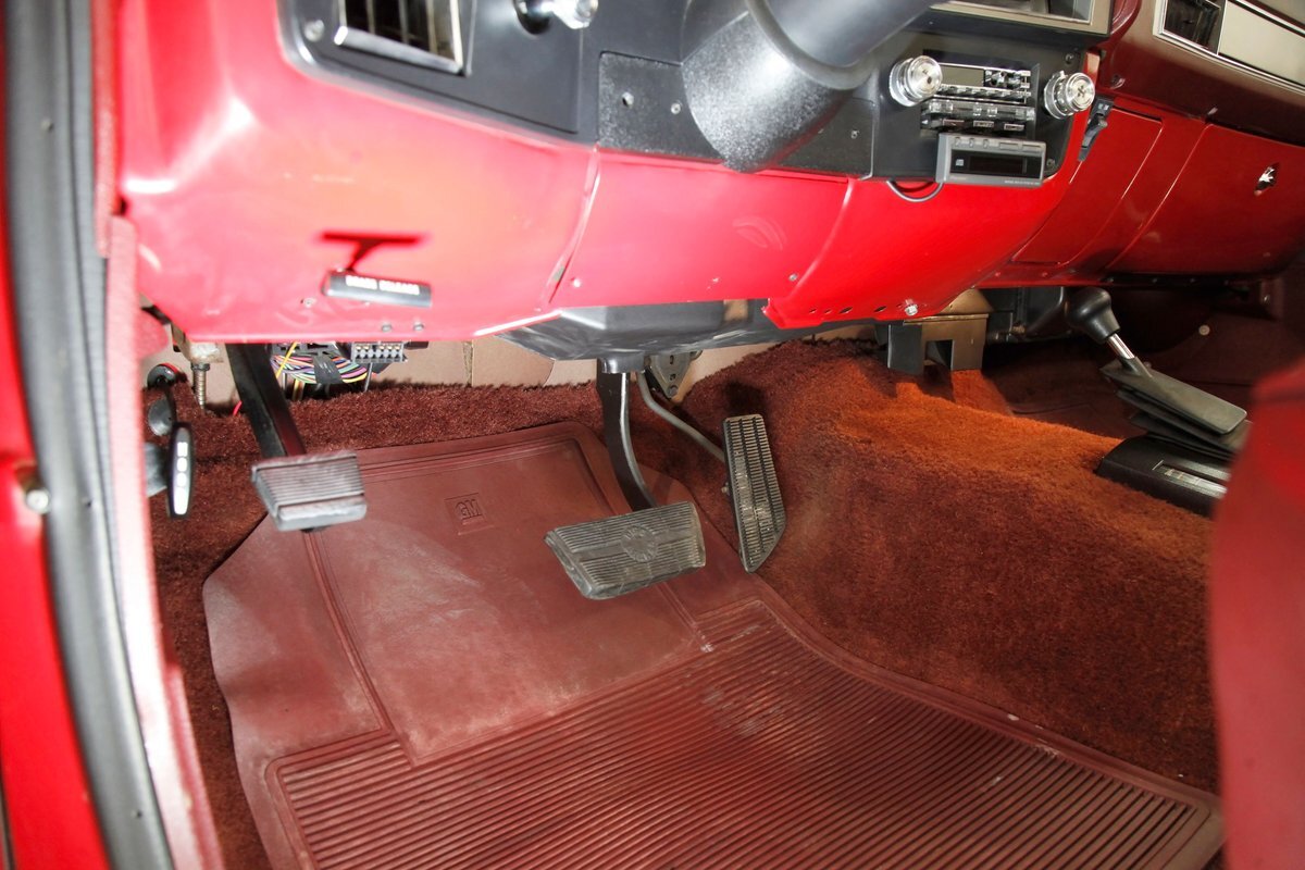 Red molded vinyl buttons up the door panels and these have a nicely contrasting brushed aluminum insert that holds the door pull and vies for space against padded vinyl armrests and a broadcloth insert. This panel is trimmed with a chrome delineation strip and down below is a carpeted band in red as well as chrome toggles for the power windows and locks. The original burgundy cloth bench seat with smooth dark red vinyl bolsters on the sides and tuck and roll cushions that make up the seating. The original dash is intact and looking clean with a multitude of inset round gauges within a brushed aluminum panel and a black plastic band is below and holds the headlight pull and the original AM/FM/Cassette stereo and an added Pioneer CD controller. The dash top is clean and shows no cracking or distortions and the lower is all steel in body matching red. Above is a lightly sagging red broadcloth headliner, and on the floors is clean medium pile red carpet with the transfer case shifter in the middle within its black housing.