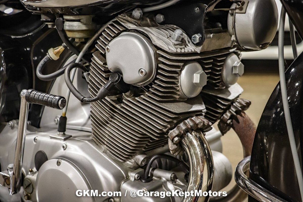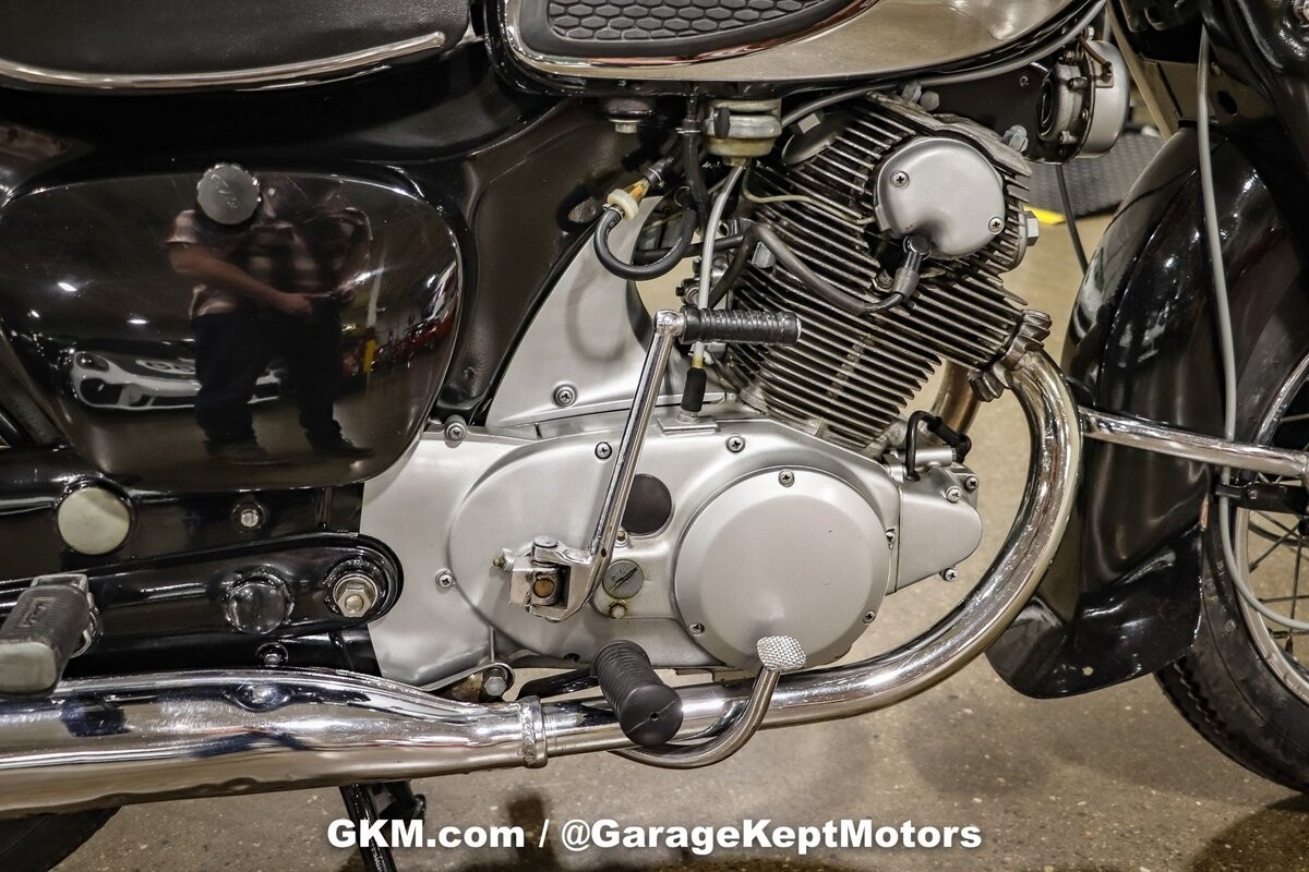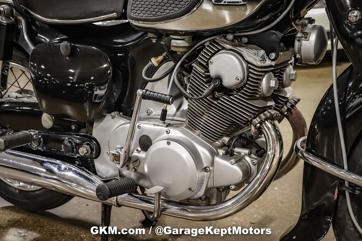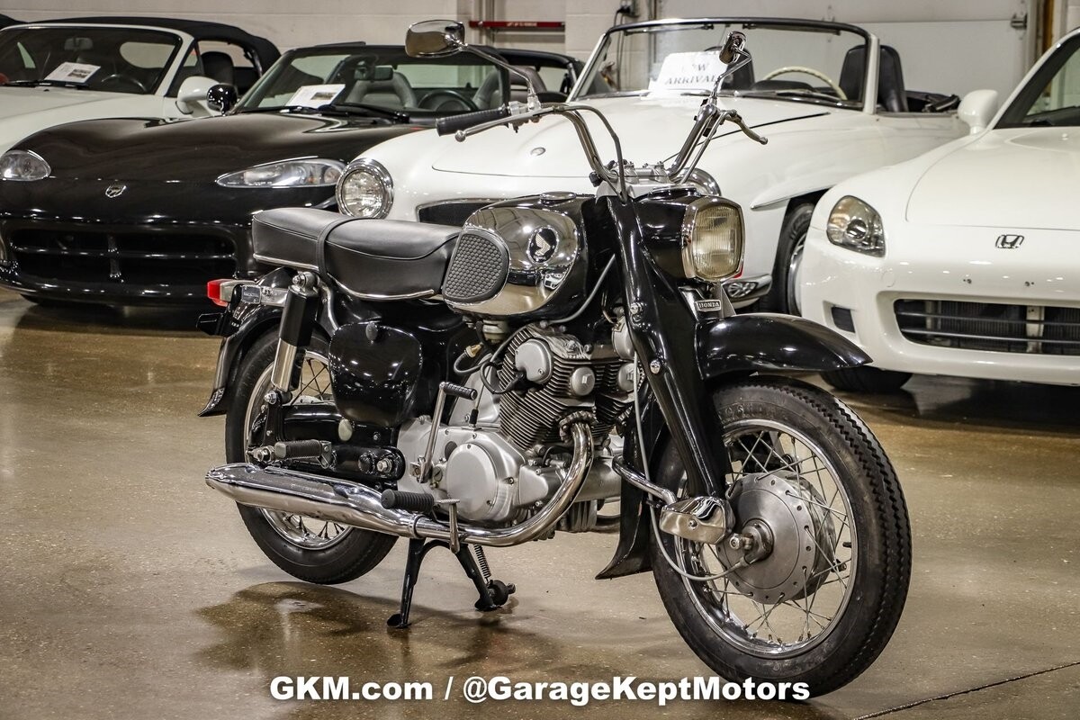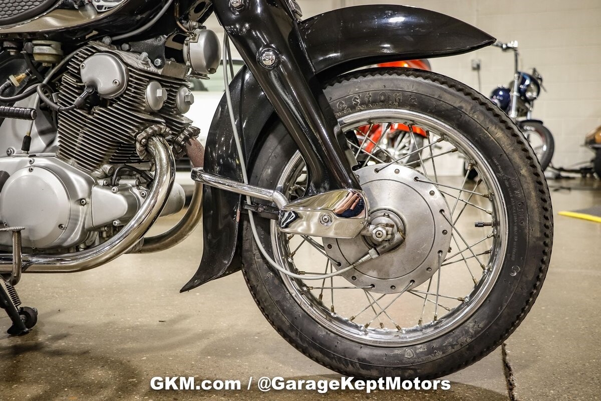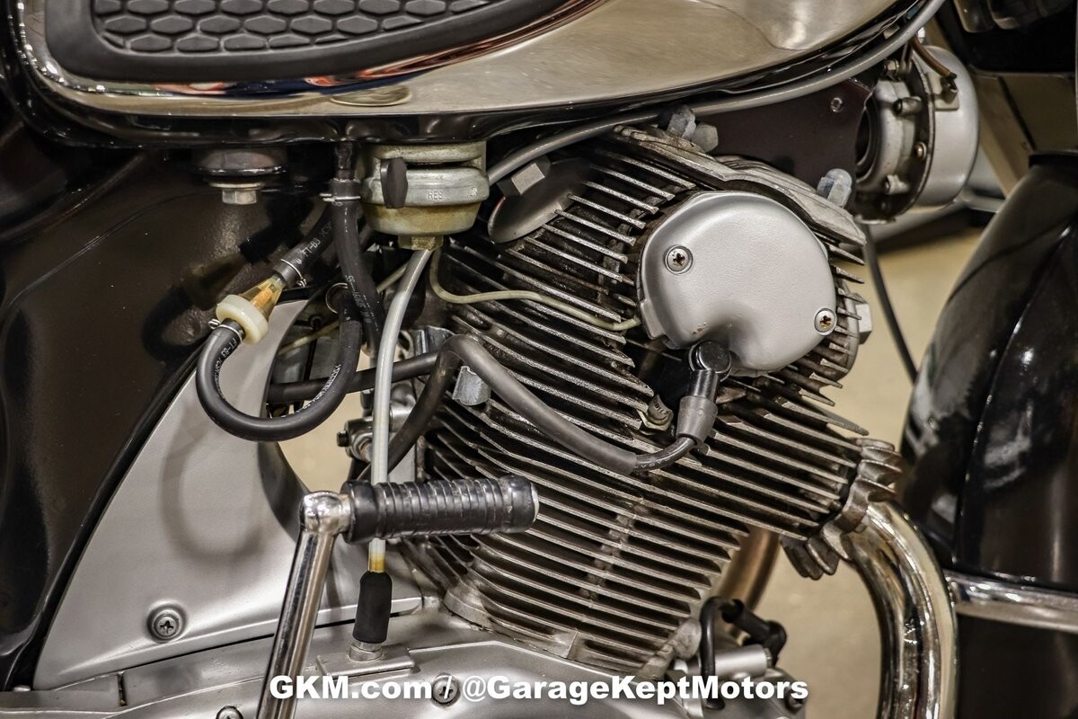 This motorcycle has been lightly restored and is largely in original condition and a very clean vintage motorcycle, originally from California with 27,000 miles on it. It is powered by a 305cc air-cooled OHC parallel twin-cylinder engine that is factory rated at 23hp @ 7,500rpm. Weighing just 350lbs this bike accelerates quickly to a top speed of 90mph. The lightweight of this motorcycle is due to a frame made up of metal stampings welded together to create the frame, headstock and rear bumper which integrates the motor acting as a stressed member. The front forks are also made of stamp steeled and utilize a leading-link front fork suspension which provides a soft ride. This unique construction also gives this bike its unique look along with its squared off headlight.
