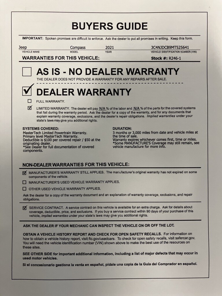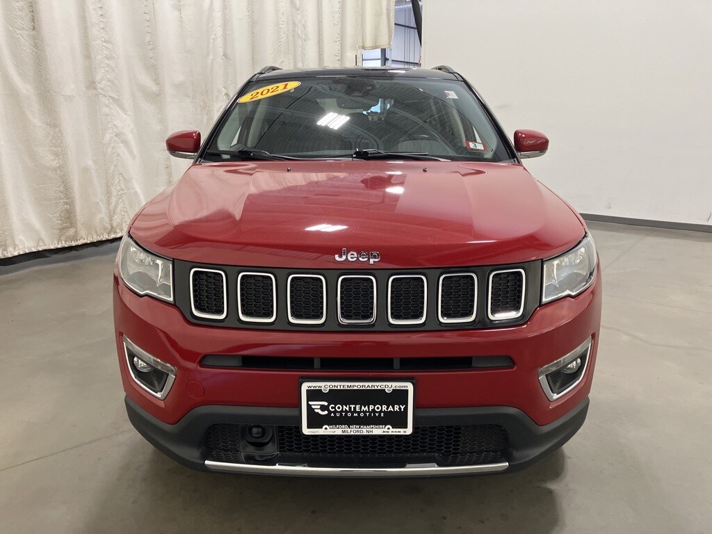 CONTEMPORARY CHRYSLER DODGE JEEP RAM is proud to present you with another True Market Priced Pre-Owned Vehicle. This 2021 Jeep Compass Limited is loaded with the following Factory Options: 4WD Quick Order Package 2GG, 4WD, 3.73 Axle Ratio, 4-Wheel Disc Brakes, 6 Speakers, ABS brakes, Air Conditioning, Alloy wheels, AM/FM radio: SiriusXM, Anti-whiplash front head restraints, Apple CarPlay/Android Auto, Auto-dimming Rear-View mirror, Automatic temperature control, Brake assist, Bumpers: body-color, Compass, Delay-off headlights, Driver door bin, Driver vanity mirror, Dual front impact airbags, Dual front side impact airbags, Electronic Stability Control, Four wheel independent suspension, Front anti-roll bar, Front Bucket Seats, Front Center Armrest w/Storage, Front dual zone A/C, Front fog lights, Front License Plate Bracket, Front reading lights, Fully automatic headlights, Heated door mirrors, Heated front seats, Heated steering wheel, Illuminated entry, Knee airbag, Leather Shift Knob, Leather Trimmed Bucket Seats, Low tire pressure warning, Occupant sensing airbag, Outside temperature display, Overhead airbag, Overhead console, Panic alarm, ParkView Rear Back-Up Camera, Passenger door bin, Passenger vanity mirror, Power door mirrors, Power driver seat, Power steering, Power windows, Radio: Uconnect 4 w/8.4 Display, Rain sensing wipers, Rear anti-roll bar, Rear seat center armrest, Rear window defroster, Rear window wiper, Remote keyless entry, Roof rack: rails only, Security system, Speed control, Split folding rear seat, Spoiler, Steering wheel mounted audio controls, Tachometer, Telescoping steering wheel, Tilt steering wheel, Traction control, Trip computer, Turn signal indicator mirrors, Variably intermittent wipers, and Wheels: 18 x 7.0 Polished/Gray Pockets Aluminum!!