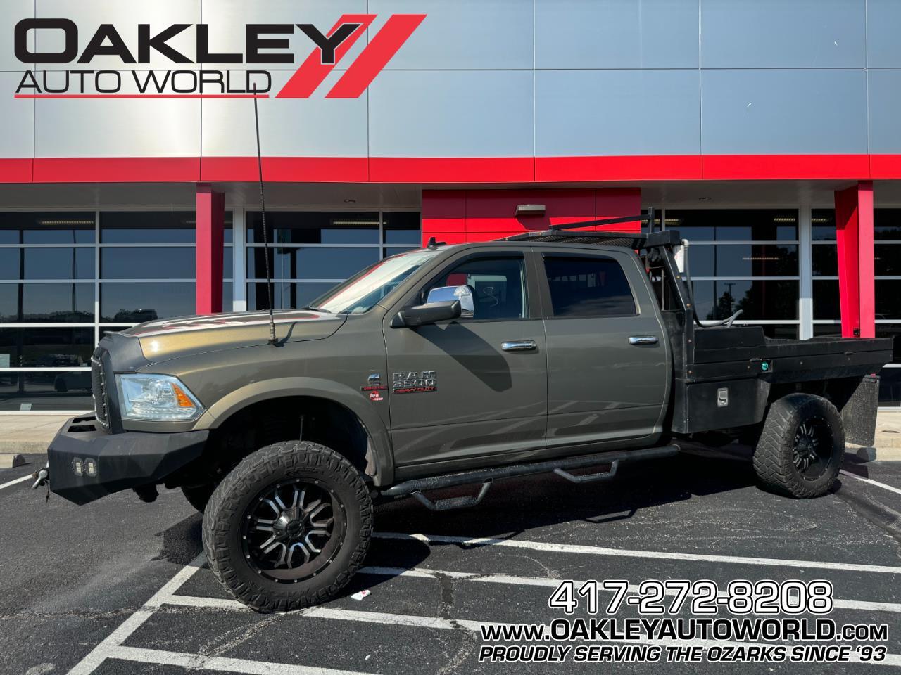CARFAX CERTIFIED CLEAN TITLE!!COVERED BY OAKLEY ADVANTAGE!!This 2014 dodge ram 3500 w 139,XXX miles comes packaged w 6.7L Cummins turbo diesel, automatic transmission, USB/SD card slot, driver/pass heated cooled seats, heated steering wheel, trailer brakes, tow/haul, exhaust brake, traction control, park assist, dual zone climate control, factory touchscreen radio w factory system, dial select 4wd, push to start, CB radio, Tekonsha trailer brake controller, aftermarket Race Me tuner, power adjustable mirrors, power windows/locks, power sunroof, universal garage door opener, rear air bag suspension, steel flat bed w gooseneck hitch, Truck Bed L-Shape Diesel transfer tank, 20 TIS wheels, on Maxxis RAZR M/Ts 295/65/20s Purchase Prices do not include Tax title license and $289.00 Admin Fee. (Unless itemized above) are extra.The features and options listed may not apply to this specific vehicle.*While we make every effort to ensure the data listed here is correct there may be instances where some of the options or vehicle features may be listed incorrectly as we get data from multiple data sources as we are not responsible for typographical technical or misprint errors. Inventory is subject to prior sale. Contact us via phone or email for more details.PLEASE MAKE SURE to confirm the details of this vehicle with the dealer to ensure its accuracy. Dealer cannot be held liable for data that is listed incorrectly.Visit us at to see more information & pictures on the vehicle or call417-272-8208 to set up an appointment to test drive!!! Remember to Like us on facebook and give us a follow on instagram.Not all vehicles with less that 120000 miles qualify for the Oakley Advantage see dealer for details.