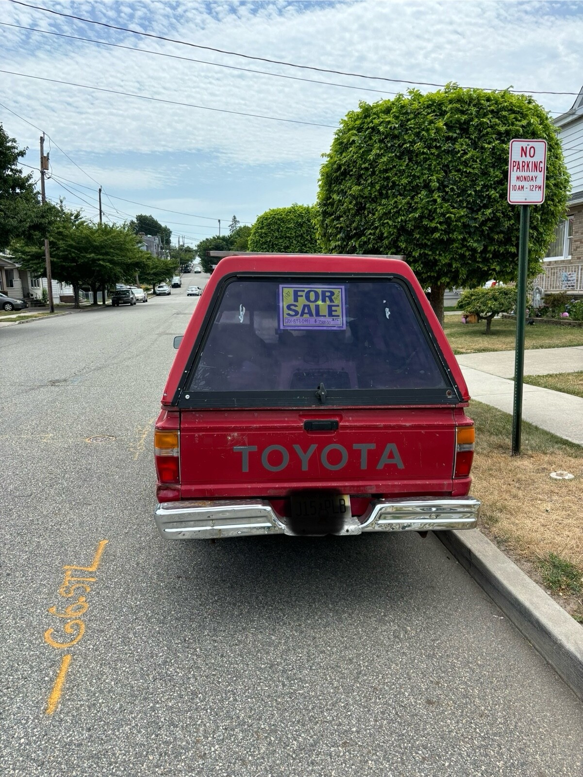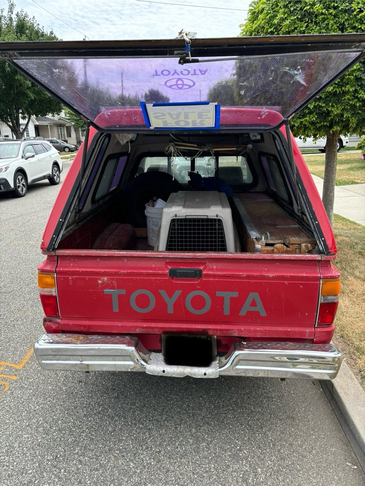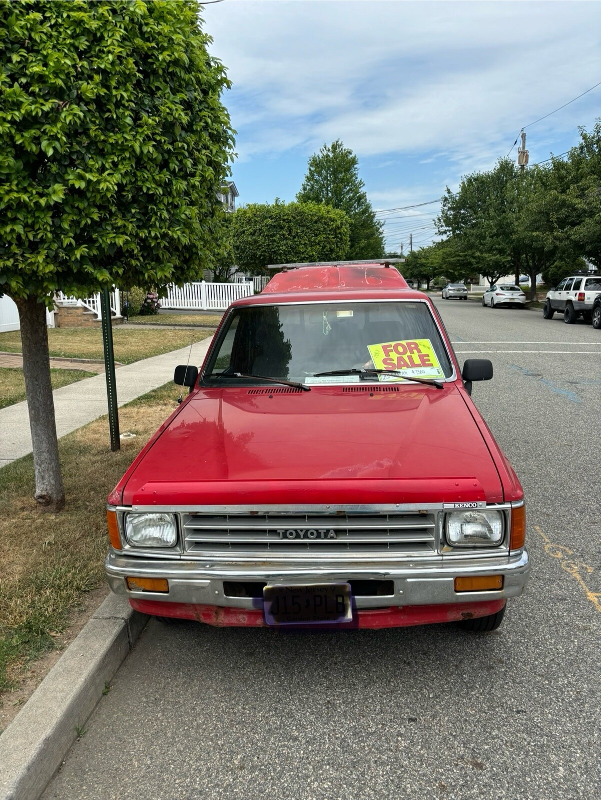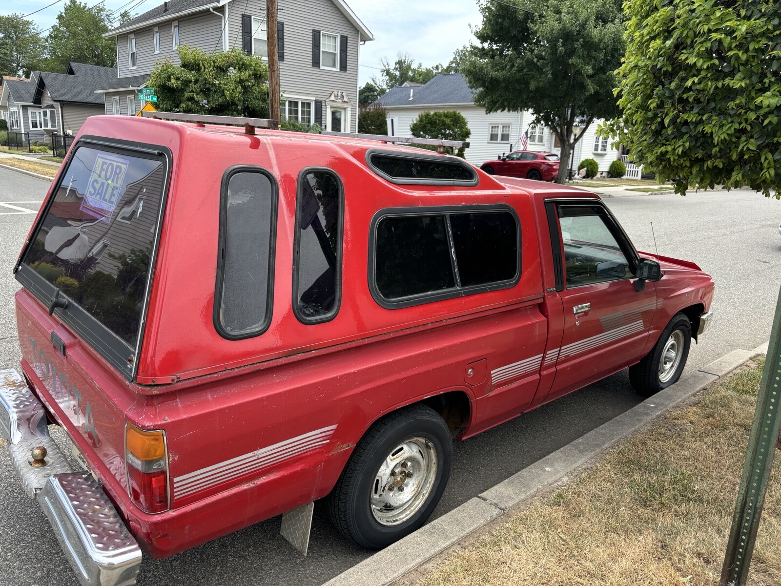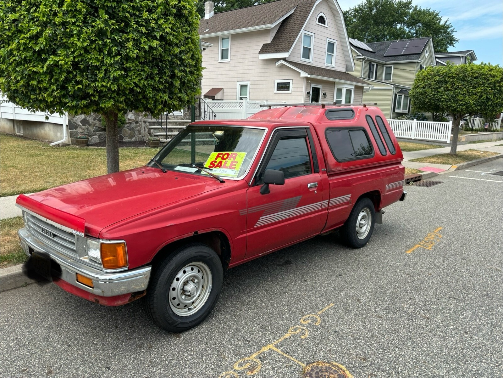 1987 Red Toyota two door Pickup truck with a bed cap. Truck has storage under the cap and was used primarily to go hunting. Has a trailer hitch. Runs great and has been well maintained.
