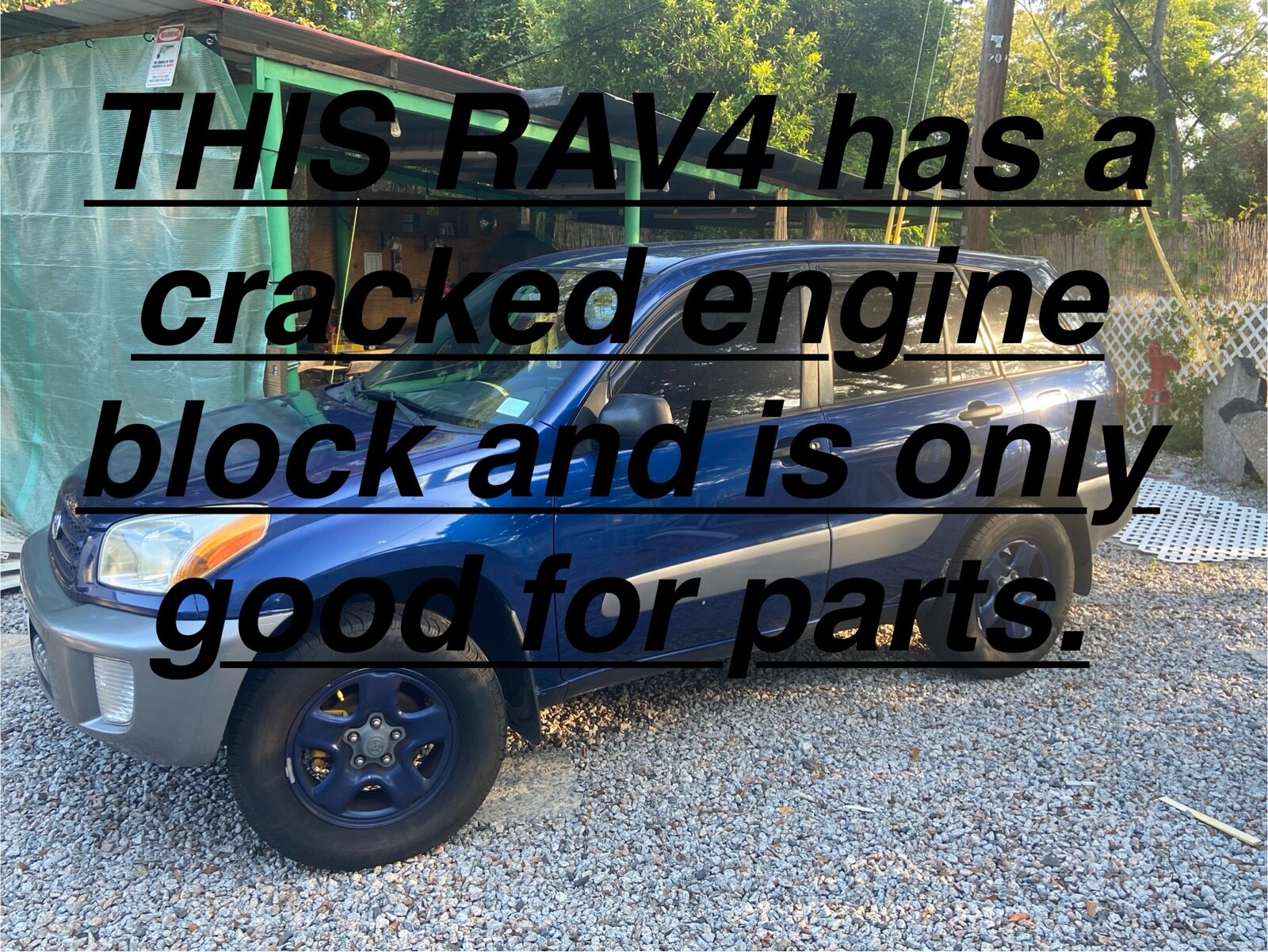 This RAV4 has a has a blown cracked engine block. It does not run. 116,000 miles. Florida and S. Carolina car. Chassis is in great shape. No rust. The value is in the parts. Transmission is $1000+ New tires was $600 New starter was $80 All the body panels $? New Starter relay was $39 New VVTI sensor was $80 And on and on. Or if you have a new engine to put into it. No accidents. I’m the second owner, but I only put about 300 miles on it then it stalled and when towed oil leaked from the lower engine. I bought it from my neighbor and they took care of it. Why did the engine block crack? Mechanic says it was a manufacturing error and a very, very few RAV4 vehicles do this, but it does happen. This car is not in running condition. It is to be used for parts;needs a new engine.Vehicle Details