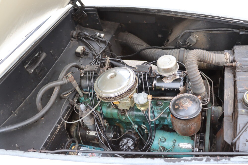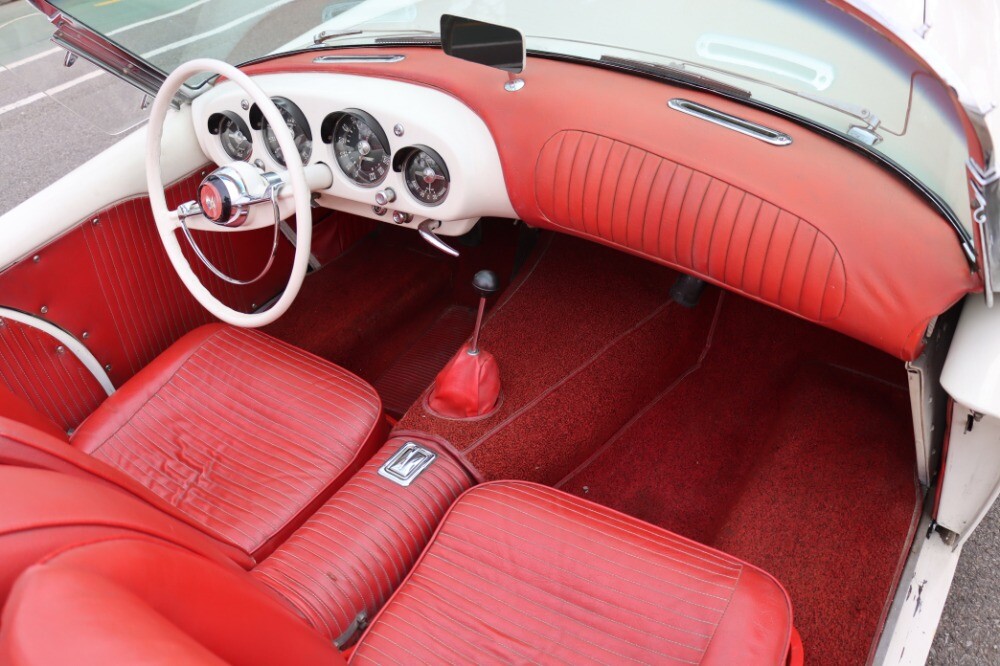 This 1954 Kaiser Darrin is just out of single family ownership and likely the most original and honest example you will come across. Never restored, yet a very presentable driver that's mechanically excellent. White with its original red interior showcasing a lovely patina. Offered with loads of documentation, literature, and service history. An attractive car overall, however the paint is showing its age with plenty of checking at this point. The motor runs smooth, strong, and quiet. This Kaiser Darrin starts right up and drives great. The fiberglass is in good condition and the chrome still shows nicely. The underside is also quite clean with a solid frame. Beyond the sweeping profile and heart-shaped grille, the fiberglass-bodied Darrin was most famous for its pocket doors that disappeared into the front fenders on sliding tracks. Just 435 of these stunning cars were built and they were all sold as 1954 models, making them both rare and desirable. An incredible opportunity to enjoy a rare and iconic American sports car. With so few examples left in existence, this great car is sure to command attention.