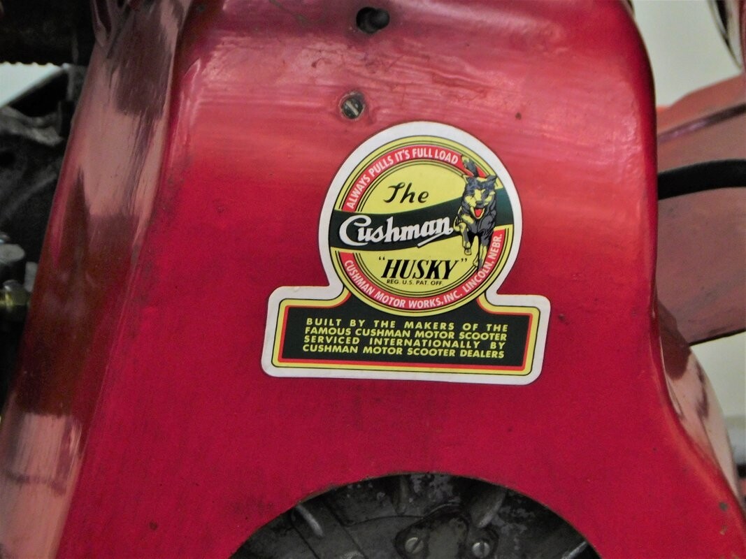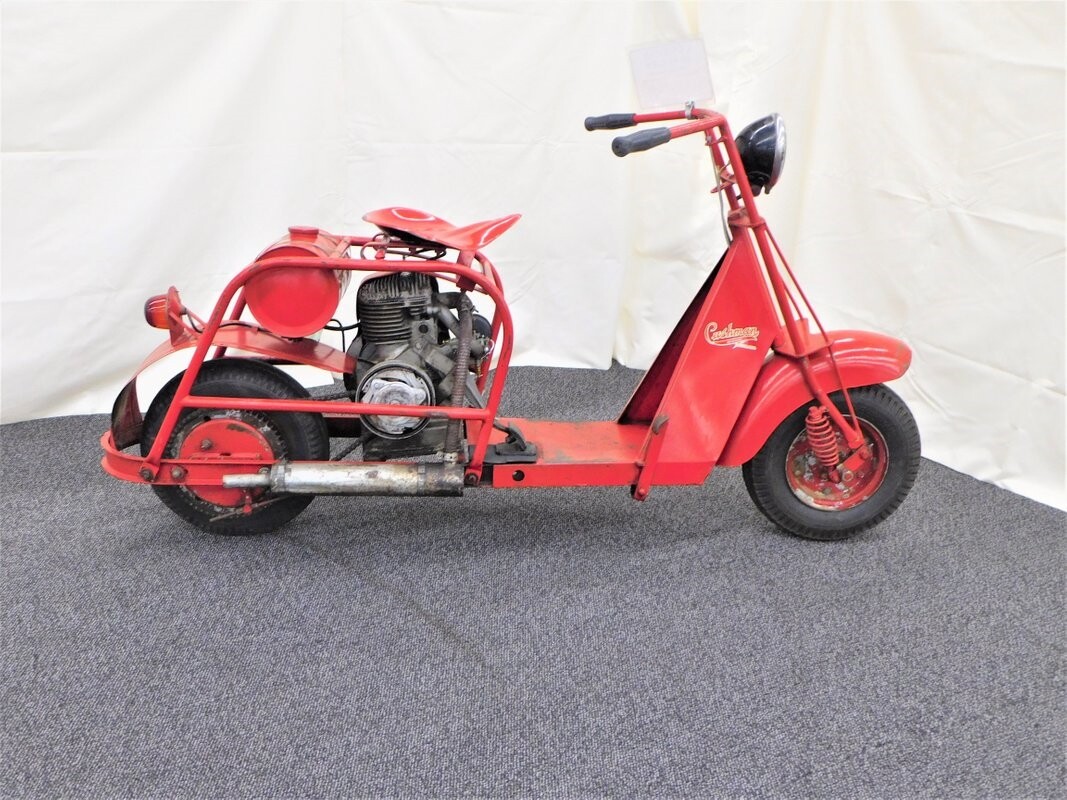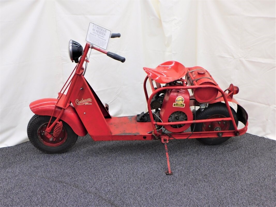 This 1950 Sunfast Red Cushman Highlander Model 61 has been unrestored. It is all original and runs 3 HP. The scooter comes to us from the collection of Dennis Carpenter. This is a running scooter but it does not have a title. Since it is only 3 HP, it is classified as a Moped and can be registered but not titled in NC. Check with your local DMV for their requirements. ALL ITEMS SOLD "AS-IS".