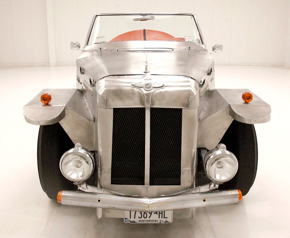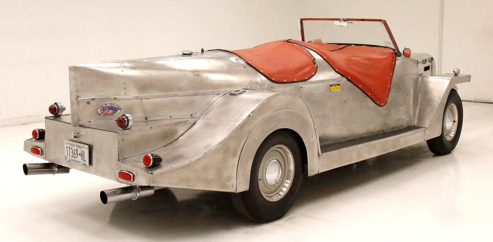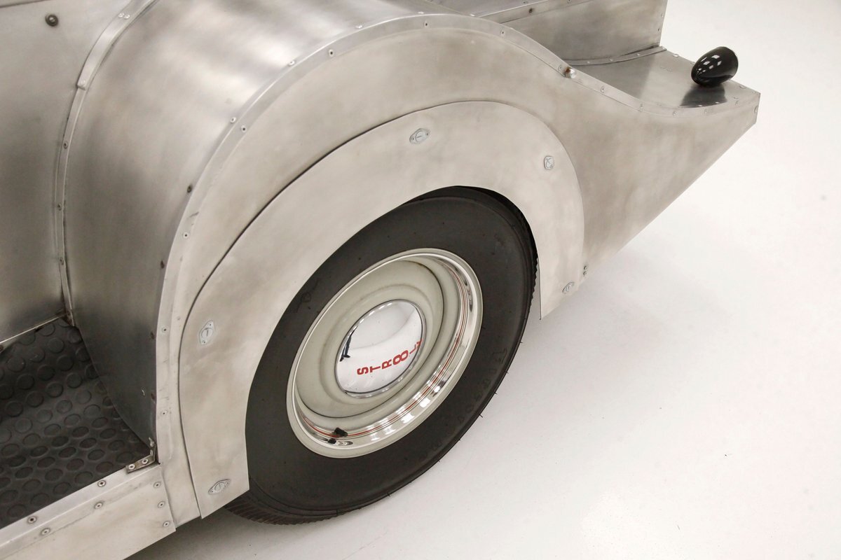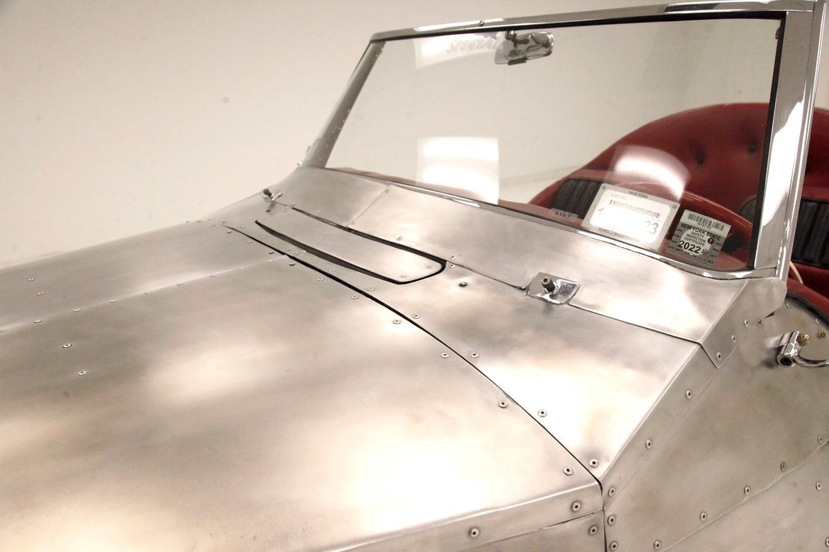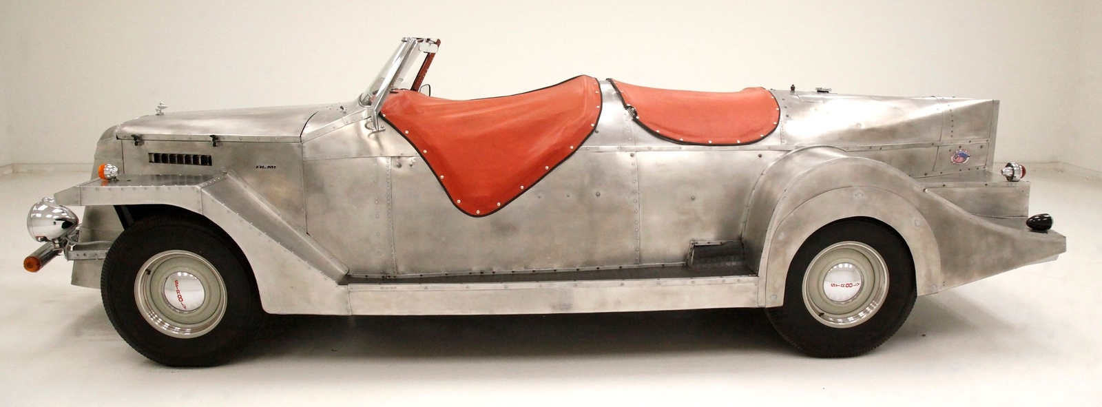 Fashioned from aircraft aluminum, the car is fully custom taking on a look of an amalgamation of many car cues from the past. It has an aluminum radiator surround canted forward, reminiscent of the early cars from the 1920's. A single headlight is floating just above a bumper, which has parking lighting on its edges, and said headlights are encased in chromed bullet styled casings. A cowled hood with some side venting and a kneeling winged goddess for a hood ornament are noted. Squared off fenders and running boards are fashioned on either side of the dual opening cockpit body. The back of the car takes on a more curvaceous style with the rear fenders gracefully making a downward plunge and flanking a boat tail back end to this creation. There is an abundance of tail lighting counting not less than 3 sets of tail lights and reflectors from various automotive eras including the 40's, 50's, and 70's reflectors. Large dual exhaust peek out of the back from under the squared off rear roll pan. Deep chromed trim edged wheels sprayed in silver have a badge central moon cap with a Str8ly central red painted badge. All panels are straight rust free and have plenty of riveting holding them to the chassis.