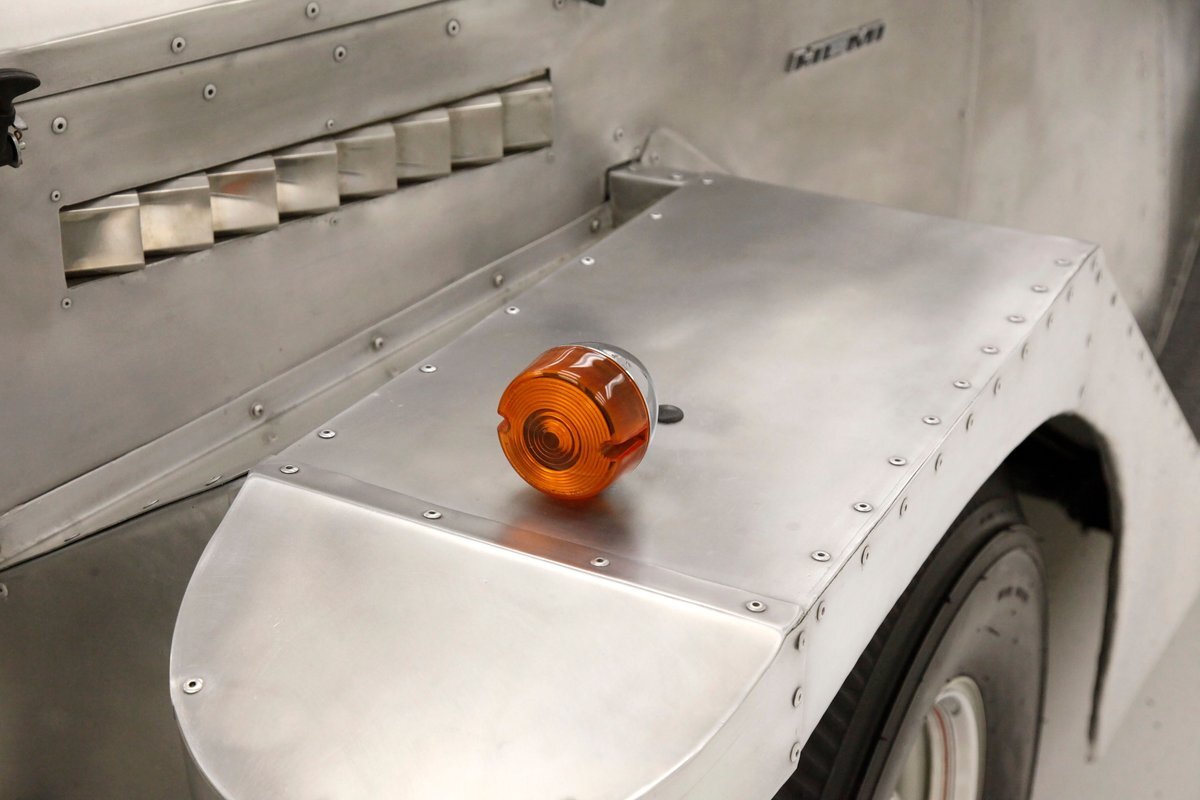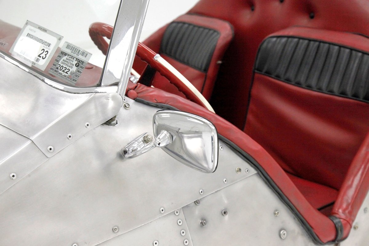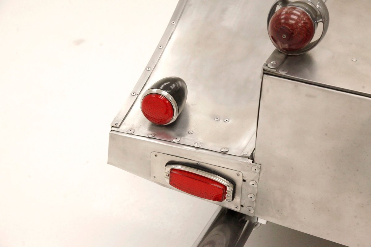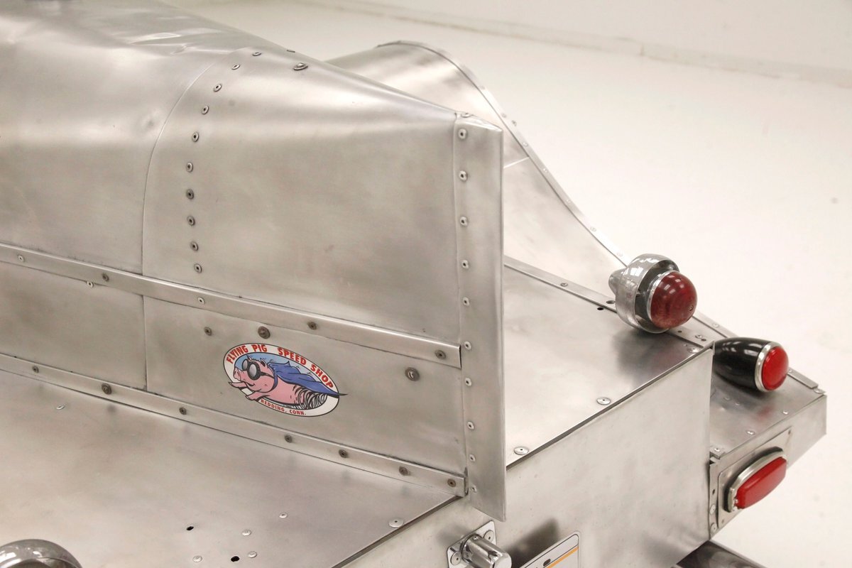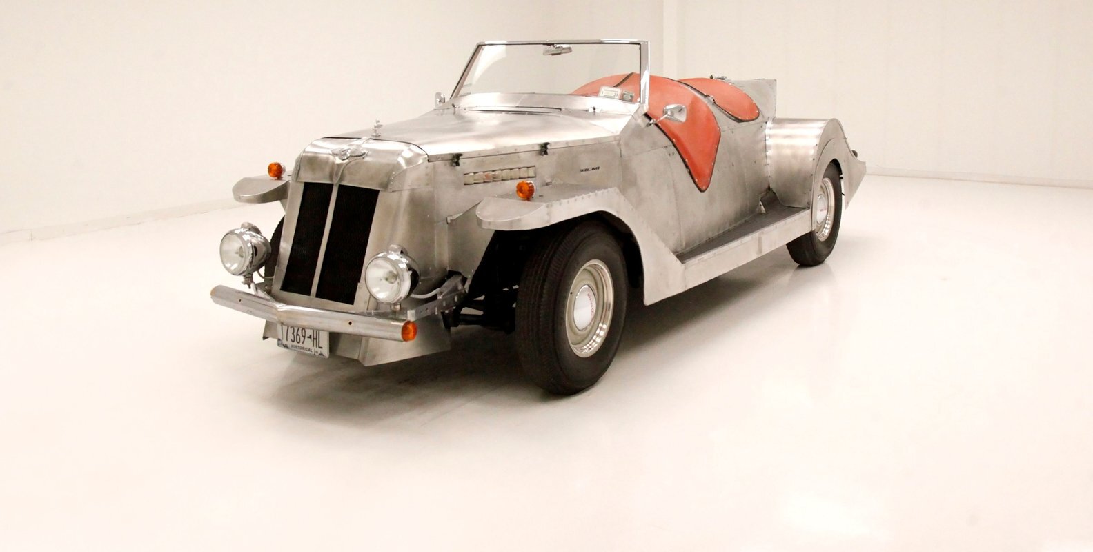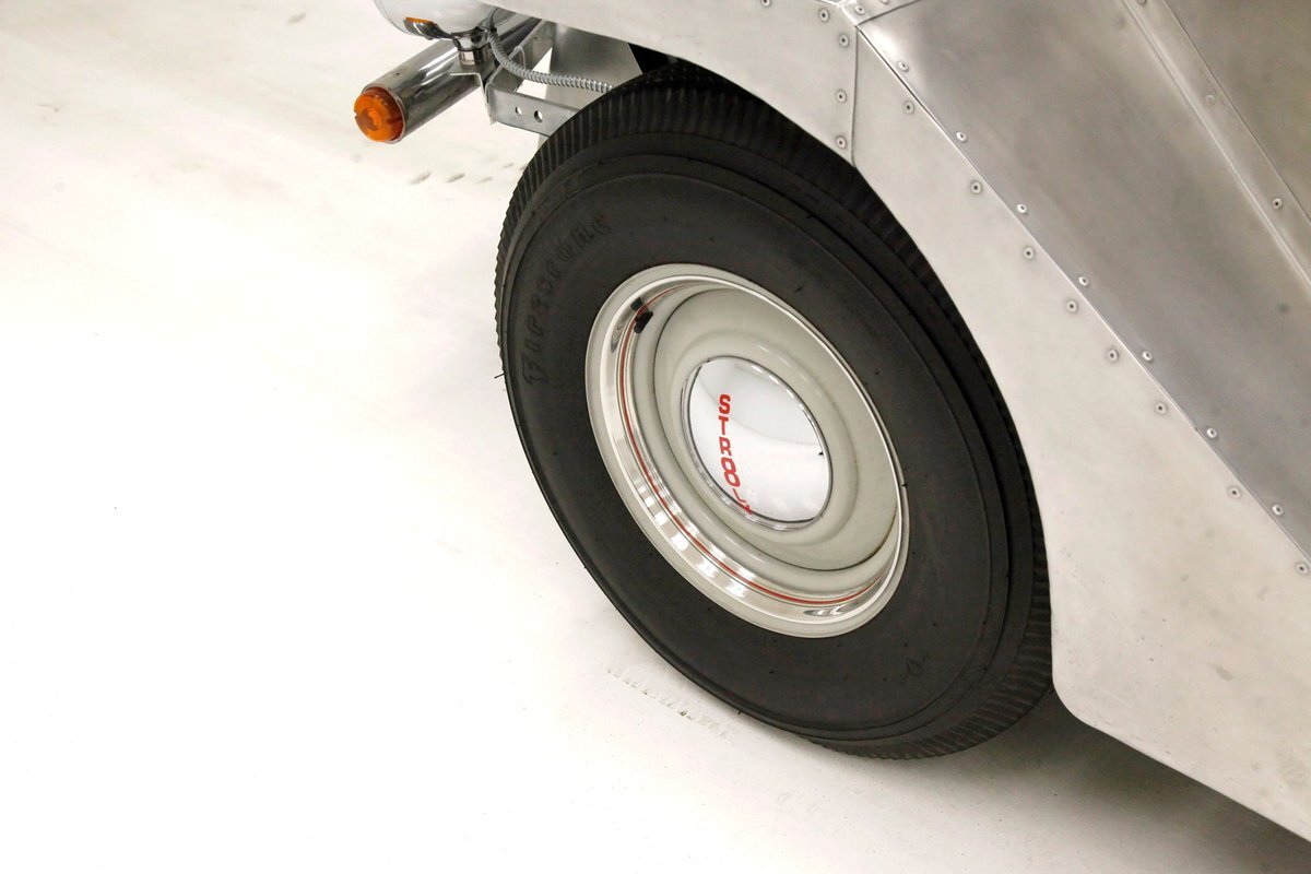 Fashioned from aircraft aluminum, the car is fully custom taking on a look of an amalgamation of many car cues from the past. It has an aluminum radiator surround canted forward, reminiscent of the early cars from the 1920's. A single headlight is floating just above a bumper, which has parking lighting on its edges, and said headlights are encased in chromed bullet styled casings. A cowled hood with some side venting and a kneeling winged goddess for a hood ornament are noted. Squared off fenders and running boards are fashioned on either side of the dual opening cockpit body. The back of the car takes on a more curvaceous style with the rear fenders gracefully making a downward plunge and flanking a boat tail back end to this creation. There is an abundance of tail lighting counting not less than 3 sets of tail lights and reflectors from various automotive eras including the 40's, 50's, and 70's reflectors. Large dual exhaust peek out of the back from under the squared off rear roll pan. Deep chromed trim edged wheels sprayed in silver have a badge central moon cap with a Str8ly central red painted badge. All panels are straight rust free and have plenty of riveting holding them to the chassis.