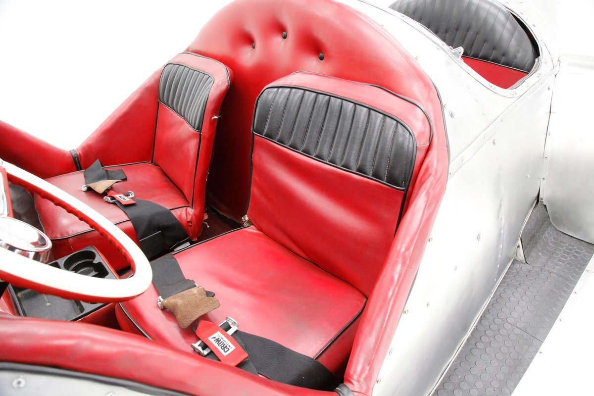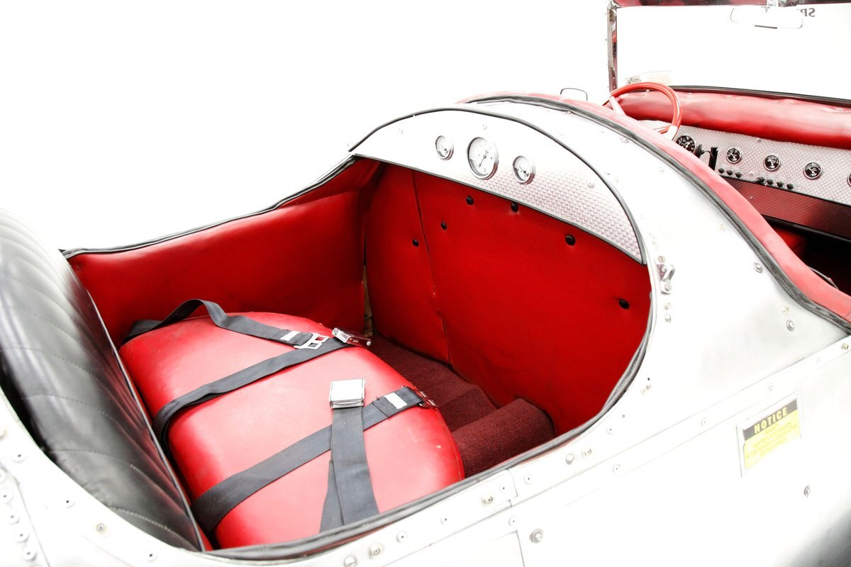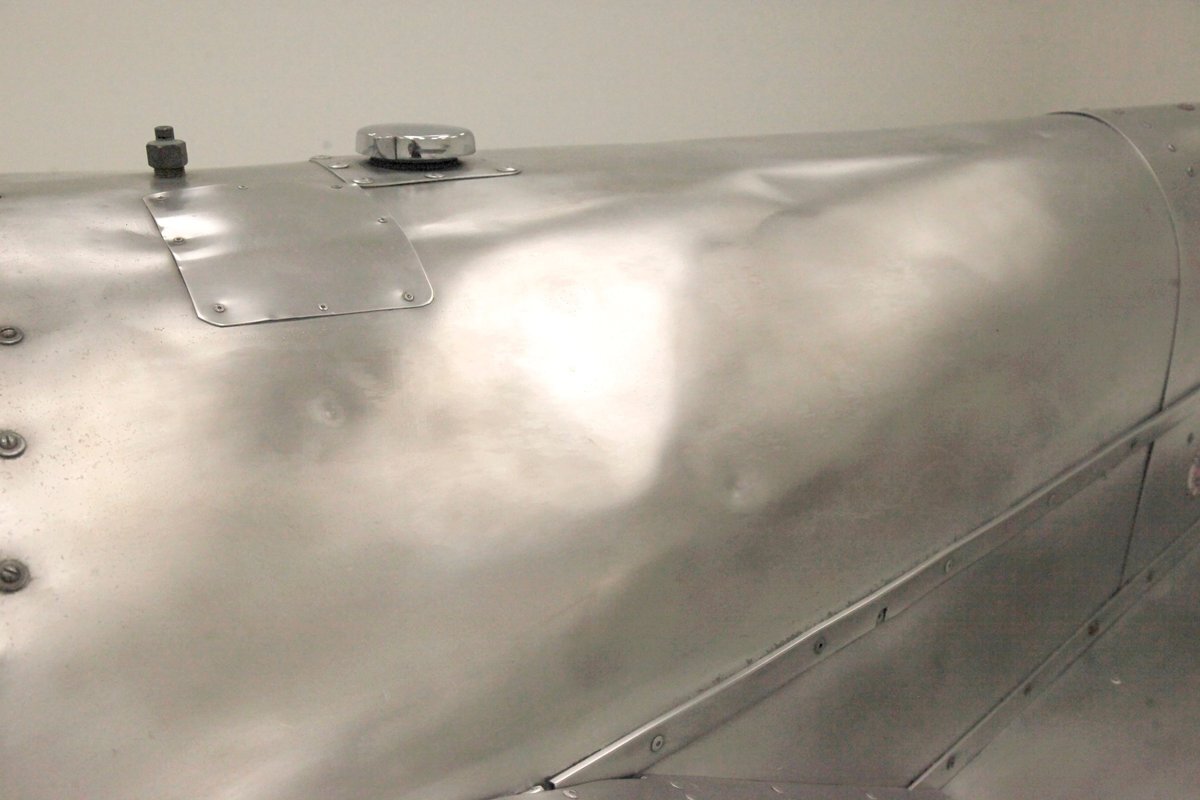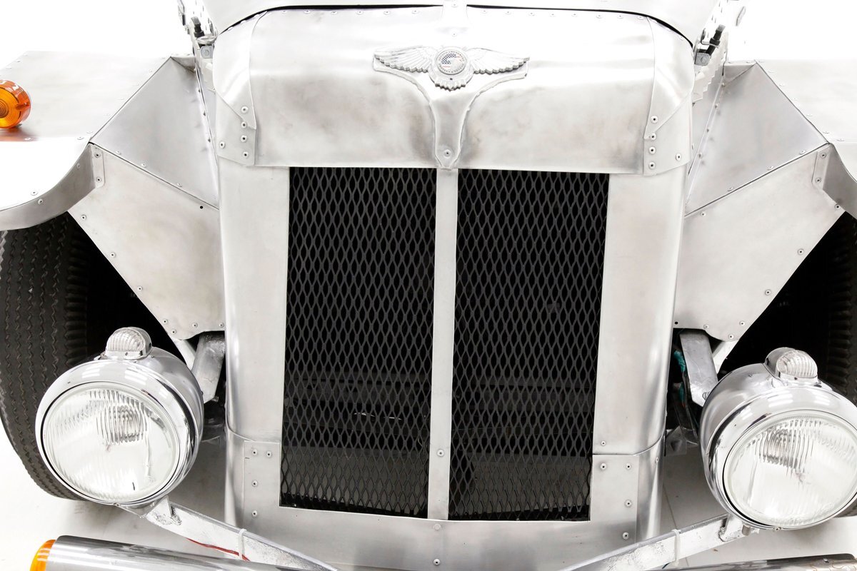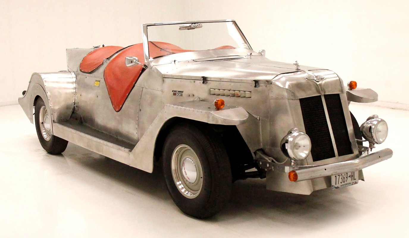 Fashioned from aircraft aluminum, the car is fully custom taking on a look of an amalgamation of many car cues from the past. It has an aluminum radiator surround canted forward, reminiscent of the early cars from the 1920's. A single headlight is floating just above a bumper, which has parking lighting on its edges, and said headlights are encased in chromed bullet styled casings. A cowled hood with some side venting and a kneeling winged goddess for a hood ornament are noted. Squared off fenders and running boards are fashioned on either side of the dual opening cockpit body. The back of the car takes on a more curvaceous style with the rear fenders gracefully making a downward plunge and flanking a boat tail back end to this creation. There is an abundance of tail lighting counting not less than 3 sets of tail lights and reflectors from various automotive eras including the 40's, 50's, and 70's reflectors. Large dual exhaust peek out of the back from under the squared off rear roll pan. Deep chromed trim edged wheels sprayed in silver have a badge central moon cap with a Str8ly central red painted badge. All panels are straight rust free and have plenty of riveting holding them to the chassis.