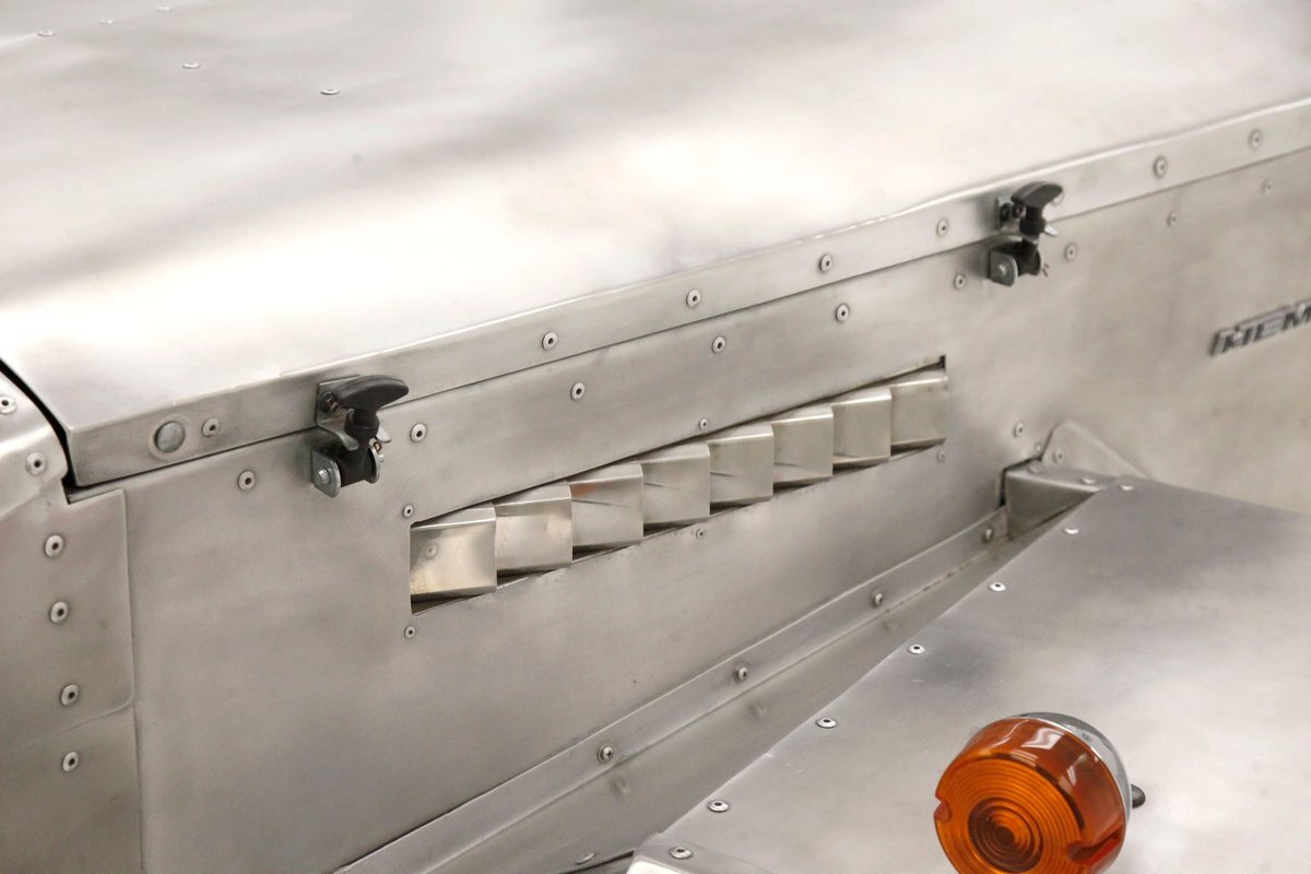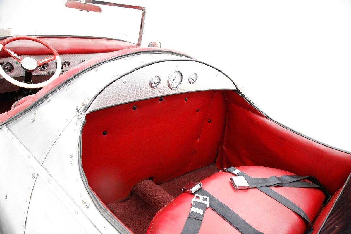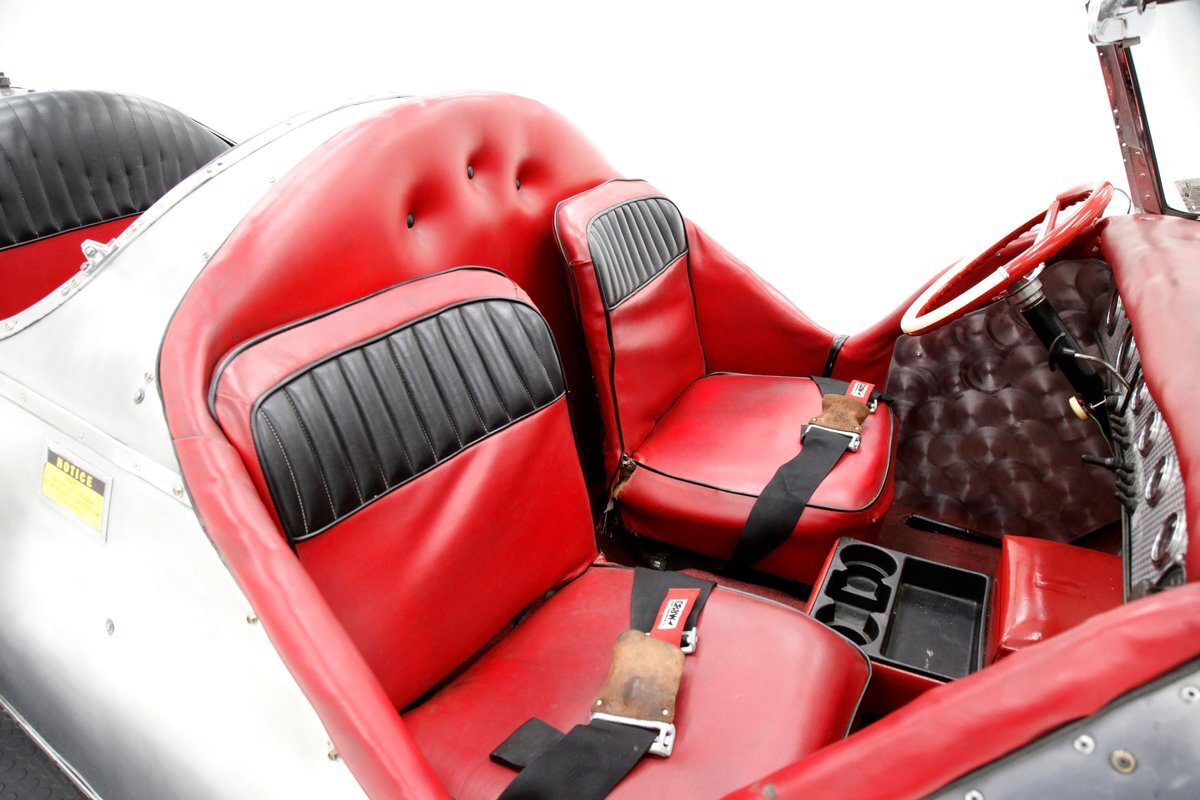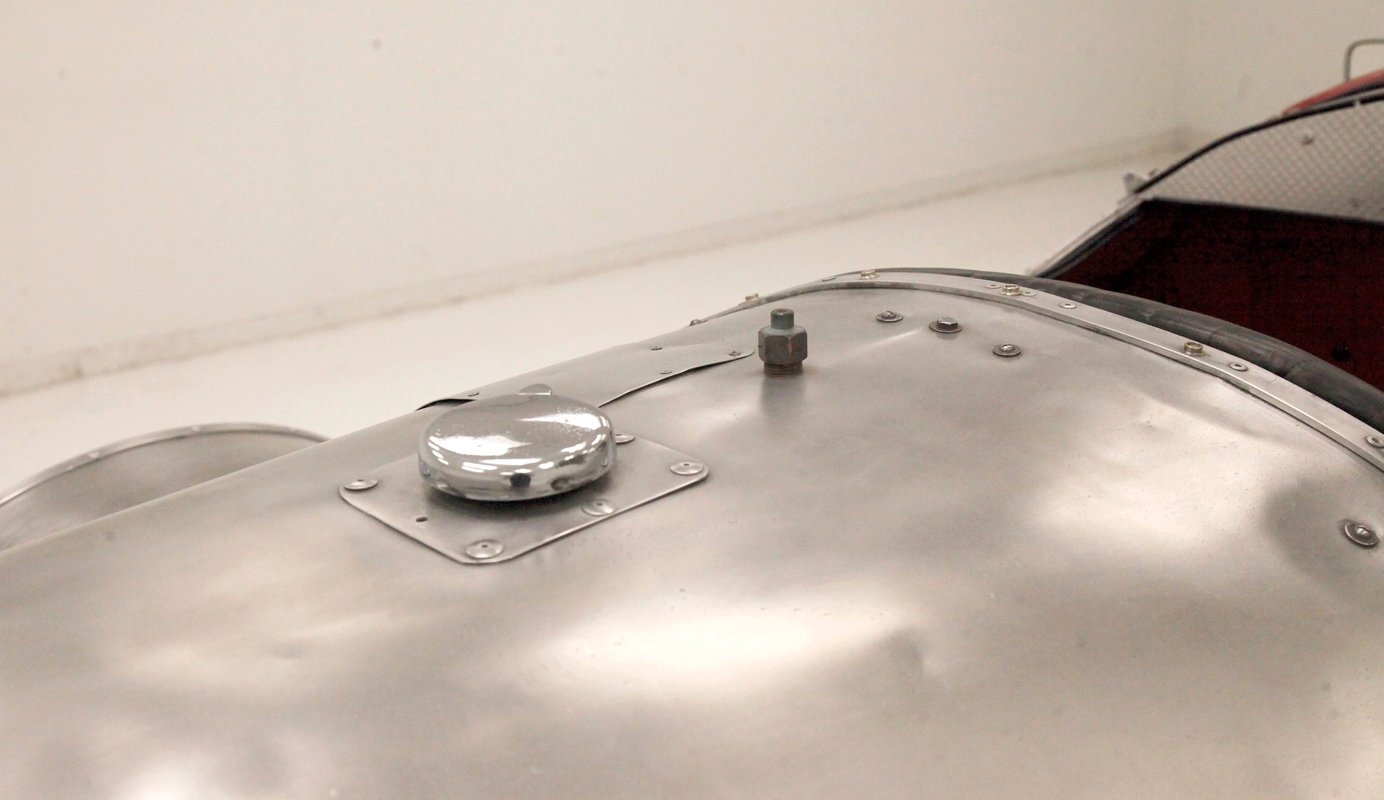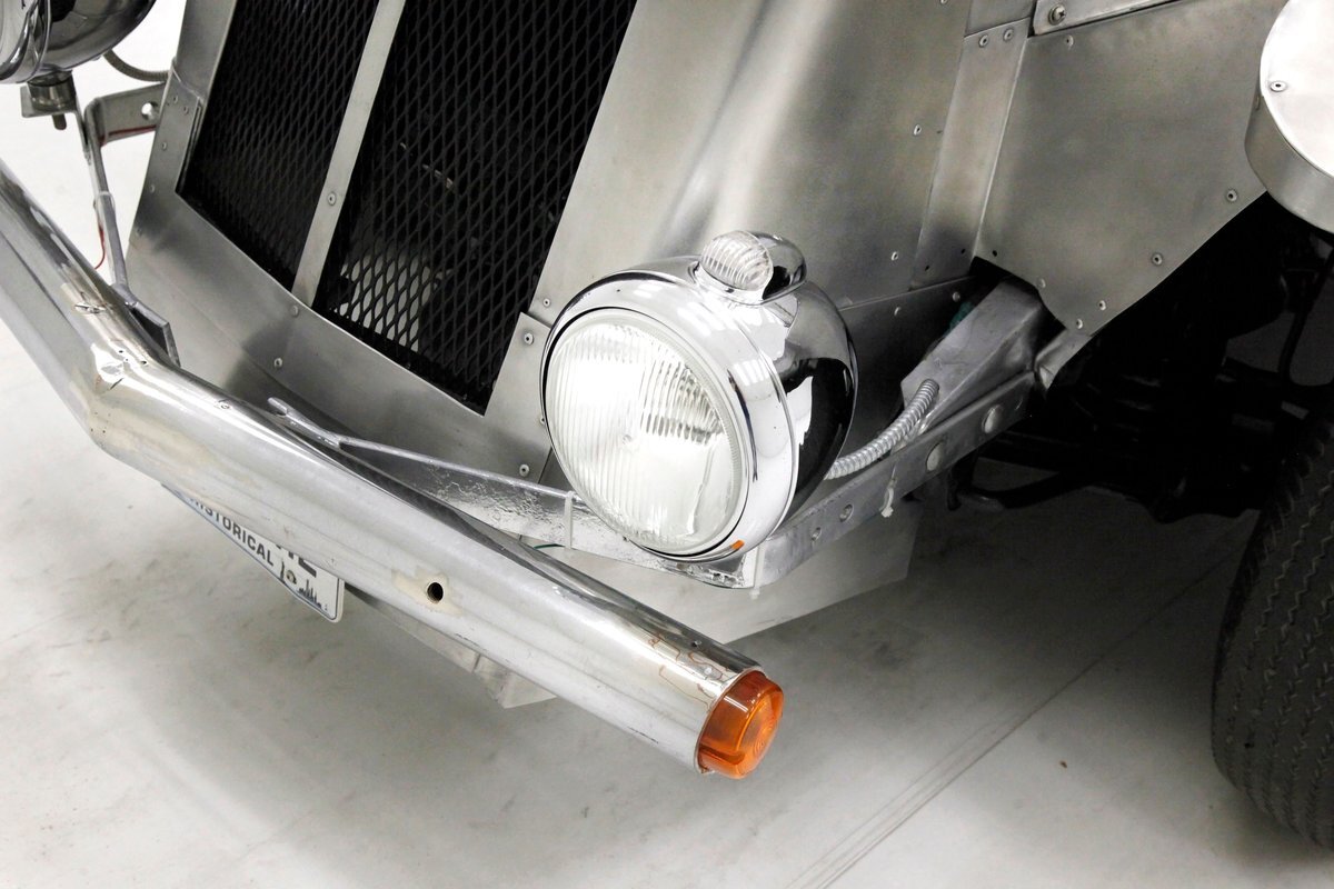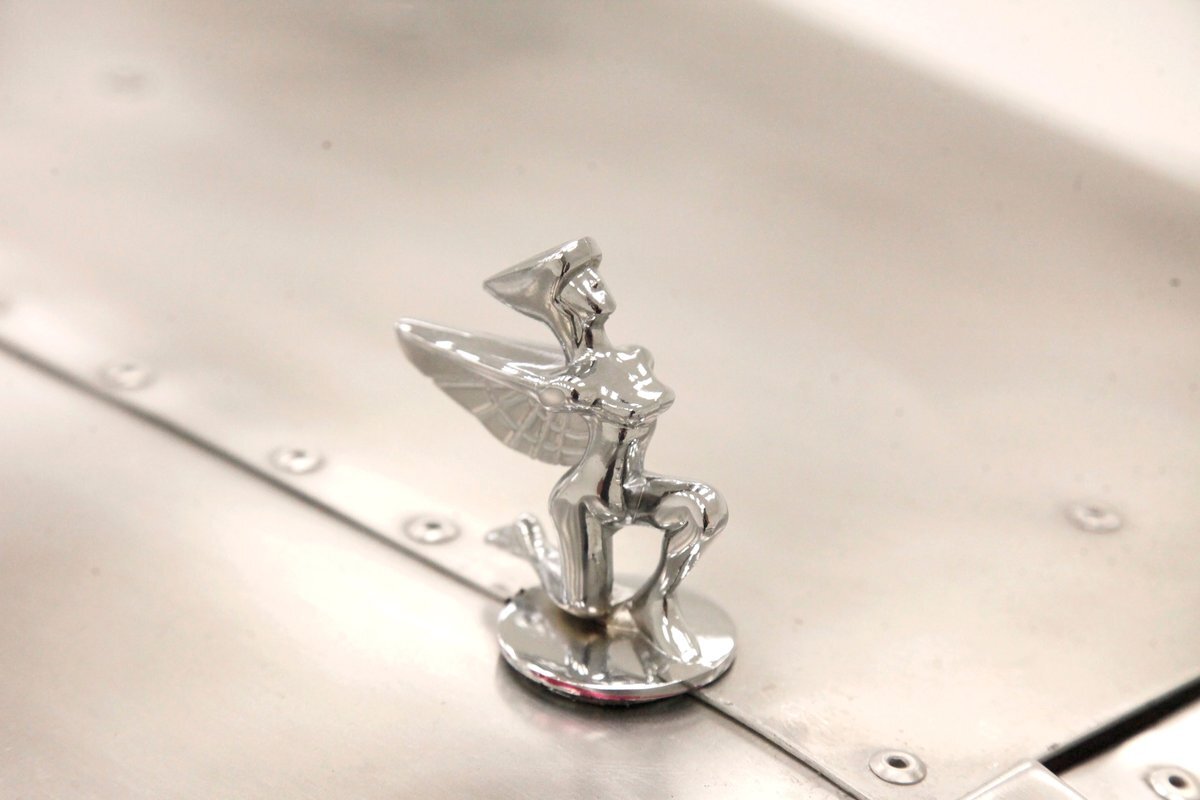 Fashioned from aircraft aluminum, the car is fully custom taking on a look of an amalgamation of many car cues from the past. It has an aluminum radiator surround canted forward, reminiscent of the early cars from the 1920's. A single headlight is floating just above a bumper, which has parking lighting on its edges, and said headlights are encased in chromed bullet styled casings. A cowled hood with some side venting and a kneeling winged goddess for a hood ornament are noted. Squared off fenders and running boards are fashioned on either side of the dual opening cockpit body. The back of the car takes on a more curvaceous style with the rear fenders gracefully making a downward plunge and flanking a boat tail back end to this creation. There is an abundance of tail lighting counting not less than 3 sets of tail lights and reflectors from various automotive eras including the 40's, 50's, and 70's reflectors. Large dual exhaust peek out of the back from under the squared off rear roll pan. Deep chromed trim edged wheels sprayed in silver have a badge central moon cap with a Str8ly central red painted badge. All panels are straight rust free and have plenty of riveting holding them to the chassis.
