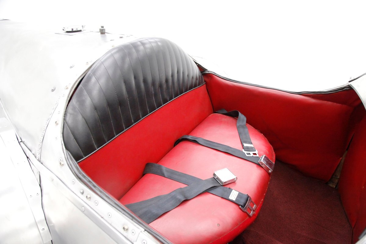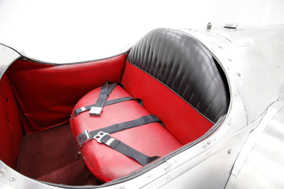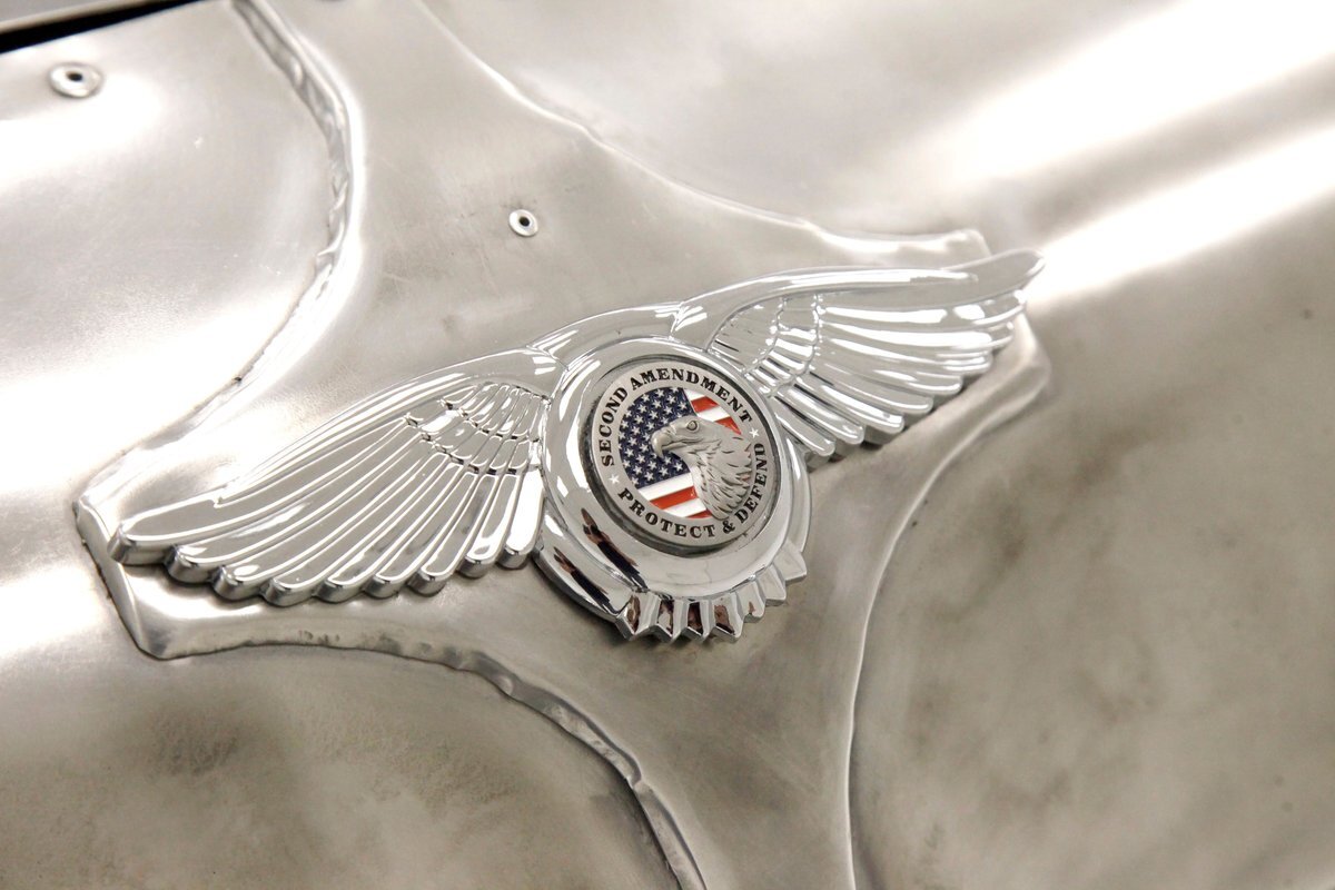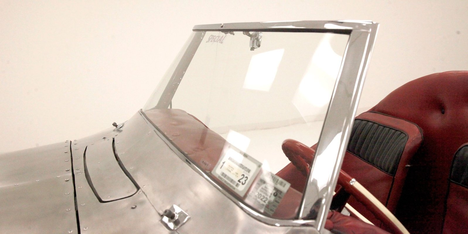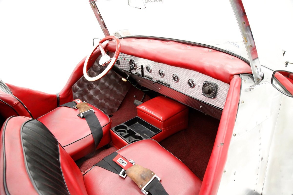 Fashioned from aircraft aluminum, the car is fully custom taking on a look of an amalgamation of many car cues from the past. It has an aluminum radiator surround canted forward, reminiscent of the early cars from the 1920's. A single headlight is floating just above a bumper, which has parking lighting on its edges, and said headlights are encased in chromed bullet styled casings. A cowled hood with some side venting and a kneeling winged goddess for a hood ornament are noted. Squared off fenders and running boards are fashioned on either side of the dual opening cockpit body. The back of the car takes on a more curvaceous style with the rear fenders gracefully making a downward plunge and flanking a boat tail back end to this creation. There is an abundance of tail lighting counting not less than 3 sets of tail lights and reflectors from various automotive eras including the 40's, 50's, and 70's reflectors. Large dual exhaust peek out of the back from under the squared off rear roll pan. Deep chromed trim edged wheels sprayed in silver have a badge central moon cap with a Str8ly central red painted badge. All panels are straight rust free and have plenty of riveting holding them to the chassis.