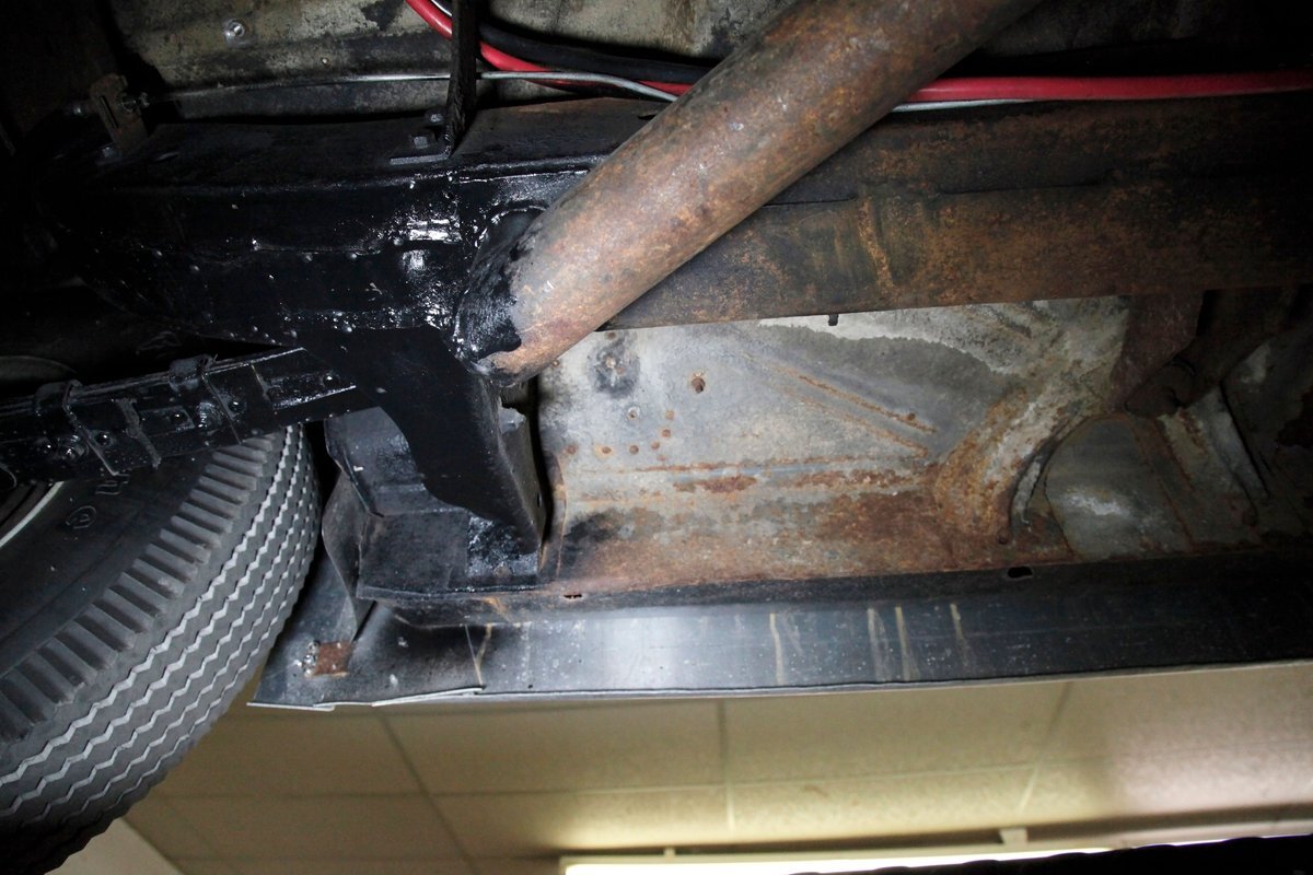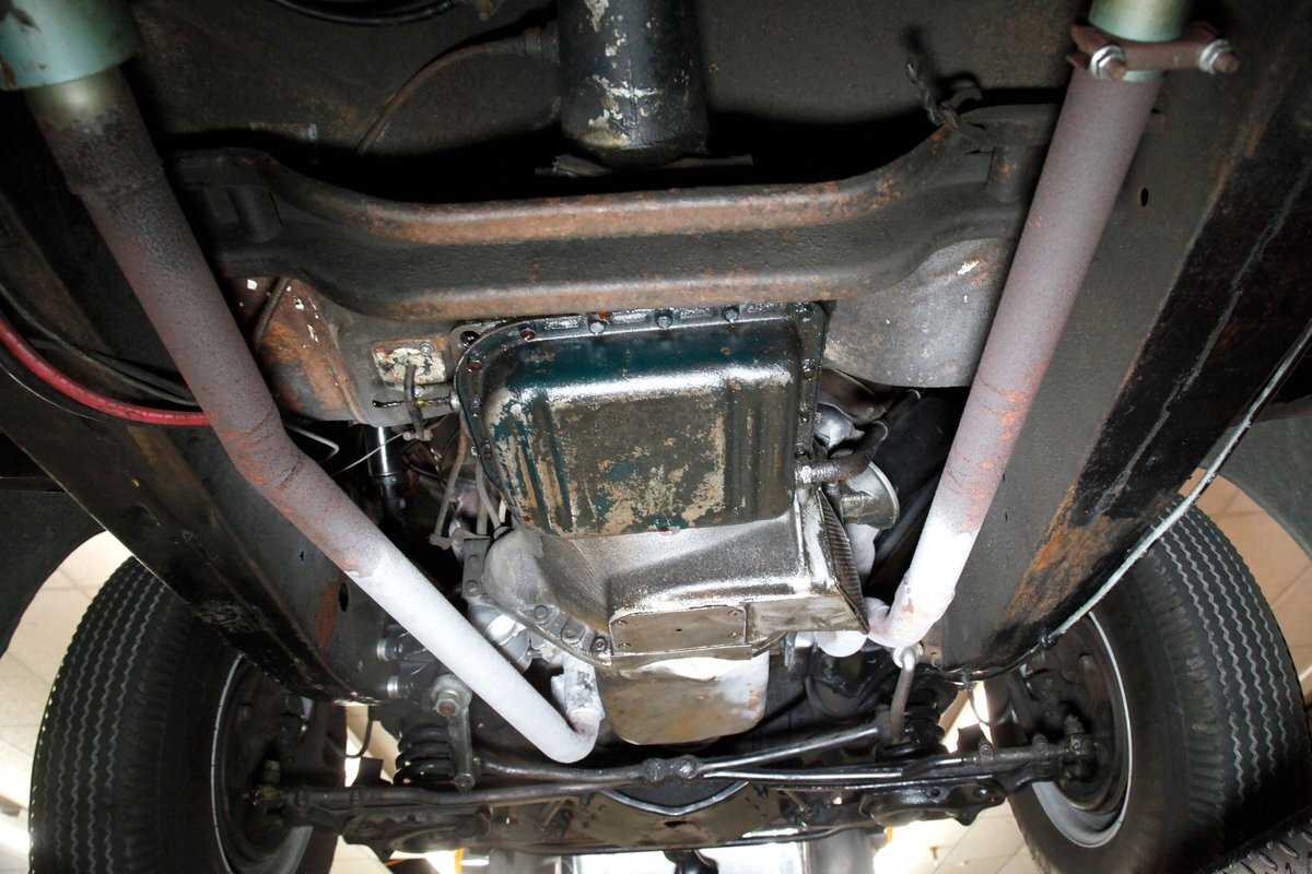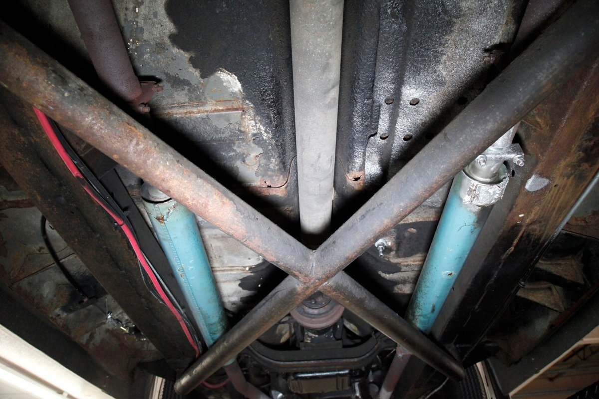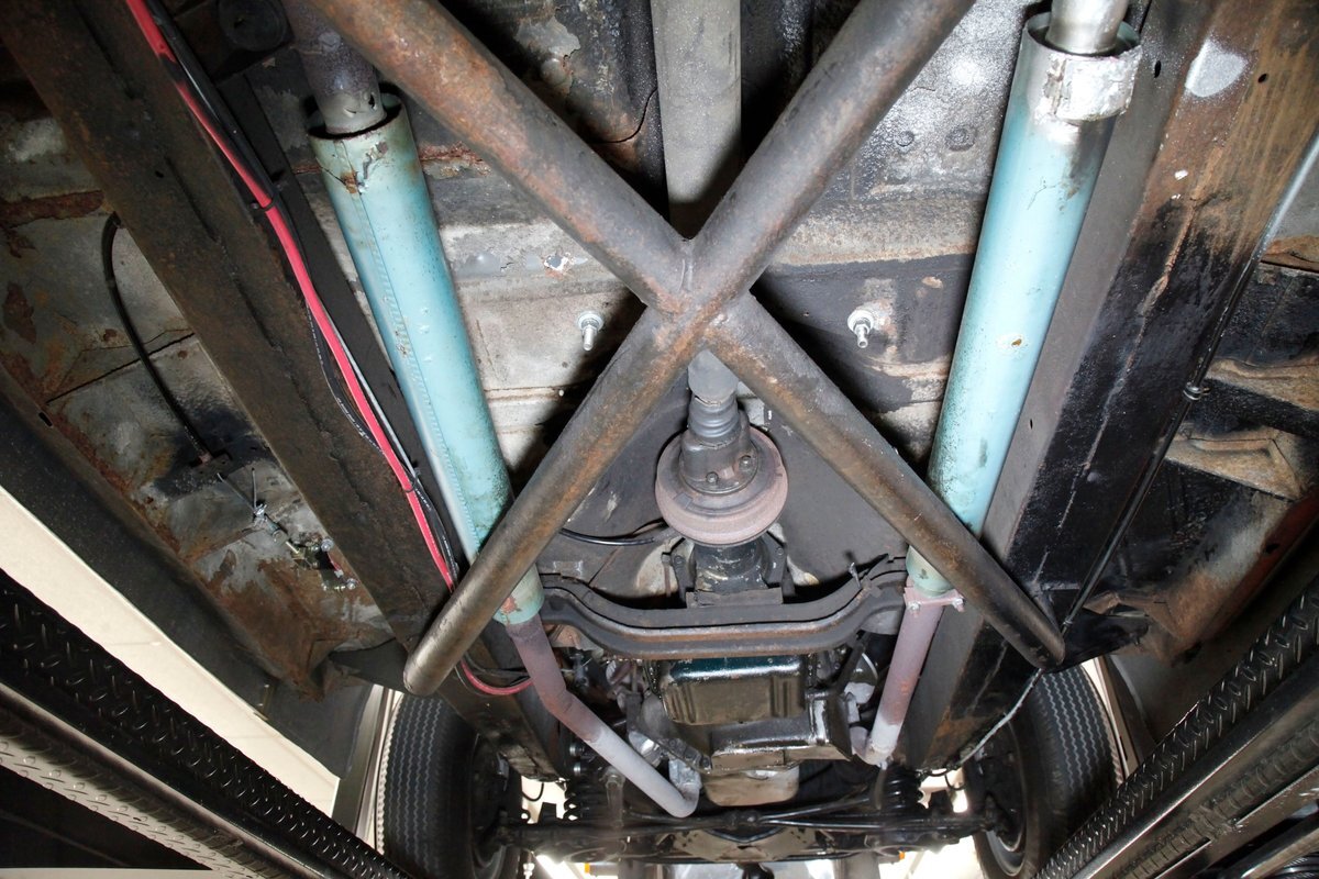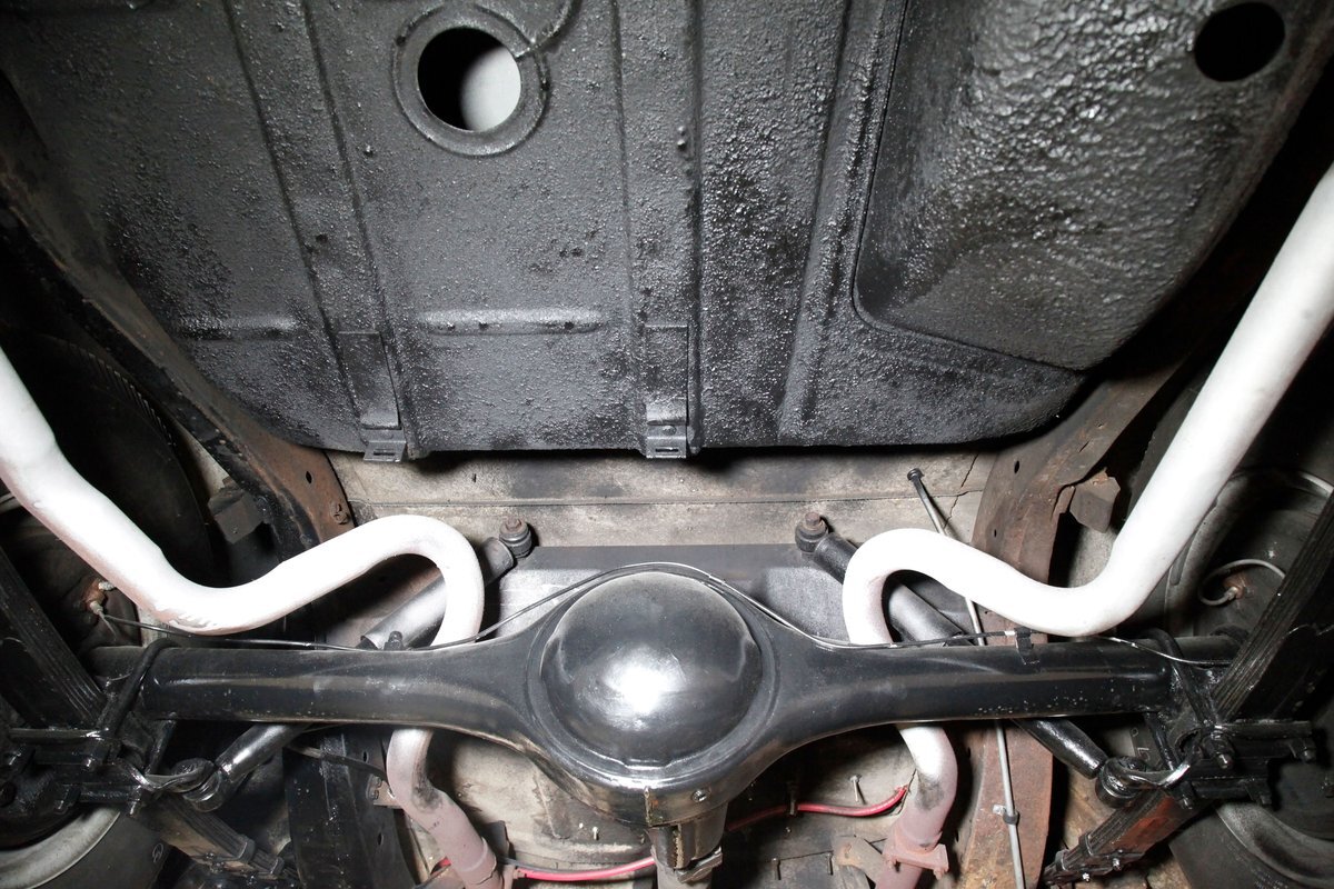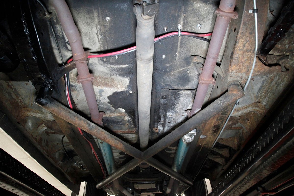 All built on a 1955 Chrysler chassis we see black heavily undercoated steel framing and floor pans. It does have a peppering of surface rust throughout. Independent coil springs are in front, and leaf springs oil back provide the ride. Power drum braking is all around and dual exhaust are noted featuring Smitty Mufflers.