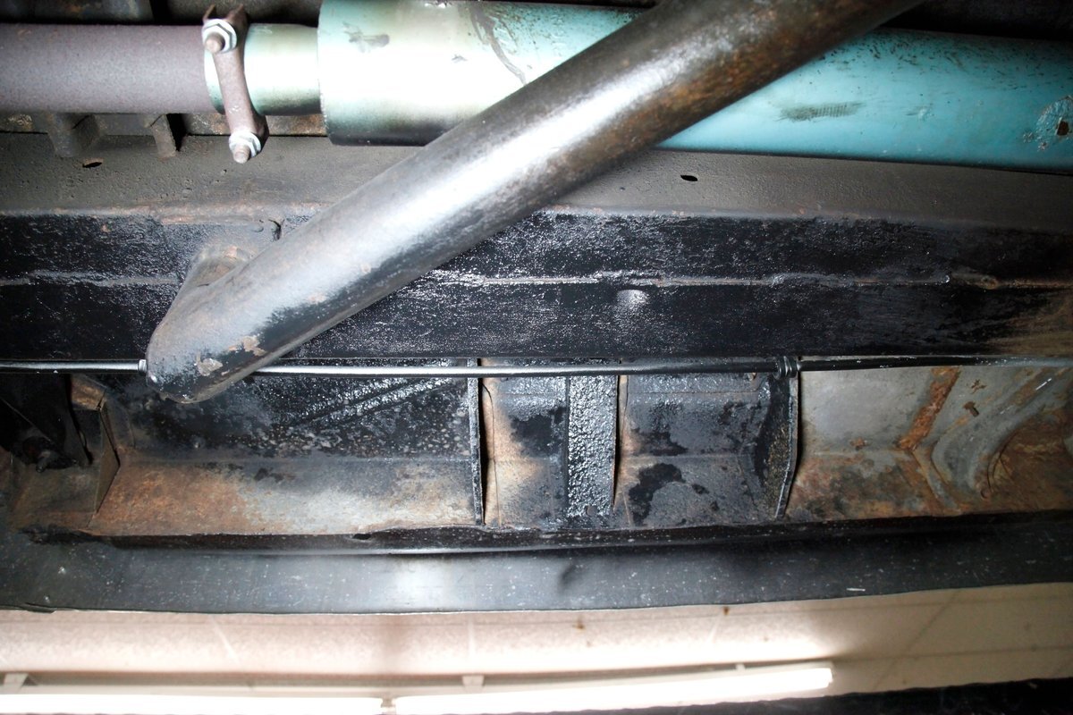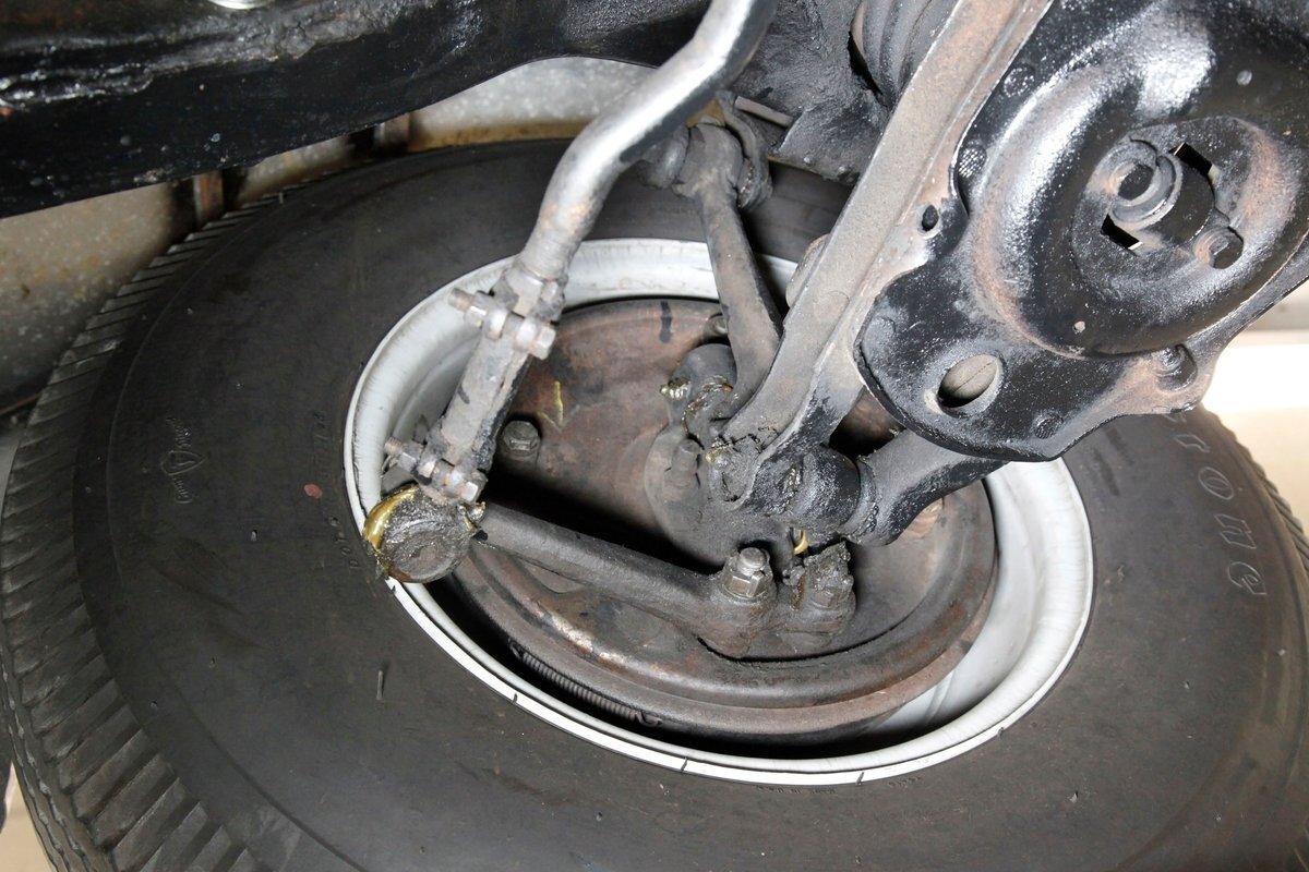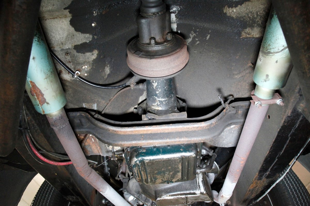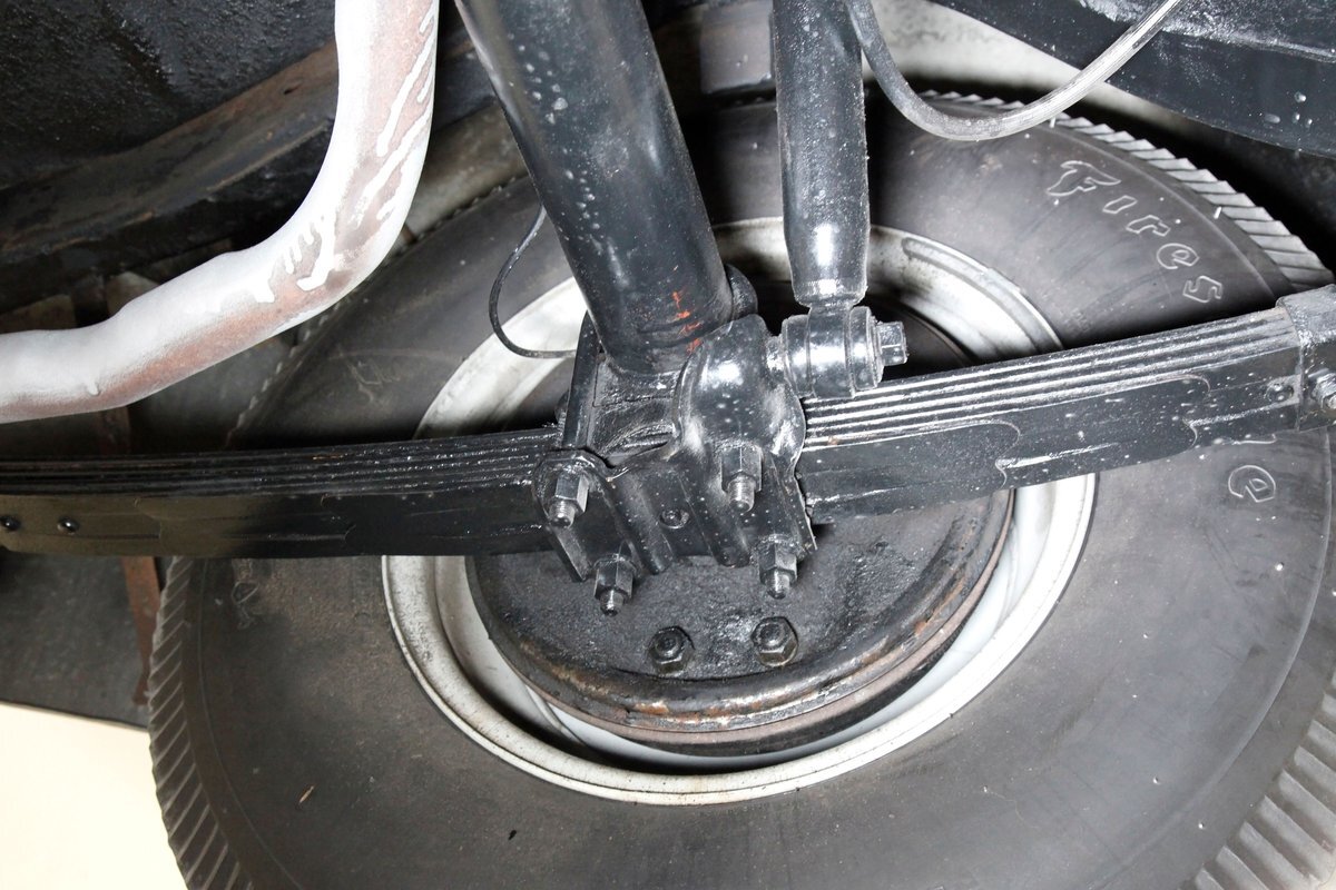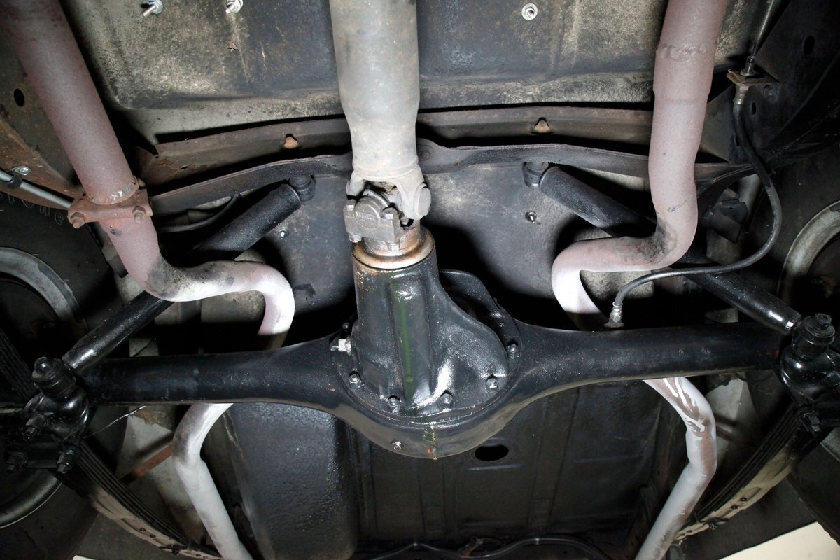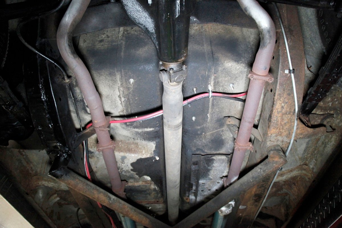 All built on a 1955 Chrysler chassis we see black heavily undercoated steel framing and floor pans. It does have a peppering of surface rust throughout. Independent coil springs are in front, and leaf springs oil back provide the ride. Power drum braking is all around and dual exhaust are noted featuring Smitty Mufflers.
