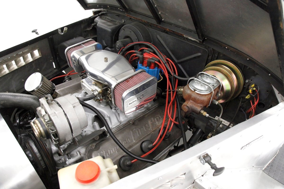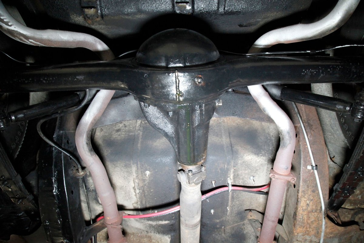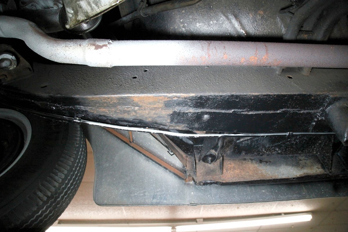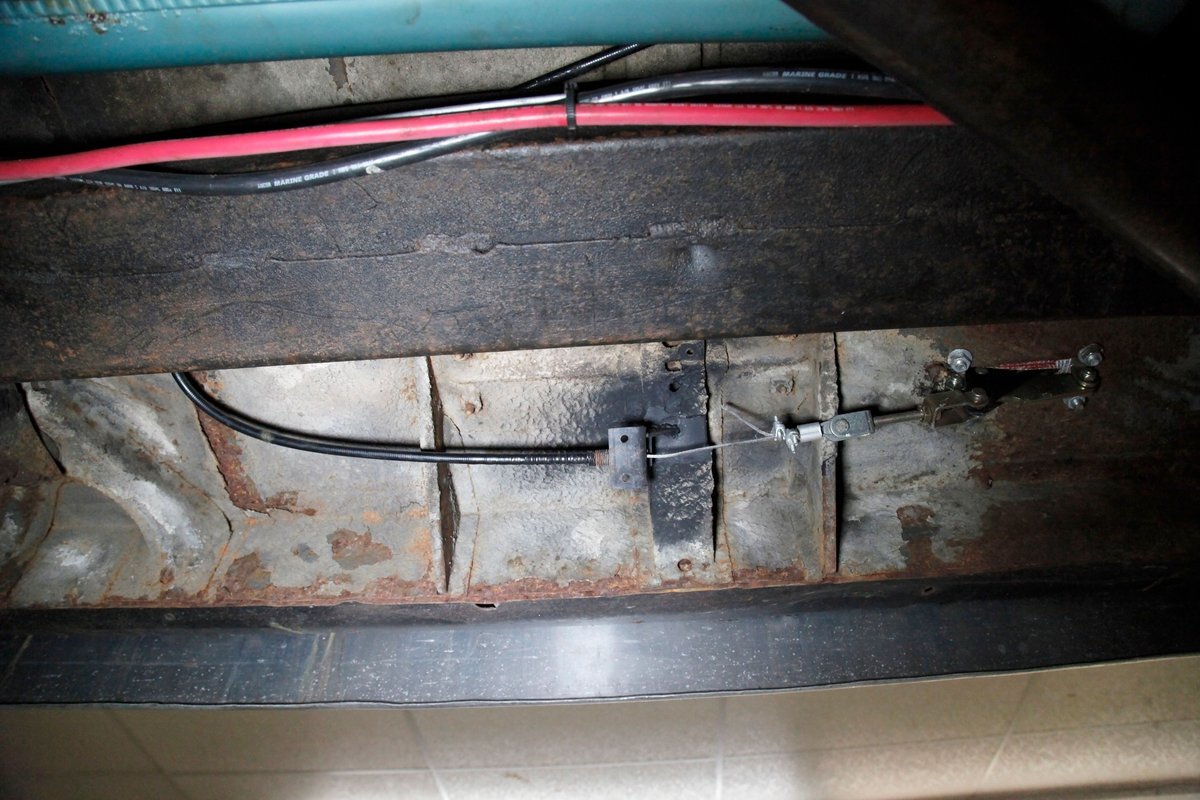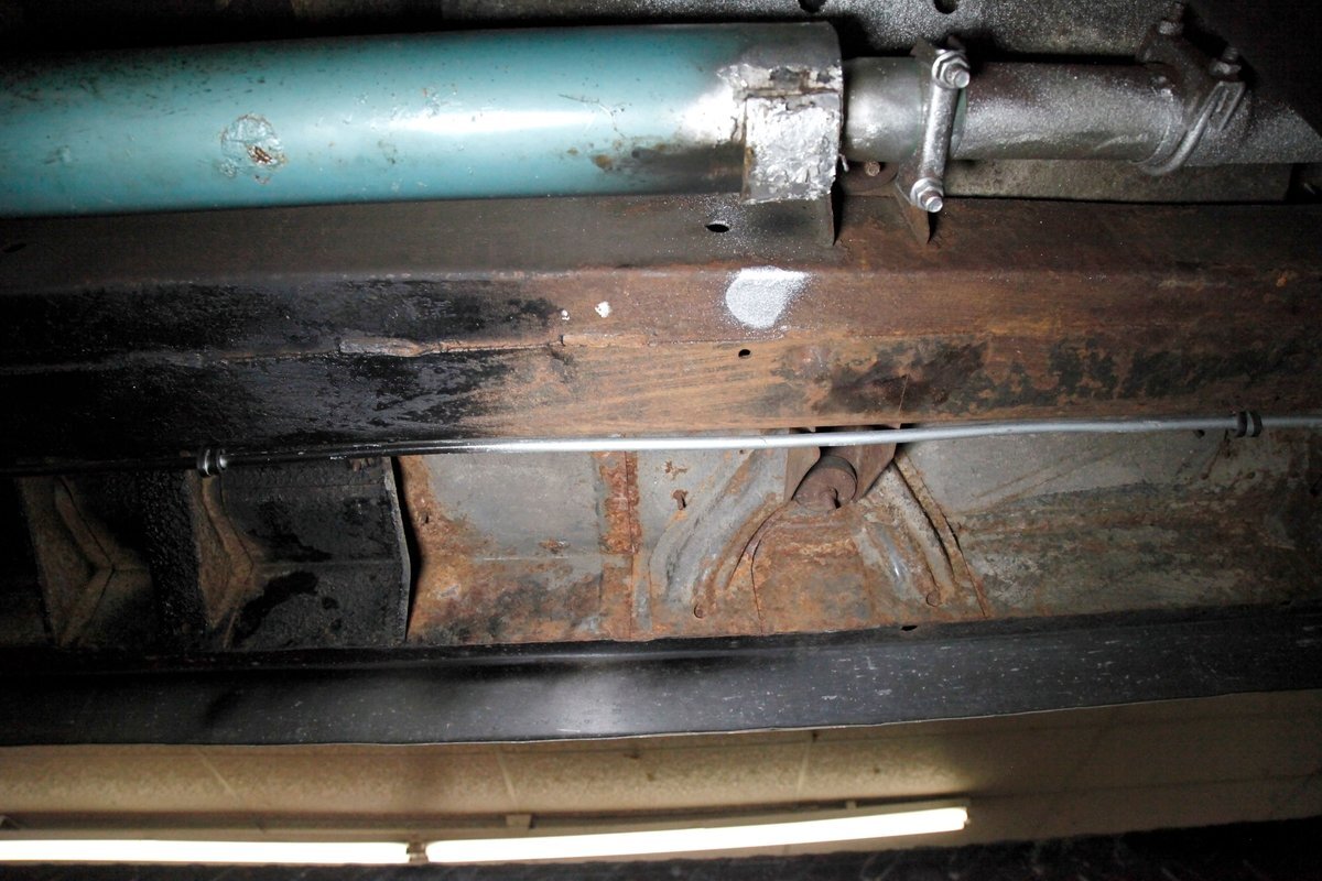 All built on a 1955 Chrysler chassis we see black heavily undercoated steel framing and floor pans. It does have a peppering of surface rust throughout. Independent coil springs are in front, and leaf springs oil back provide the ride. Power drum braking is all around and dual exhaust are noted featuring Smitty Mufflers.