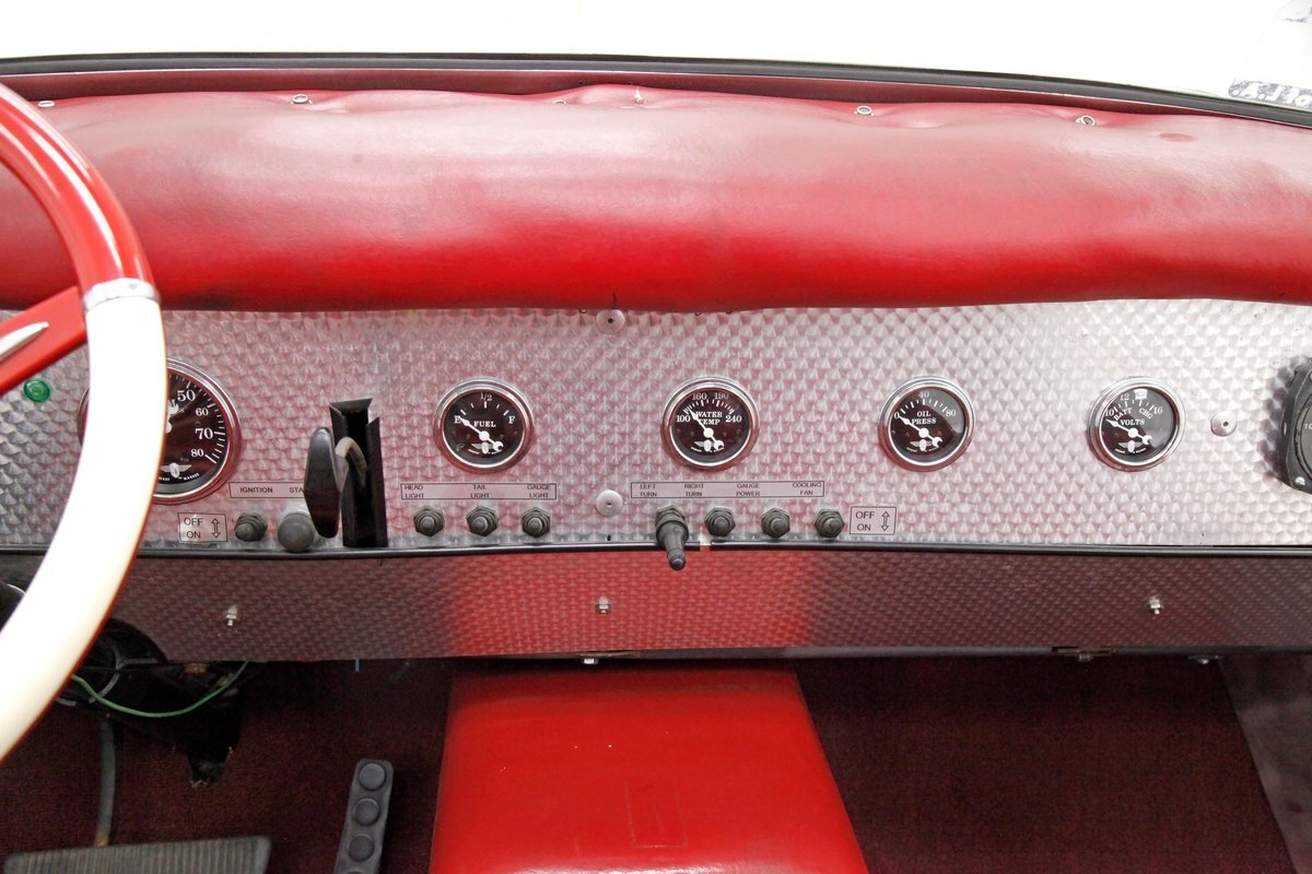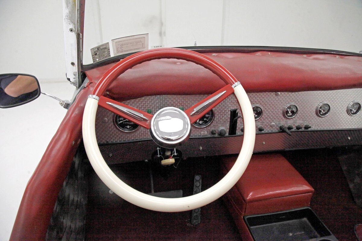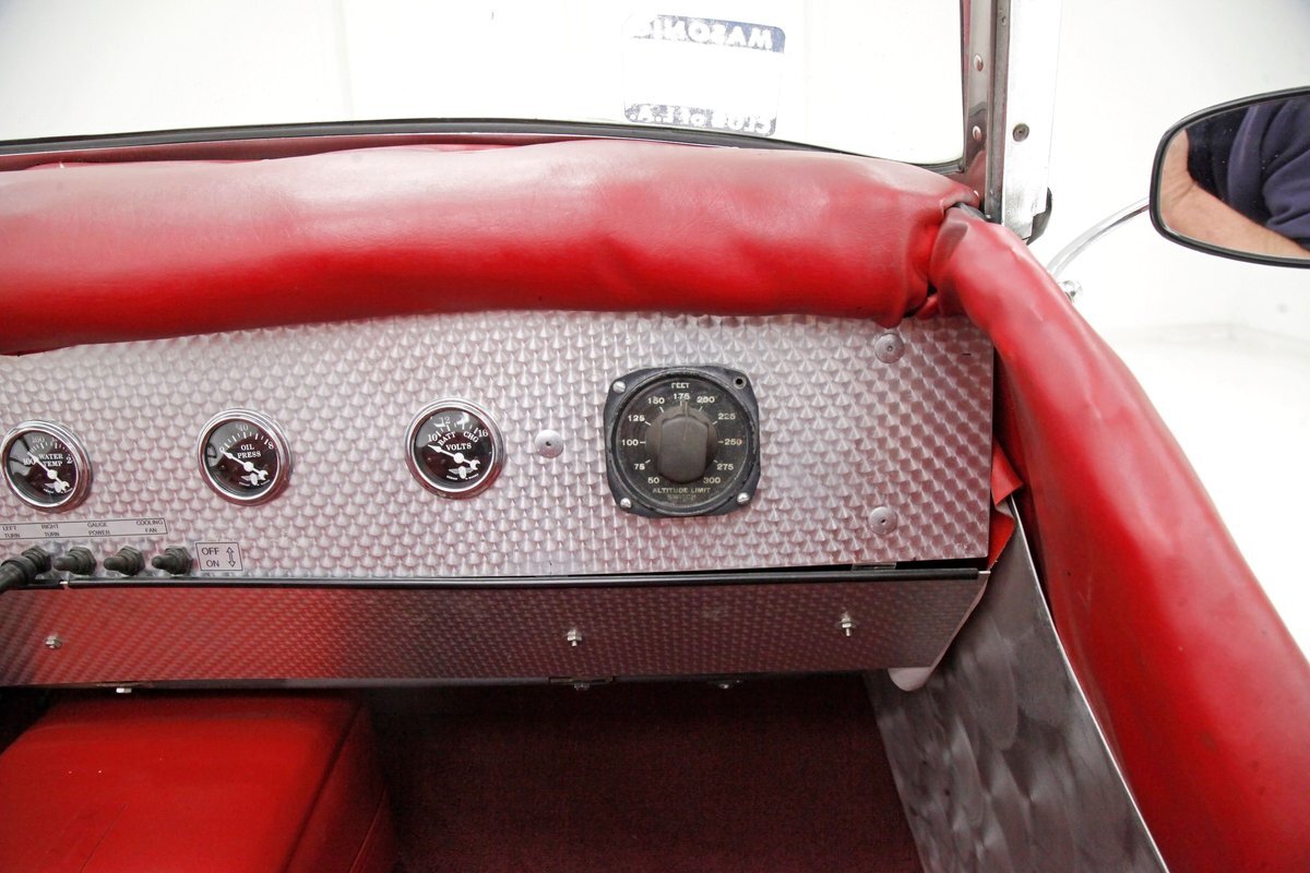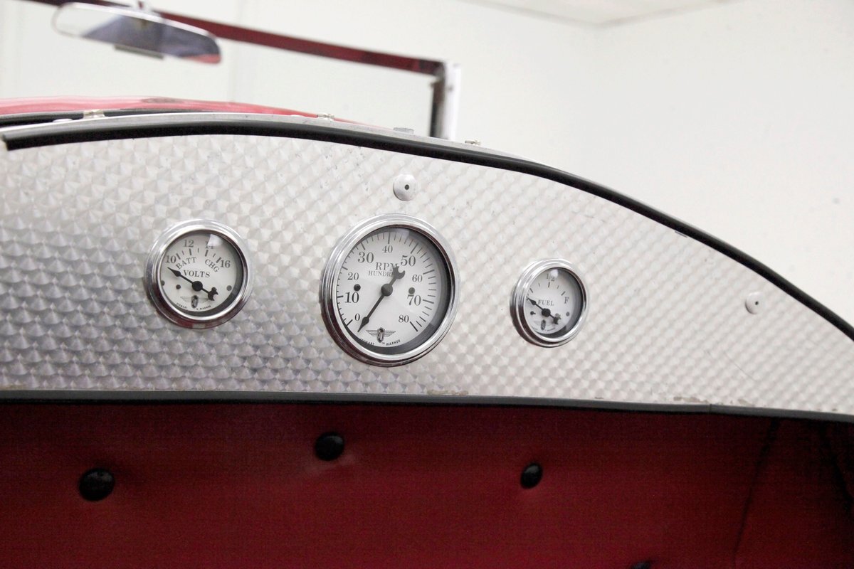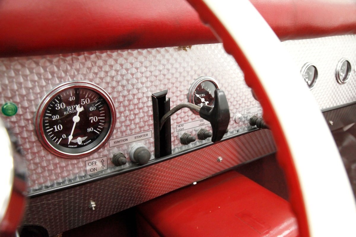 Taking a ride in this creation subjects you to the elements as there is no top. Just aircraft style seating with dual cockpits reminiscent of the Stearman biplanes of yore. Low back bomber style buckets, (fitting!), are in front facing the custom aluminum spun pattern dash. These chairs feature uppers with black tuck and roll and smooth red vinyl lowers. A large center console with a storage tray and cupholders is between the buckets. Padding covered in red vinyl lines the edges off the swooping down edged cockpit. That dash has blackface Stewart Warner black faced gauges with vintage looking pointers. A few additional knobs and toggles as well as some lights are inserted here as well. Fronting the dash is a vintage 50's styled steering wheel in white and red with a central chevron center. Red carpeting covers the floors. In the back, we can climb into a private full rounded back bench also in red vinyl with black tuck and roll toppers. The sides are also padded red vinyl but with no doors, it's a climb.